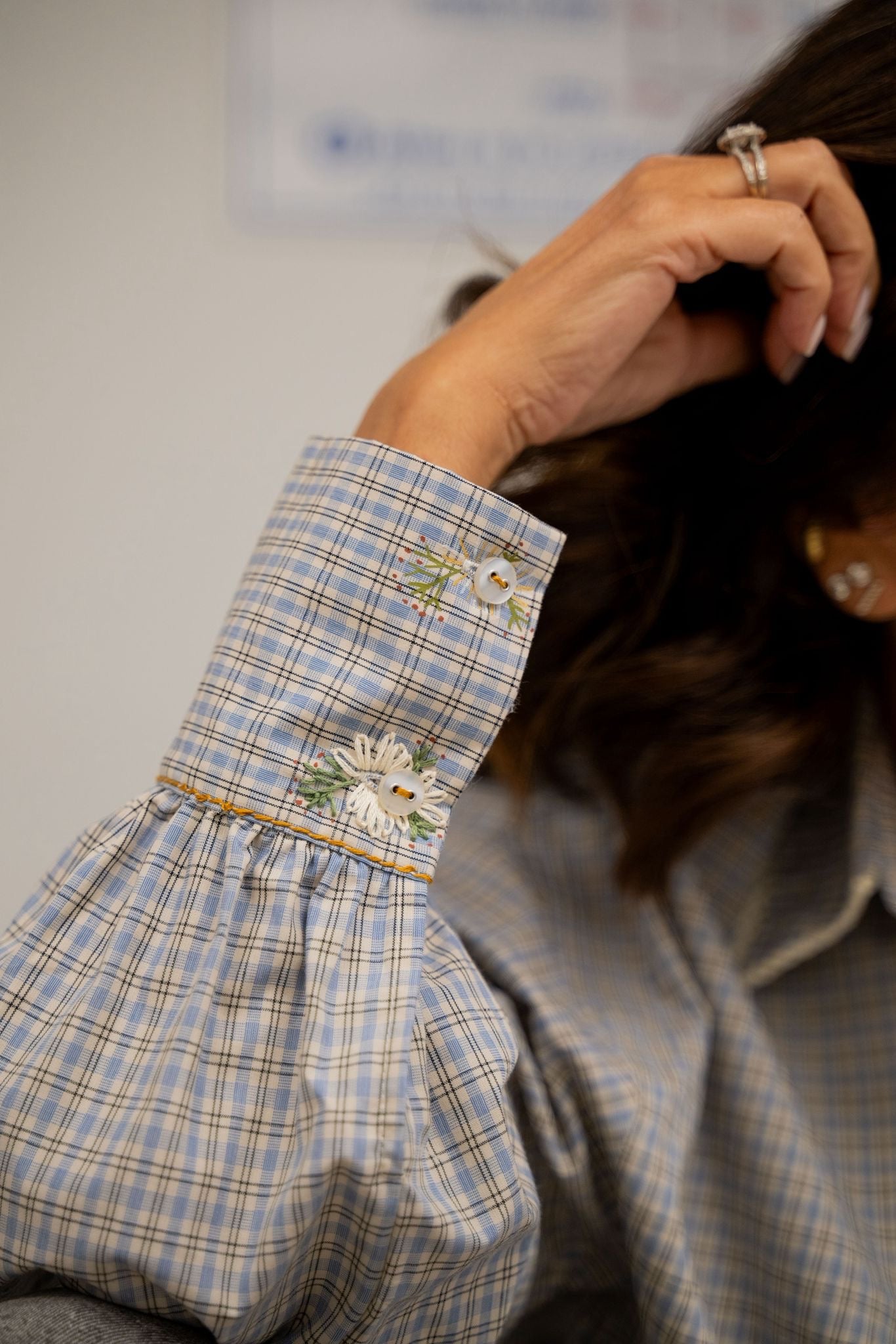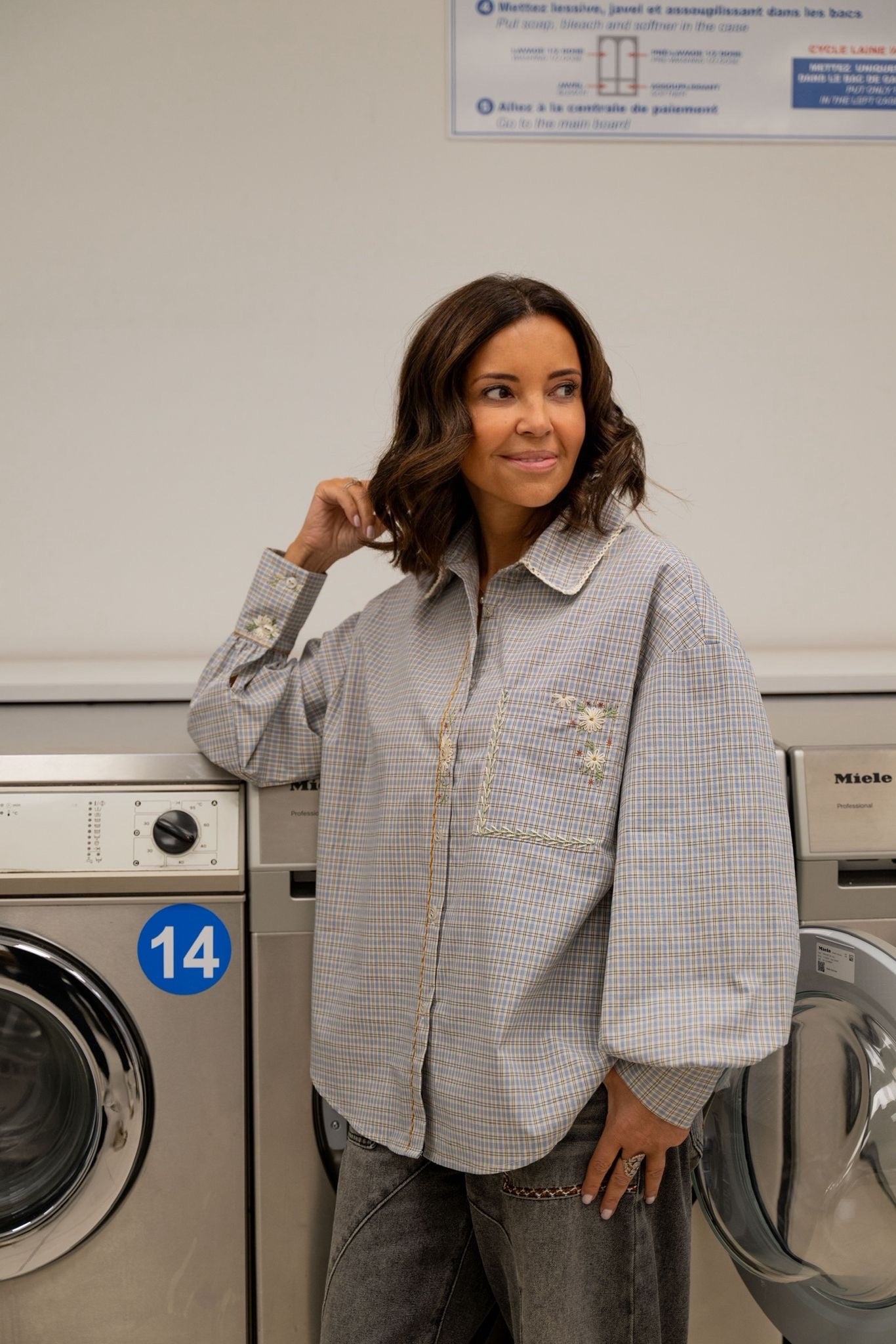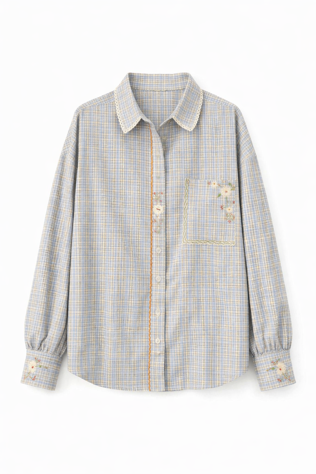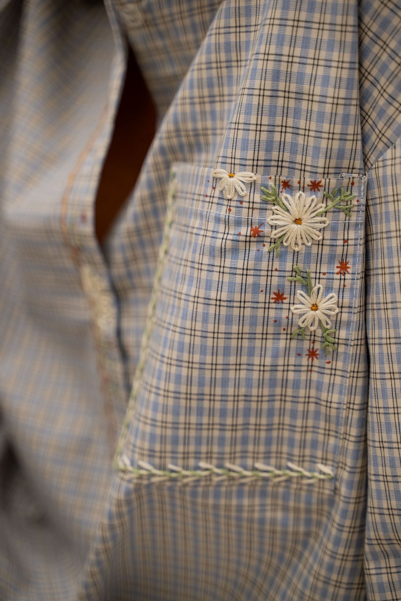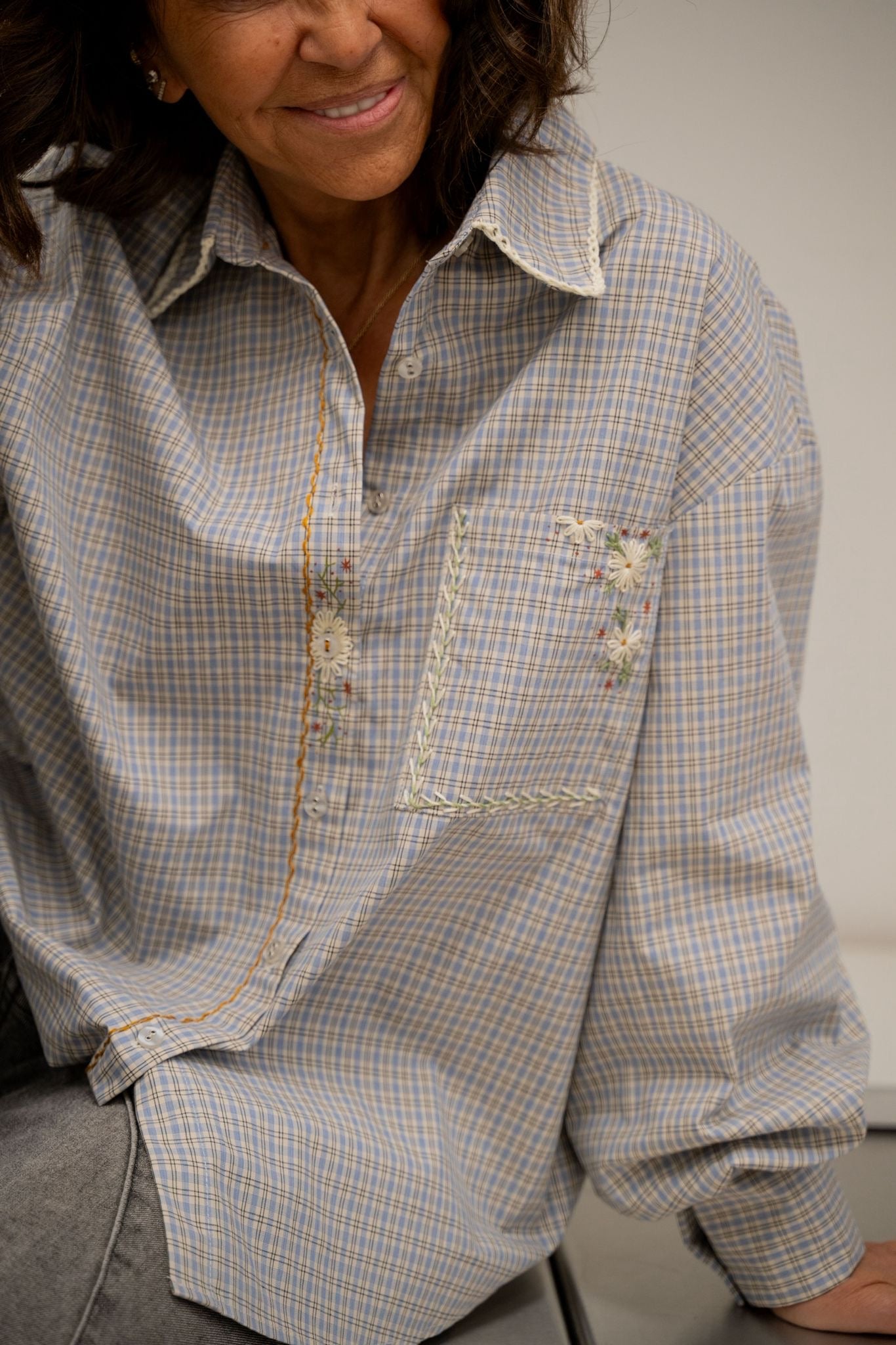 Chemise à carreaux au style bohème, entièrement travaillée à la main avec un subtil mélange de broderies, peinture textile et finitions en crochet. Le col crocheté apporte une touche délicate et originale qui distingue cette pièce unique.