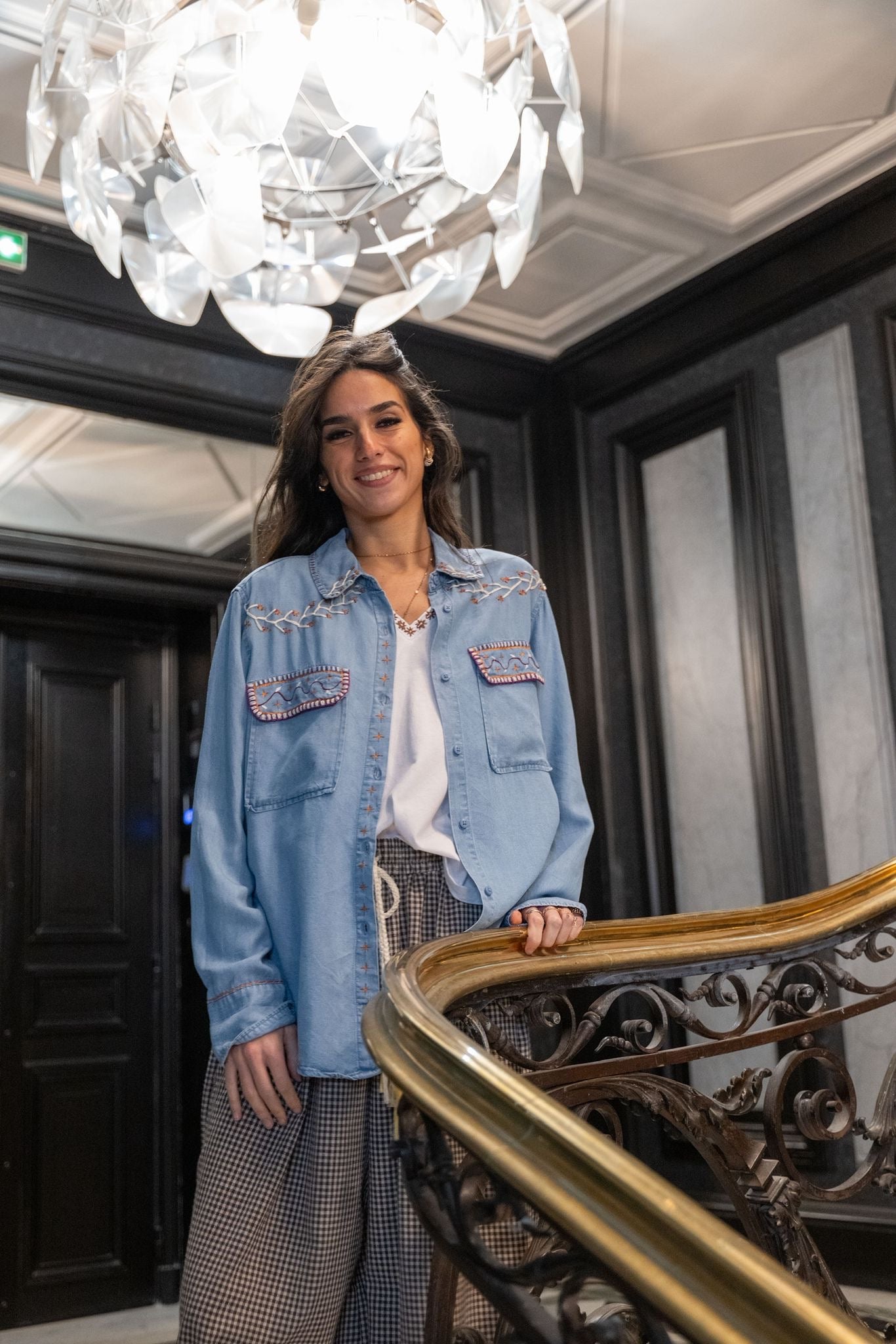 Chemise en lyocell, à la matière douce, fluide et agréable à porter, entièrement peinte et brodée à la main à Paris. Les broderies végétales au col et les détails graphiques sur la poitrine soulignent le savoir-faire artisanal et rendent chaque détail singulier. Pièce totalement unique, pensée comme une création à part entière, alliant confort, élégance et caractère.