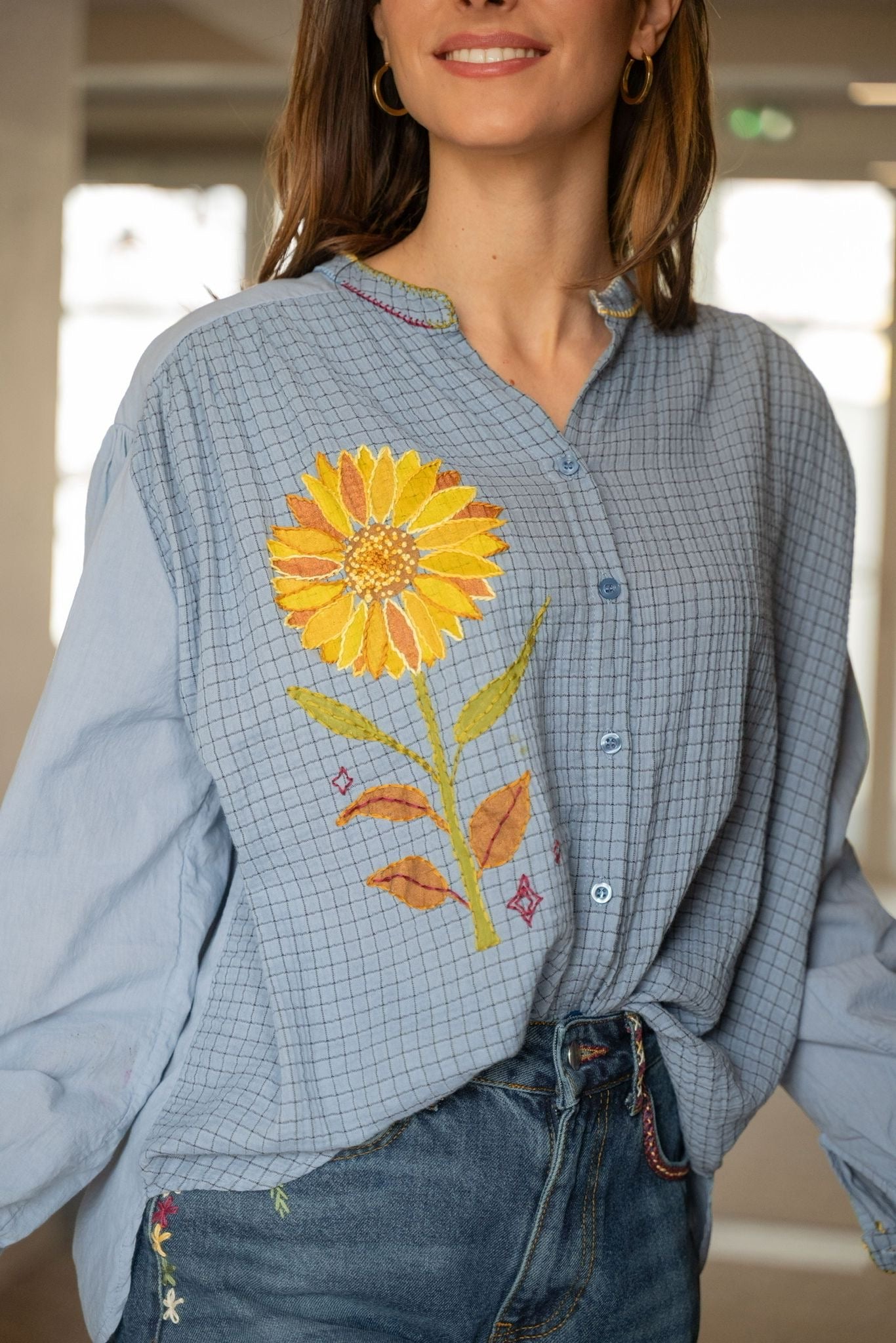 Blouse bleu clair à motif quadrillé, à la coupe fluide et confortable. Elle se distingue par sa broderie tournesol colorée sur la poitrine et ses détails de surpiqûres multicolores au col et aux manches, qui apportent une touche artisanale.