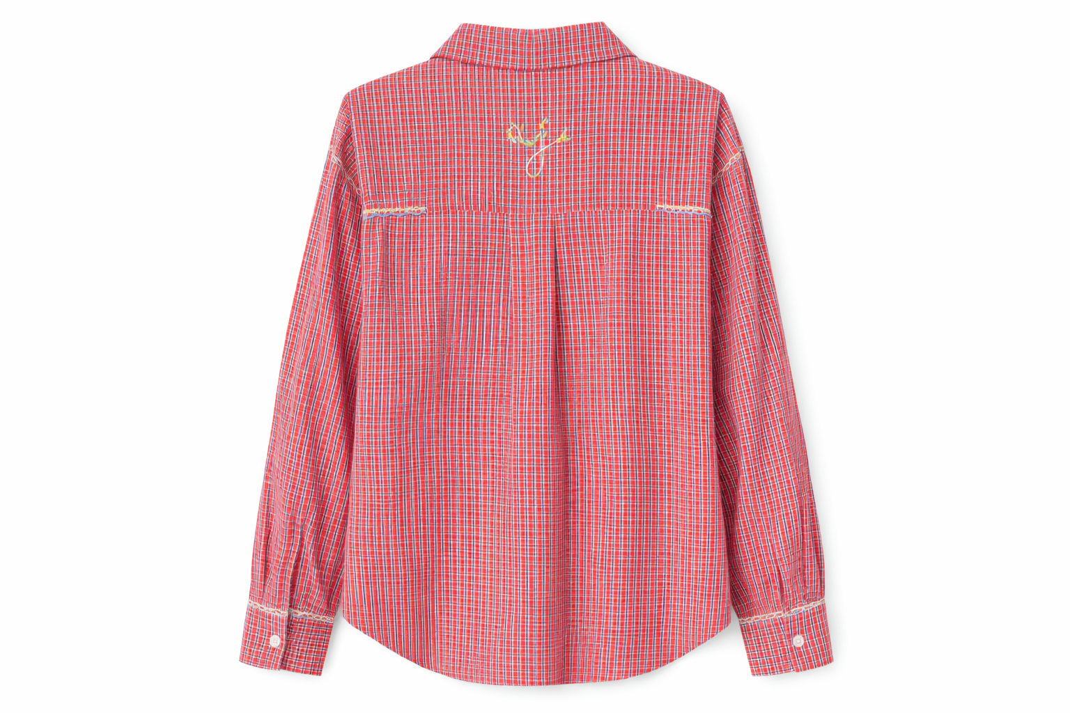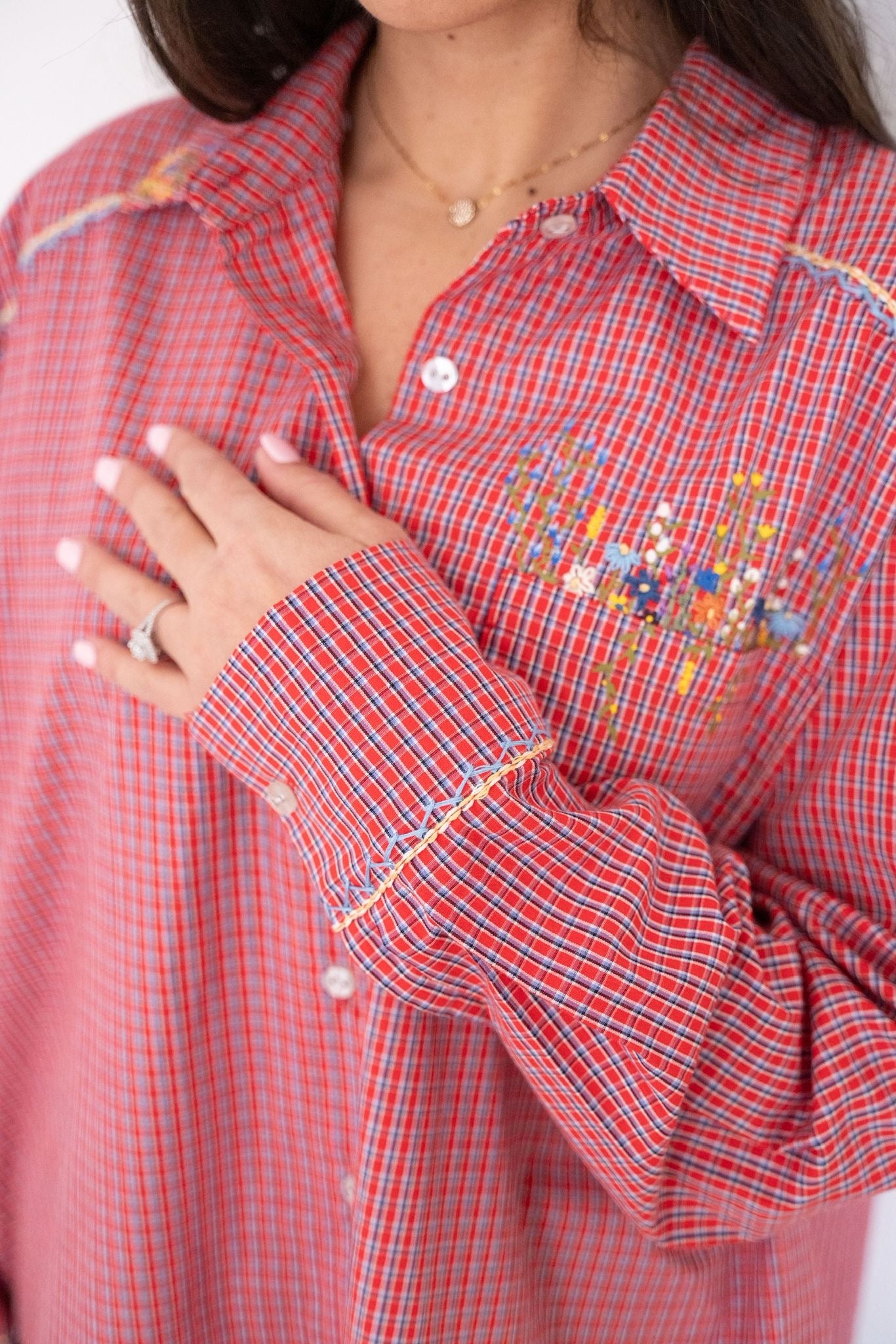 Chemise à motif carreaux rouges, à la coupe fluide et confortable, sublimée par un travail de broderie et de peinture textile réalisé à la main à Paris. Les motifs floraux brodés sur la poitrine et les épaules apportent relief et finesse à cette pièce au caractère affirmé. Une chemise singulière, facile à porter, qui revisite un classique avec subtilité.