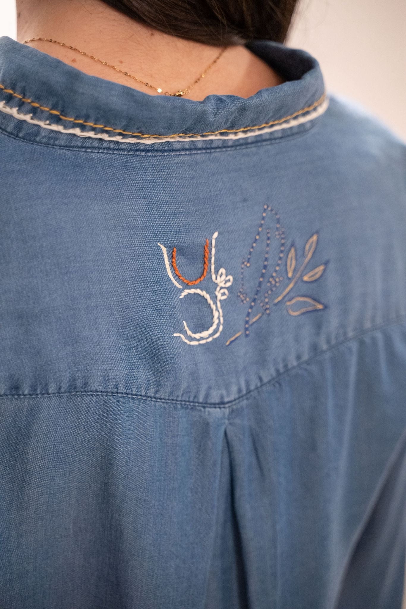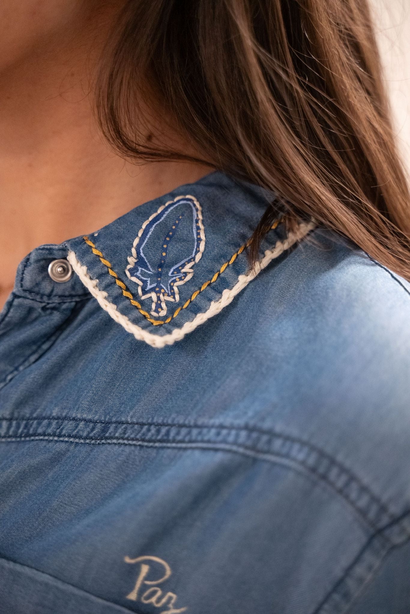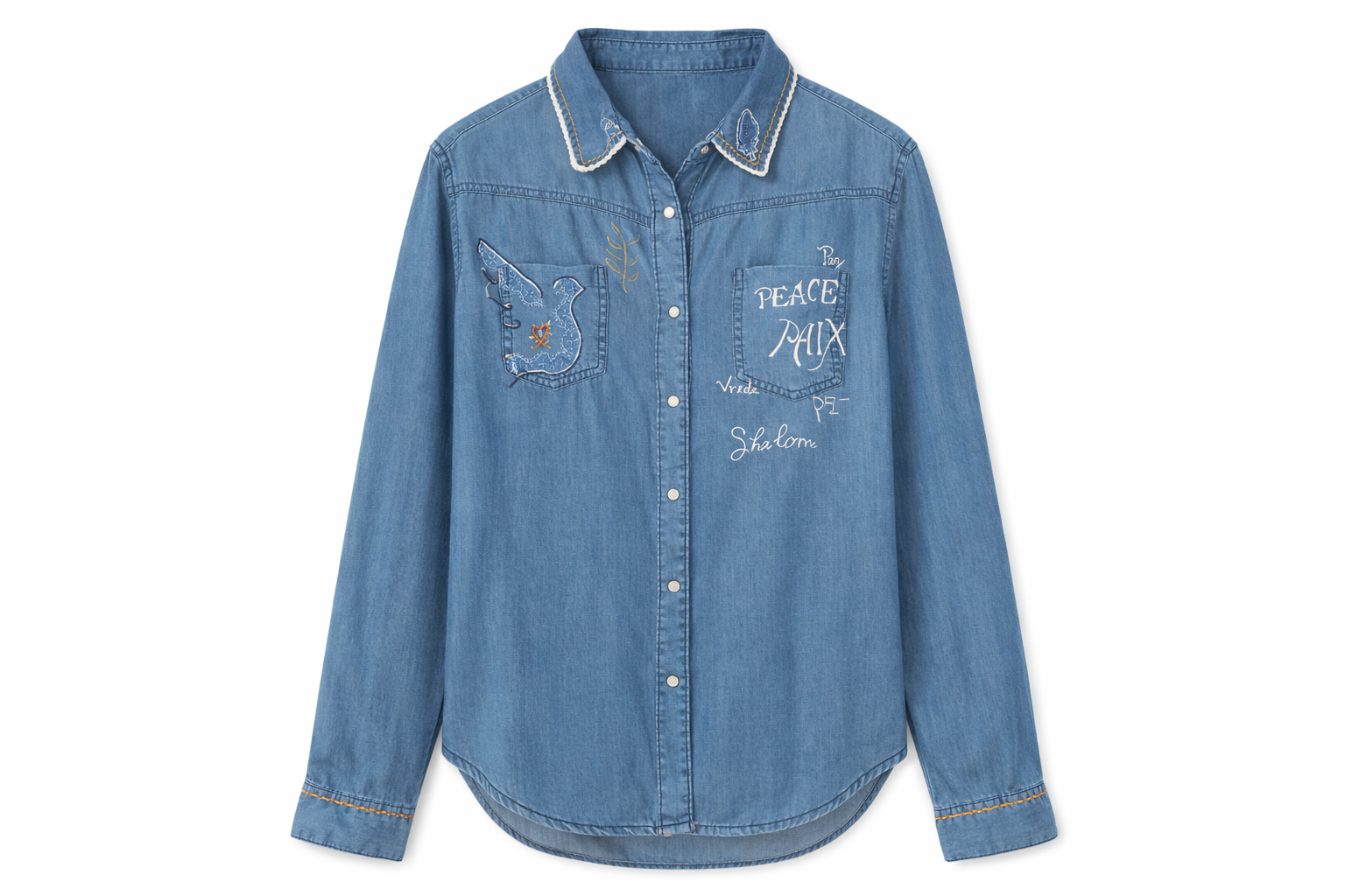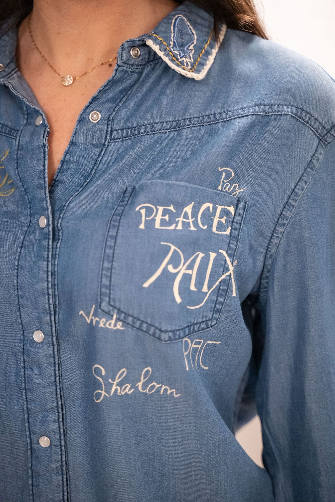 Chemise en coton 100 % naturel au denim souple et confortable, travaillée comme une véritable pièce d’art textile. Décors uniques mêlant broderie fine, détails en crochet et peinture à la main, avec motifs symboliques et messages de paix pour un style fort et authentique. Ce modèle est totalement unique — une chemise au caractère artisanal, idéale pour un look créatif et affirmé.