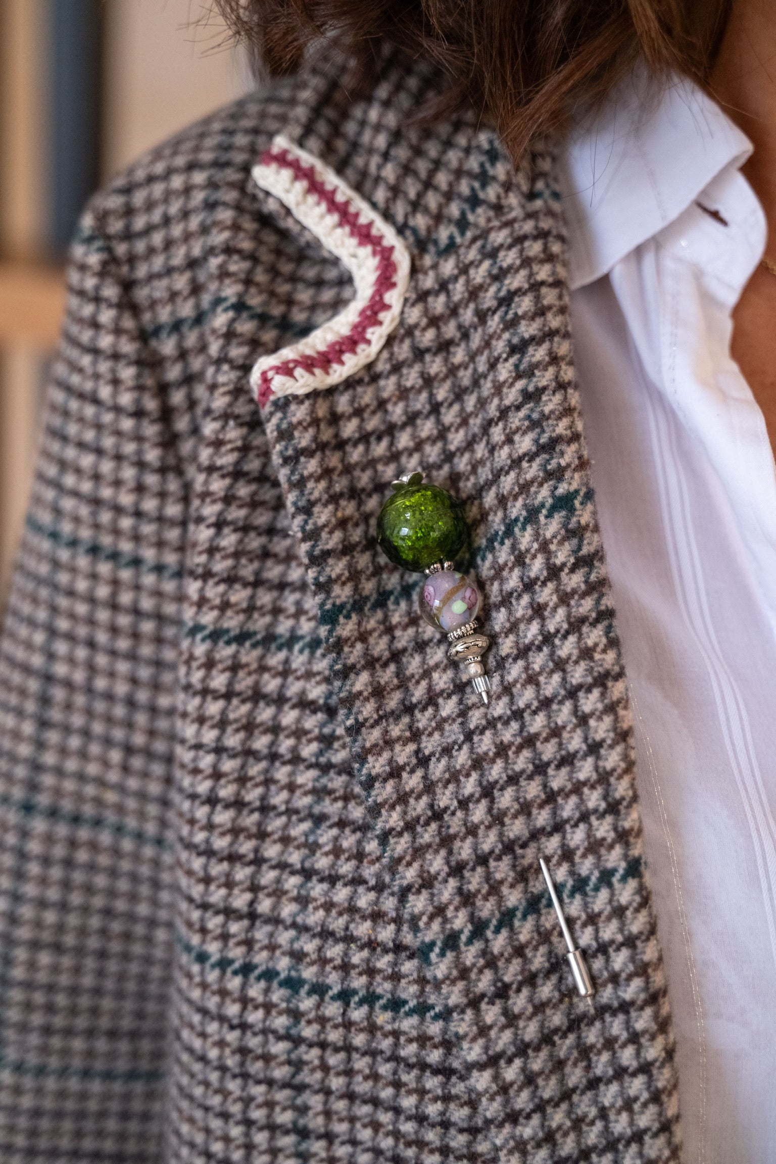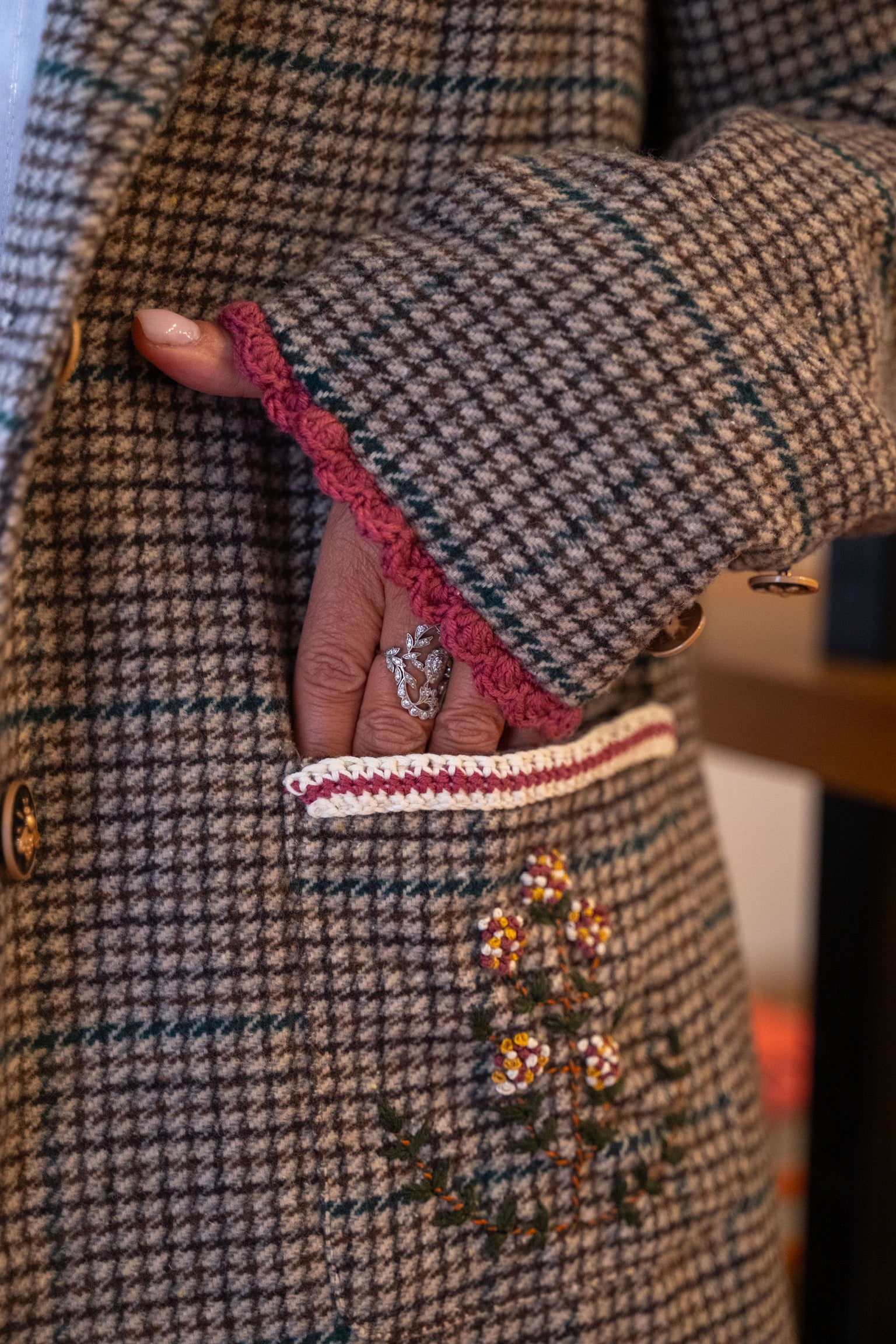 Blazer pied-de-poule marron revisité avec un mix de broderies, détails au crochet et bijoux décoratifs sur le col. Coupe structurée mais confortable, avec des finitions contrastées sur les poches et les poignets. Un modèle travaillé qui apporte une touche originale mais facile à porter.