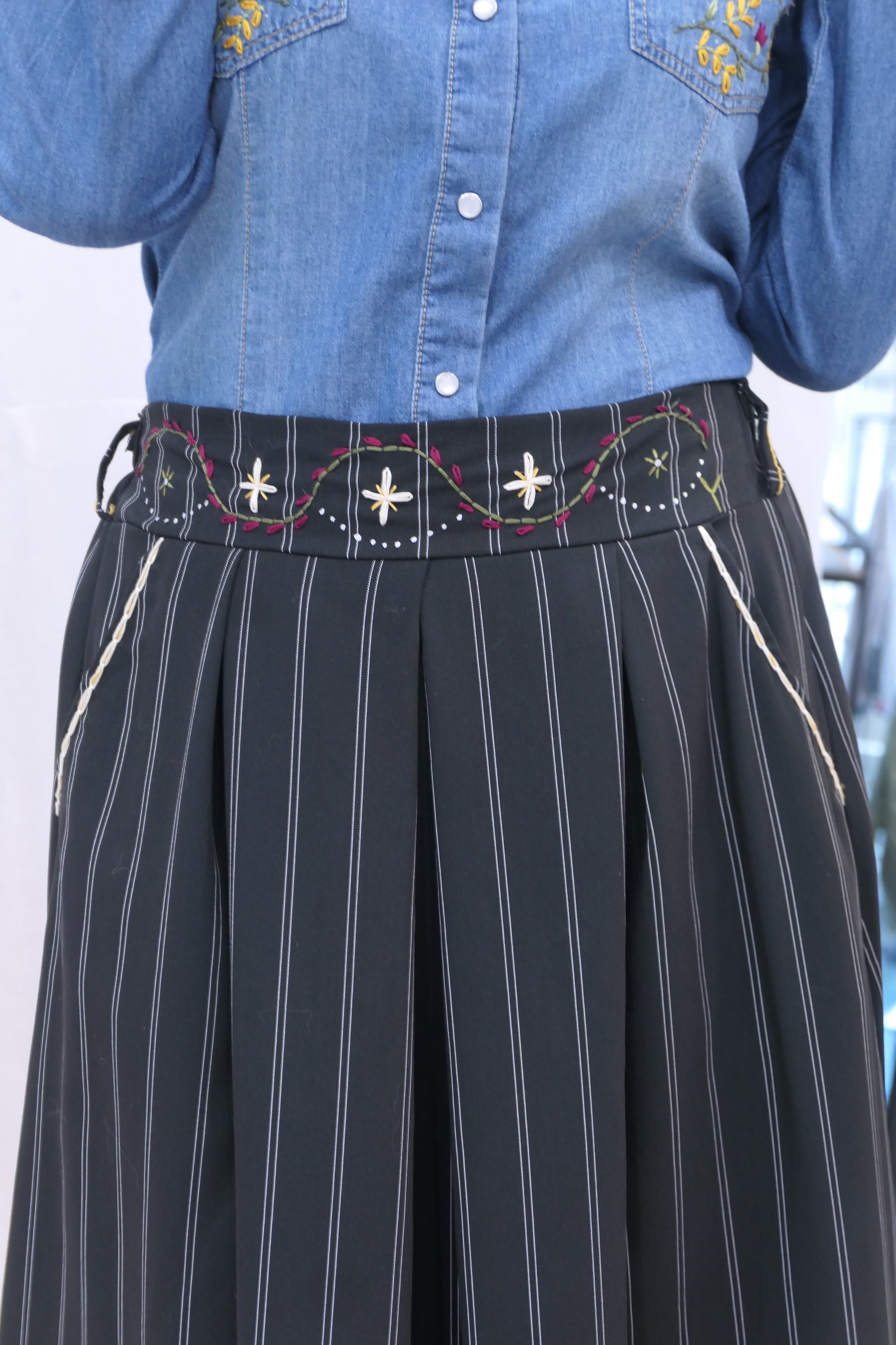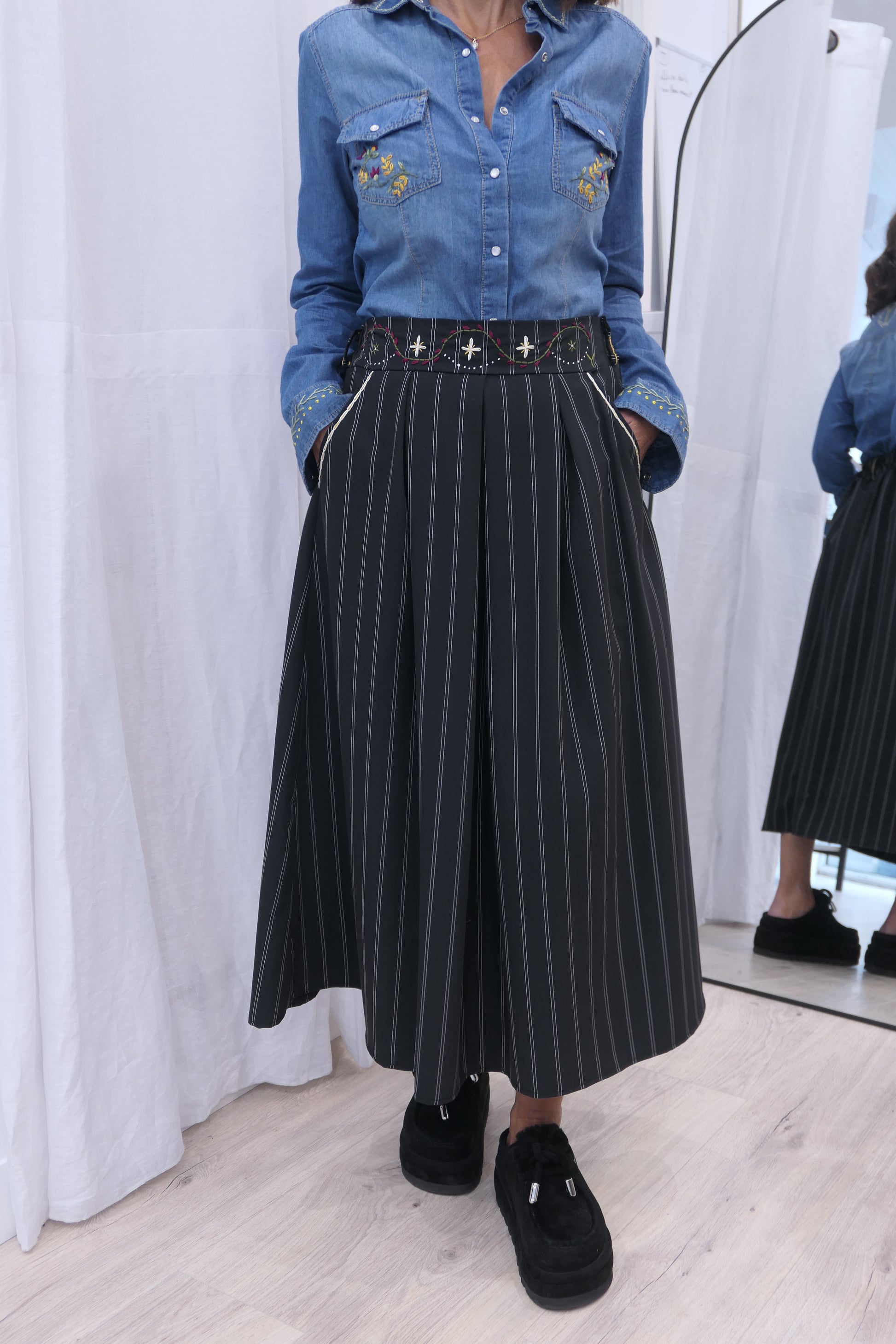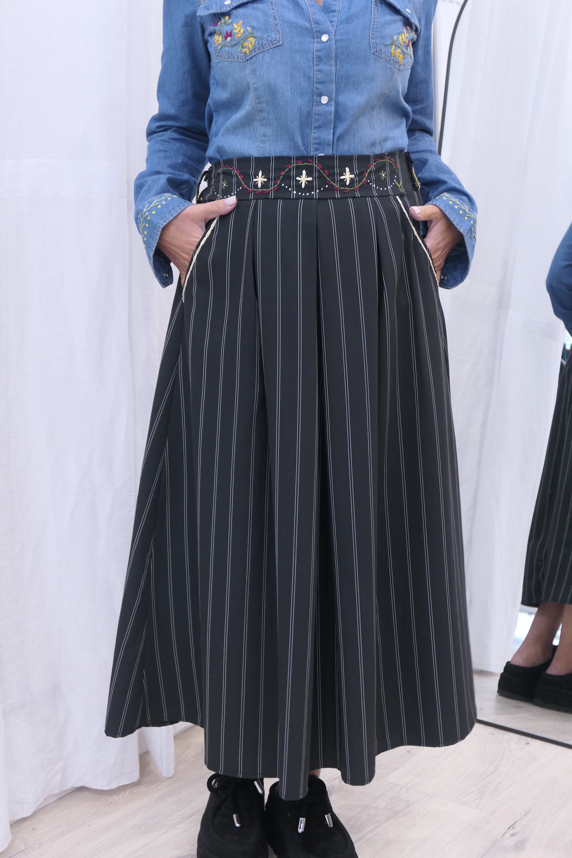 Jupe midi évasée avec taille brodée et fines rayures verticales. Coupe fluide, confortable et facile à porter au quotidien. Poches latérales avec liserés contrastés. Taille élastique au dos pour un ajustement confortable.