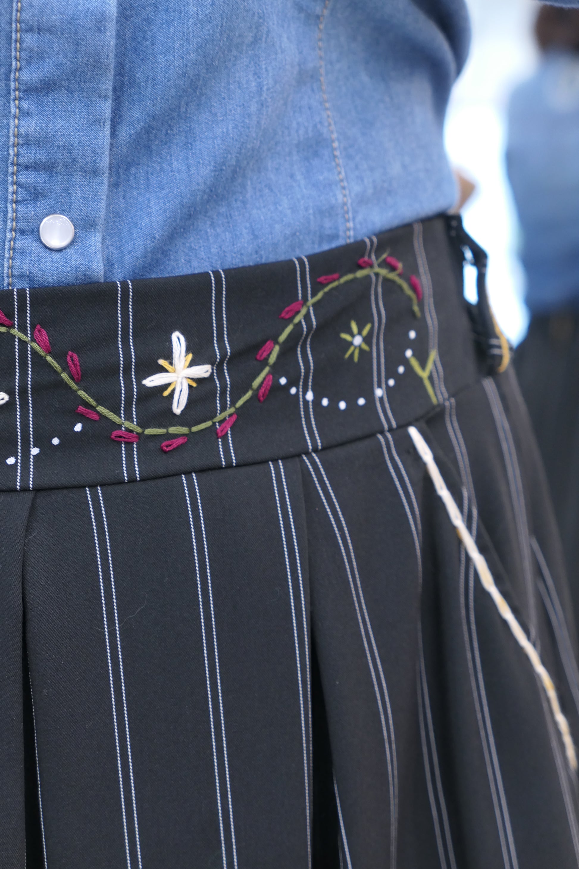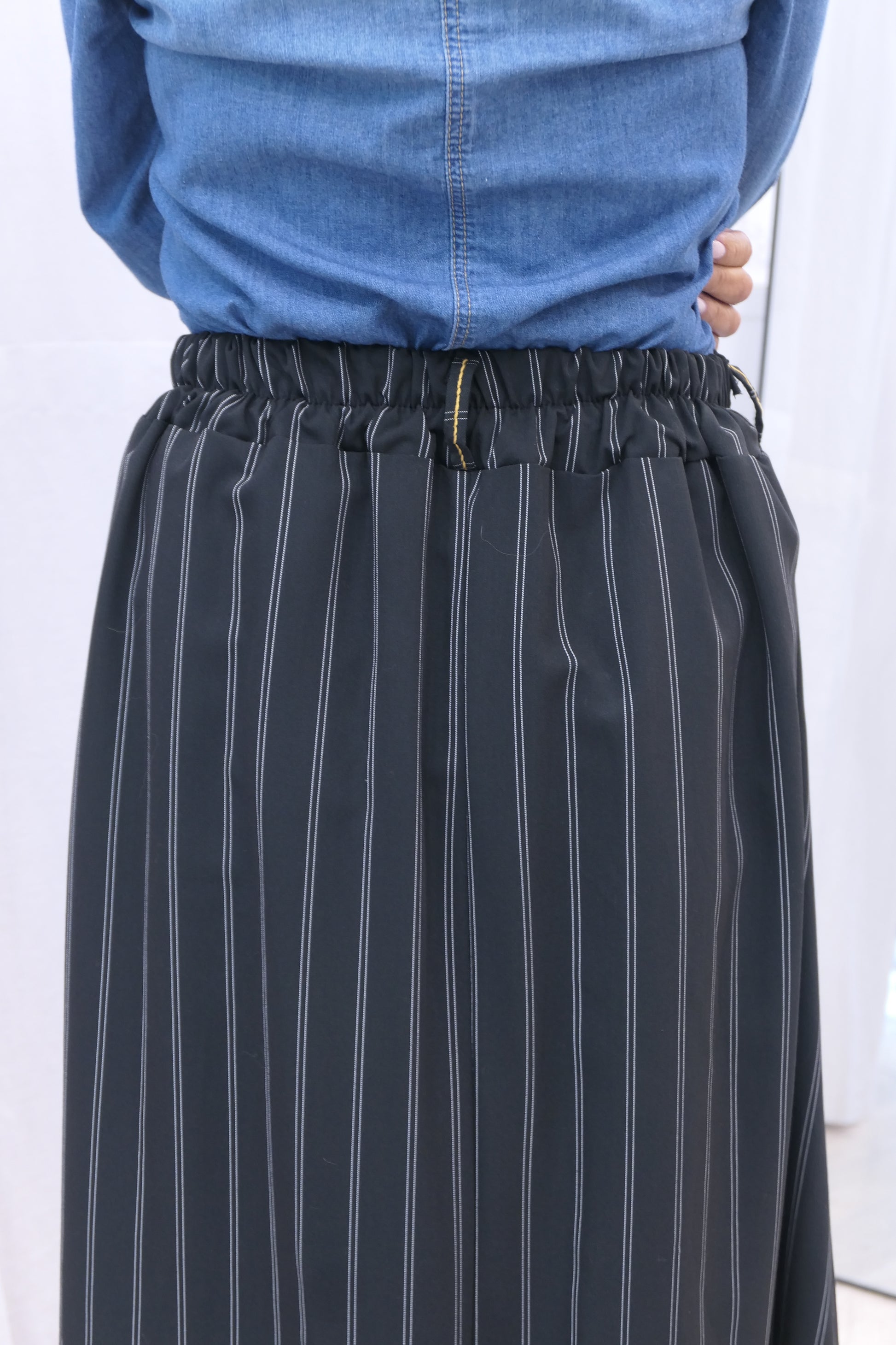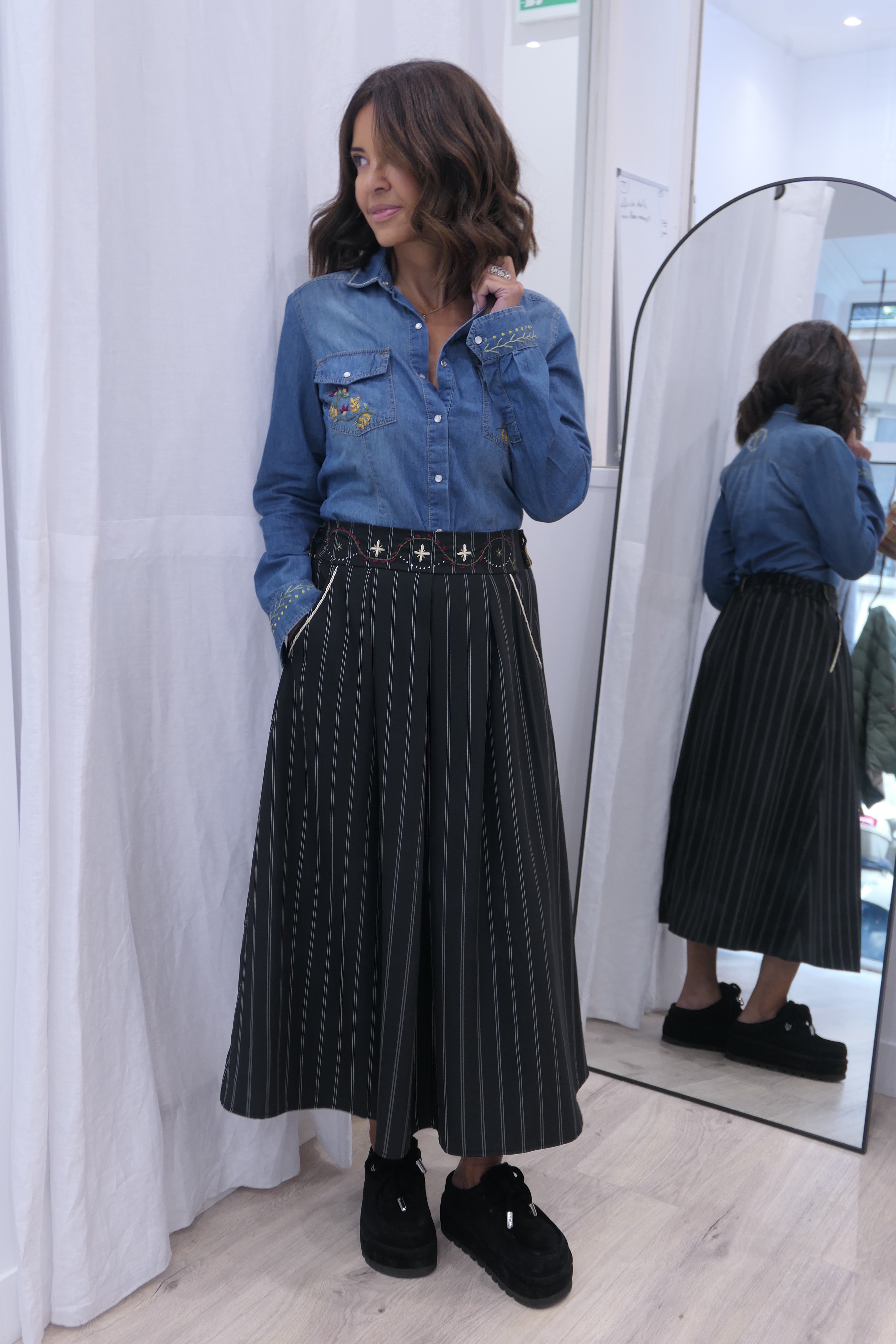 Jupe midi évasée avec taille brodée et fines rayures verticales. Coupe fluide, confortable et facile à porter au quotidien. Poches latérales avec liserés contrastés. Taille élastique au dos pour un ajustement confortable.