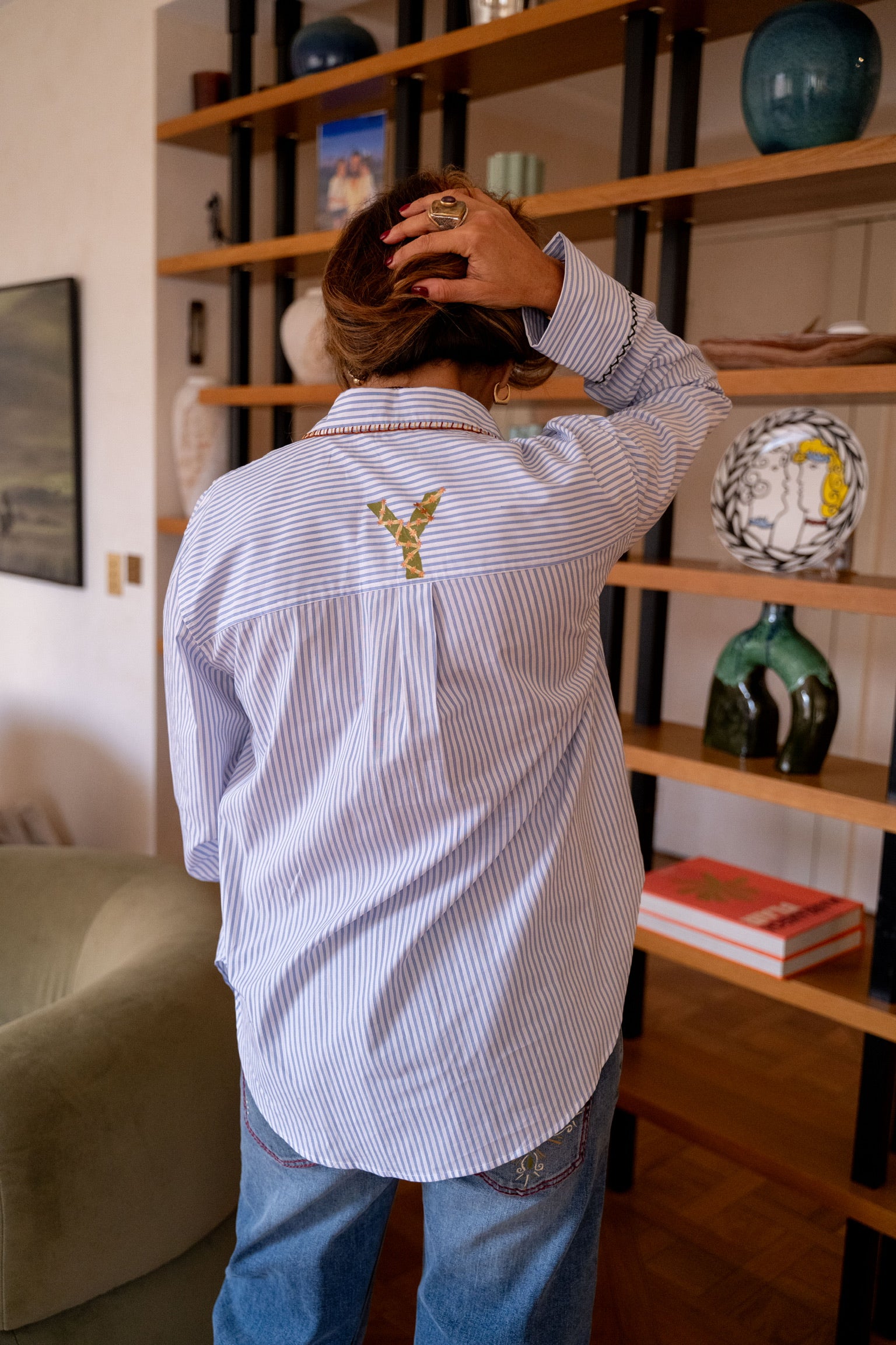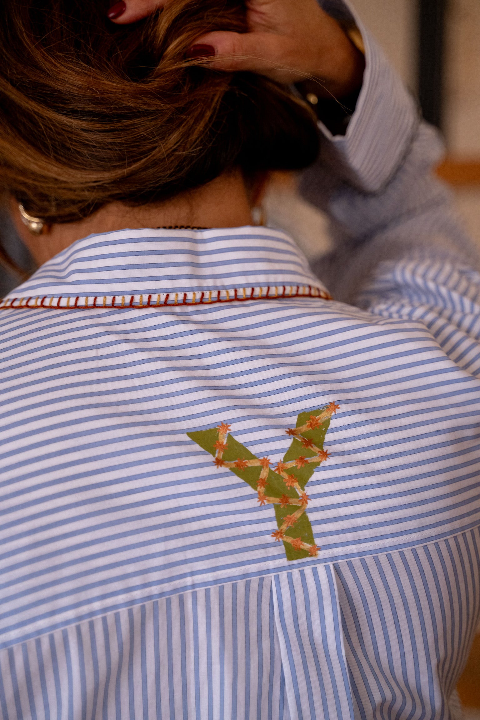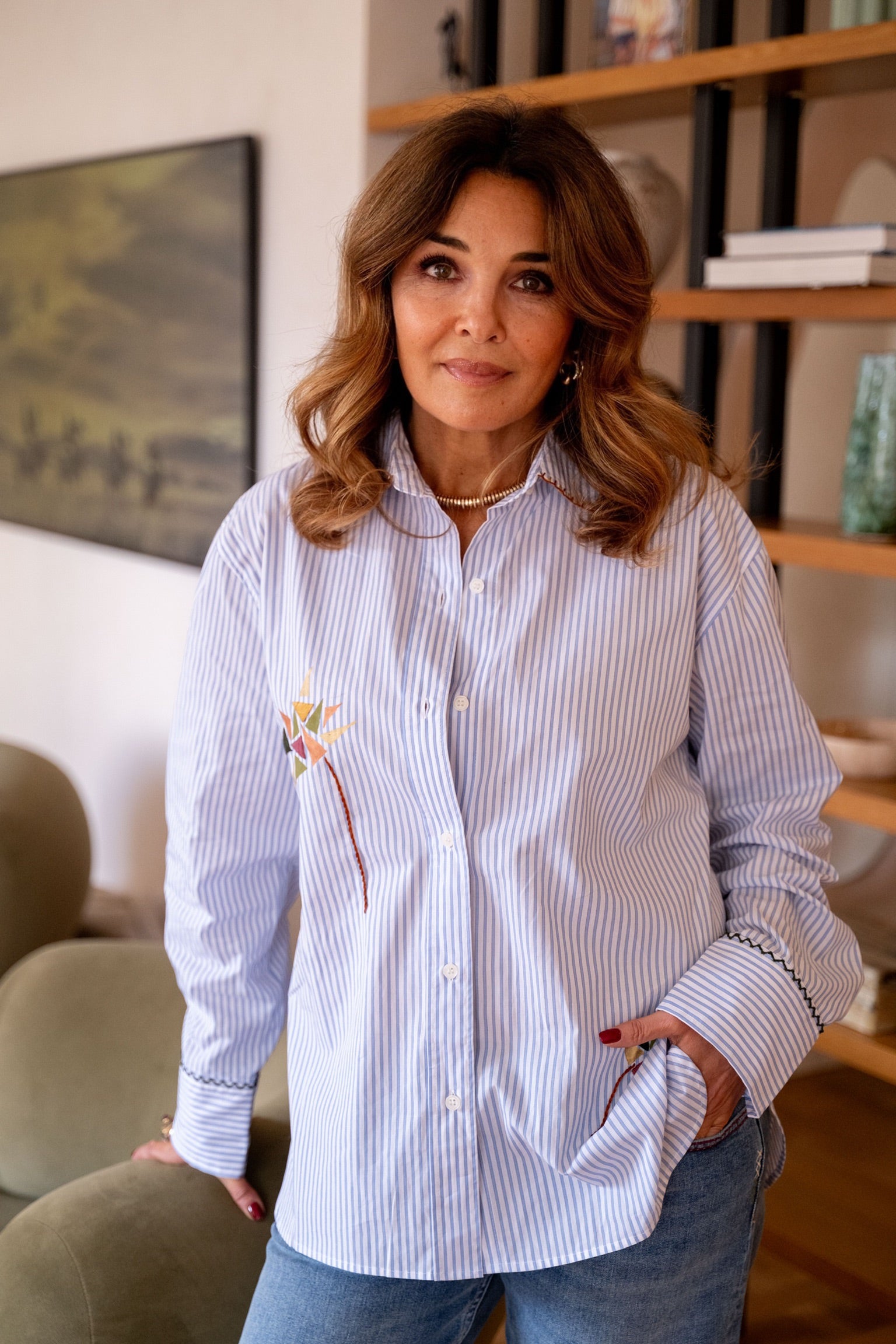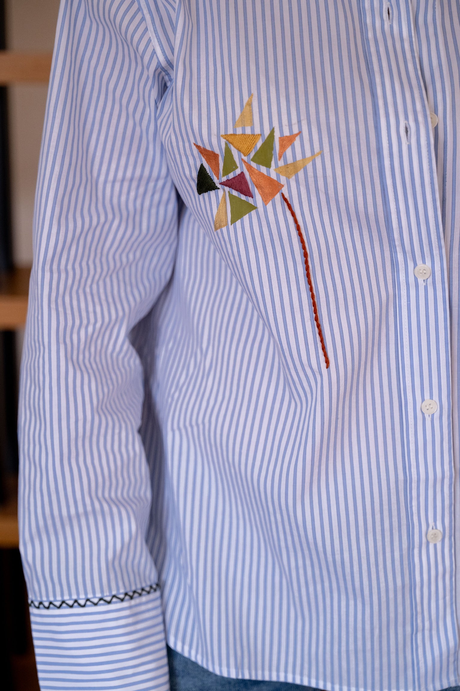 Chemise rayée bleu et blanche avec un mélange de broderies et de peinture. Coupe confortable et légèrement oversize. Détails élégants : broderies colorées façon motifs géométriques à l’avant et sur le bas, touches peintes, et finitions contrastées au col et aux poignets.
