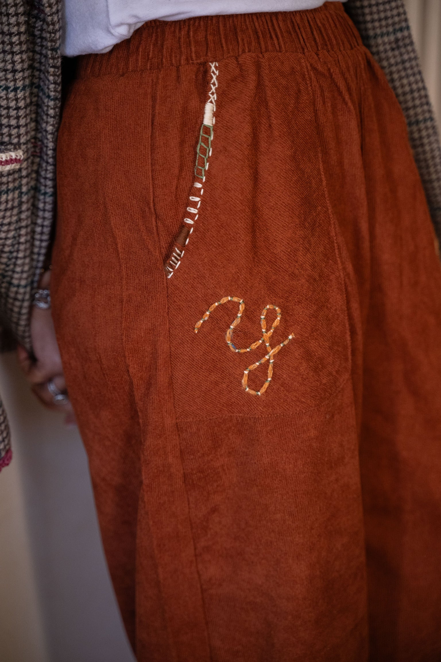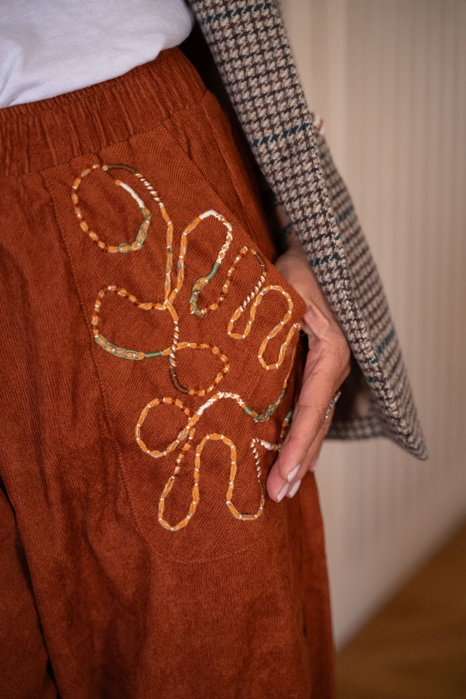 Pantalon en velours fluide terracotta, à mi-chemin entre le pantalon et le sarouel, orné de broderies mêlant du fils à brodé et de la laine pour un effet texturé sur la poche.
