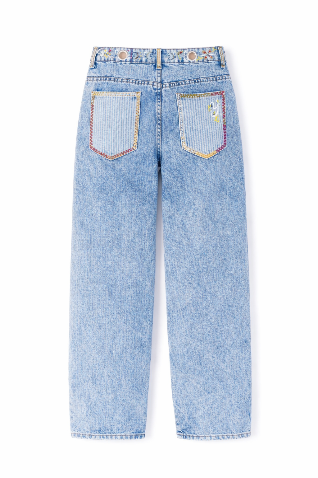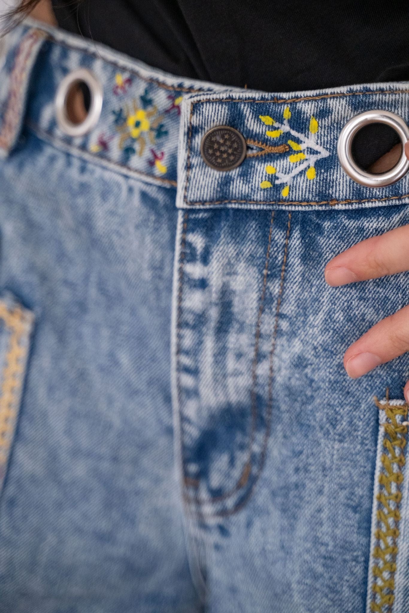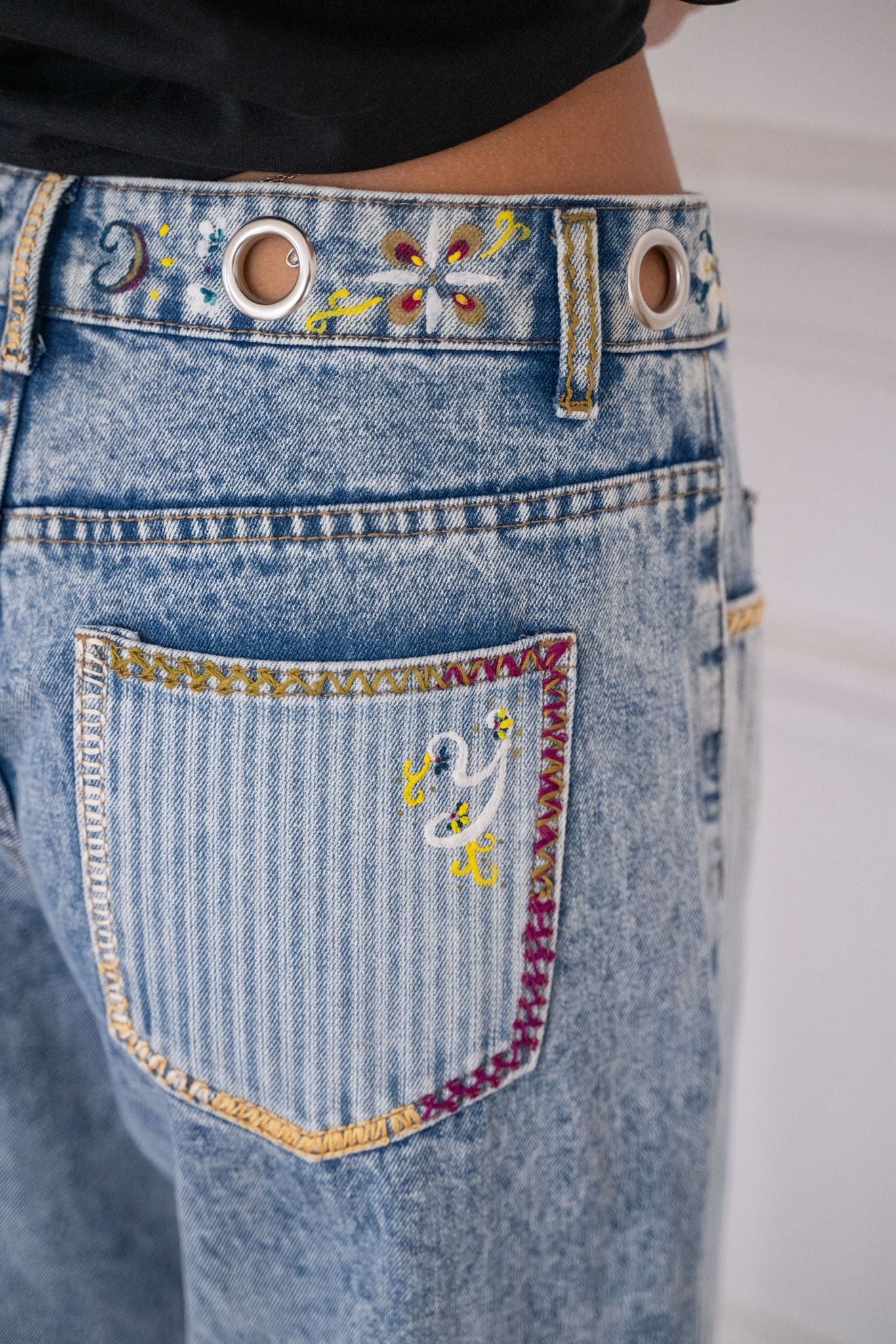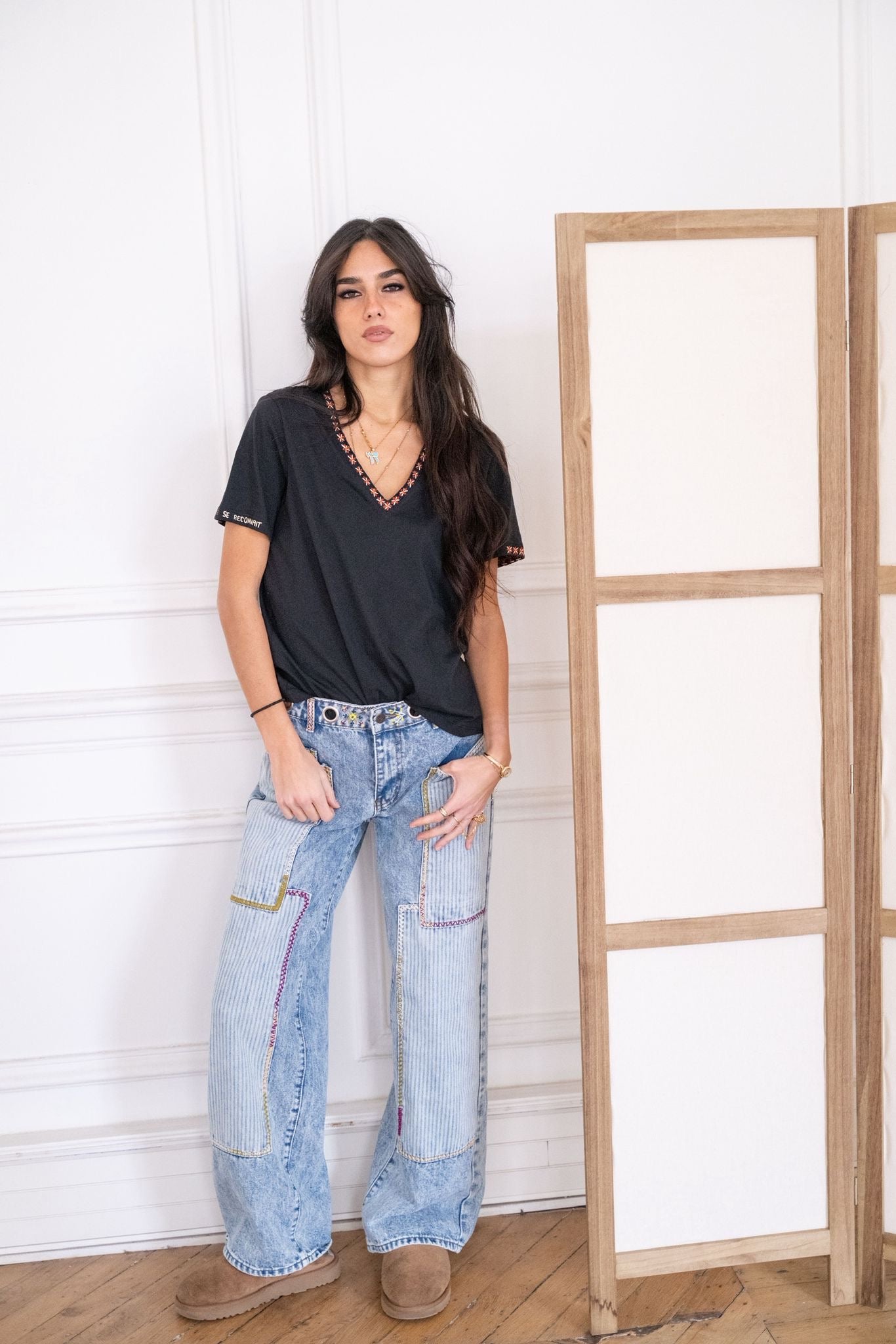 Jean à coupe droite, confortable et structurée, rehaussé d’empiècements en jean ornés de broderies et de peinture textile réalisées à la main à Paris. Les jeux de matières et de surpiqûres apportent relief et caractère à la pièce, tout en conservant un porté naturel et facile au quotidien.