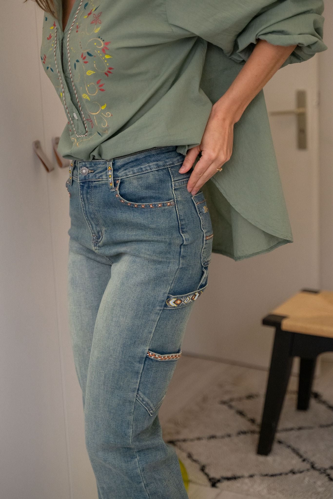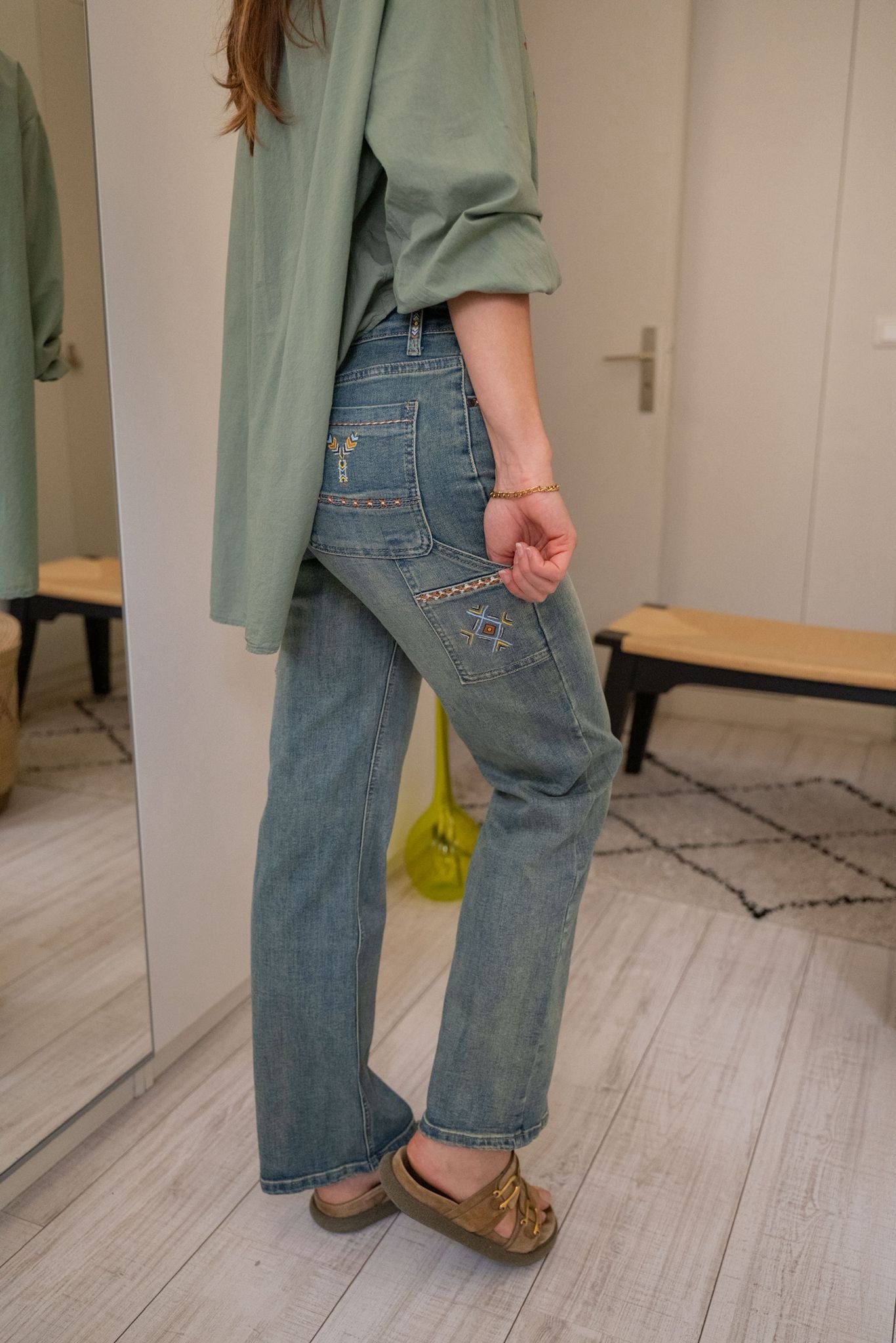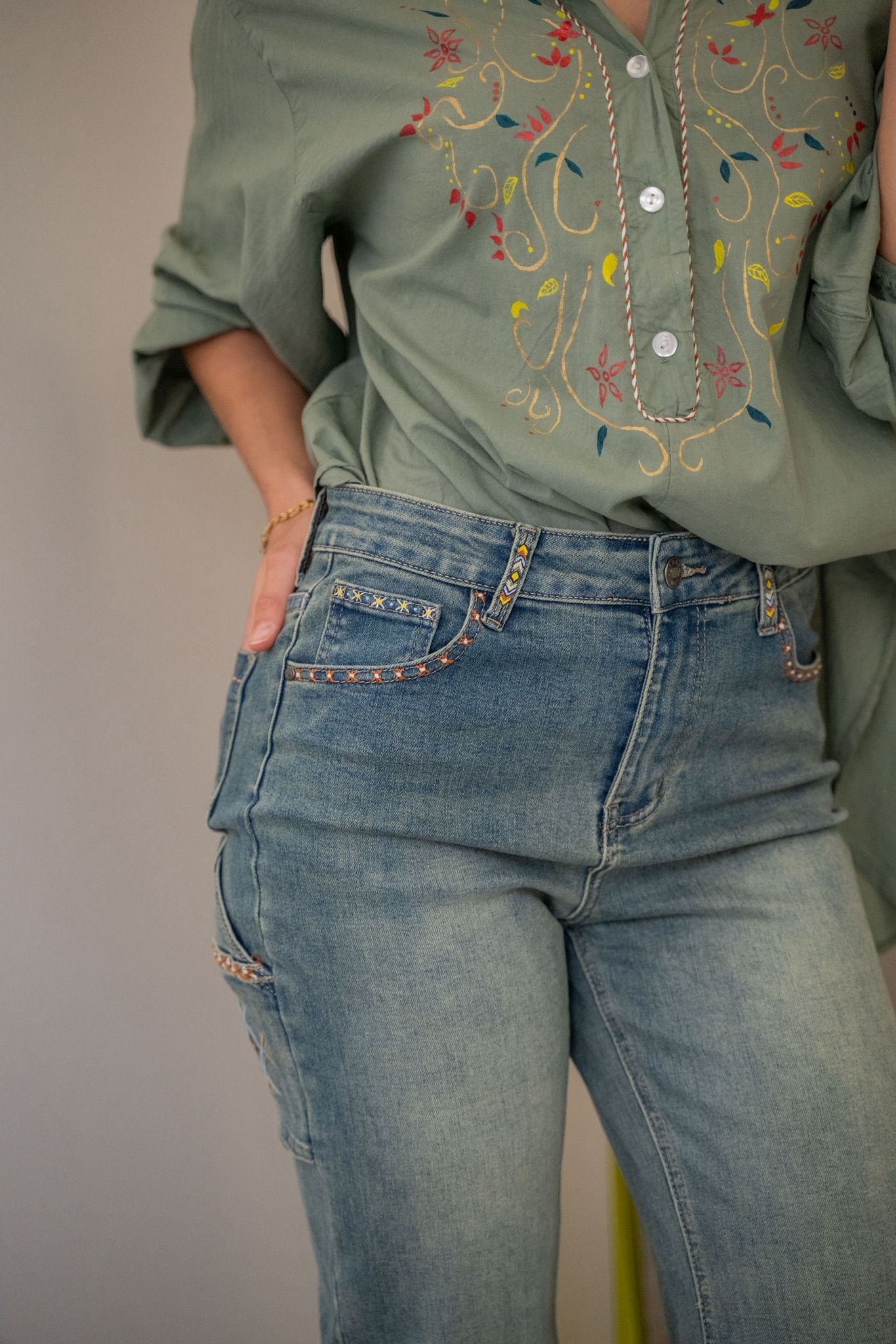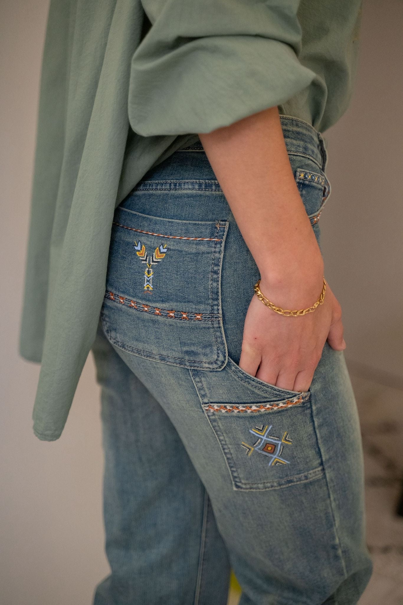 Jean coupe droite revisité avec une touche artisanale, alliant authenticité et modernité. Confectionné dans une toile denim légèrement délavée, il se distingue par ses broderies géométriques colorées délicatement placées sur les passants, les poches et les finitions. Sa coupe intemporelle assure un tombé naturel et confortable, tandis que les détails faits main apportent du caractère à la pièce. Un essentiel revisité, parfait pour un look casual avec une vraie signature stylistique.✨