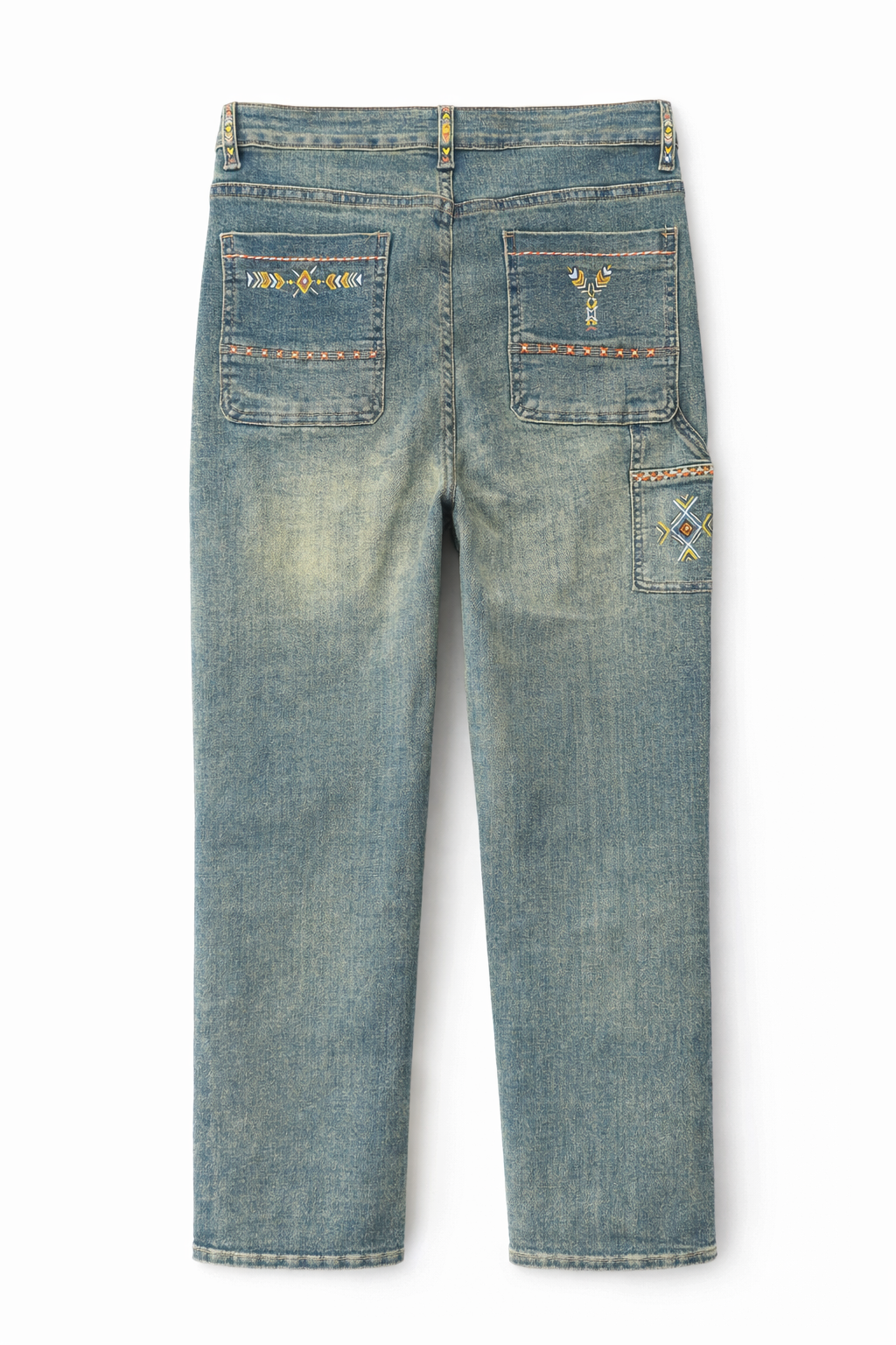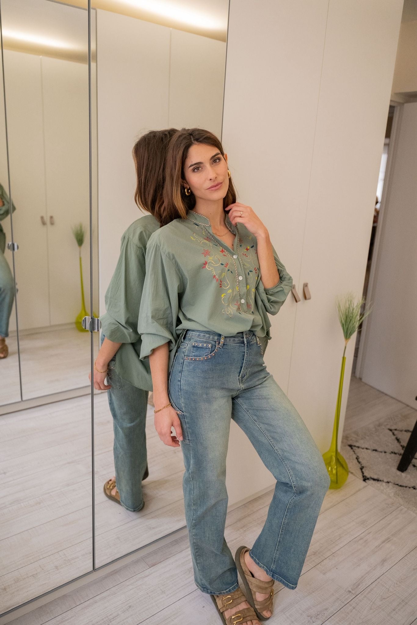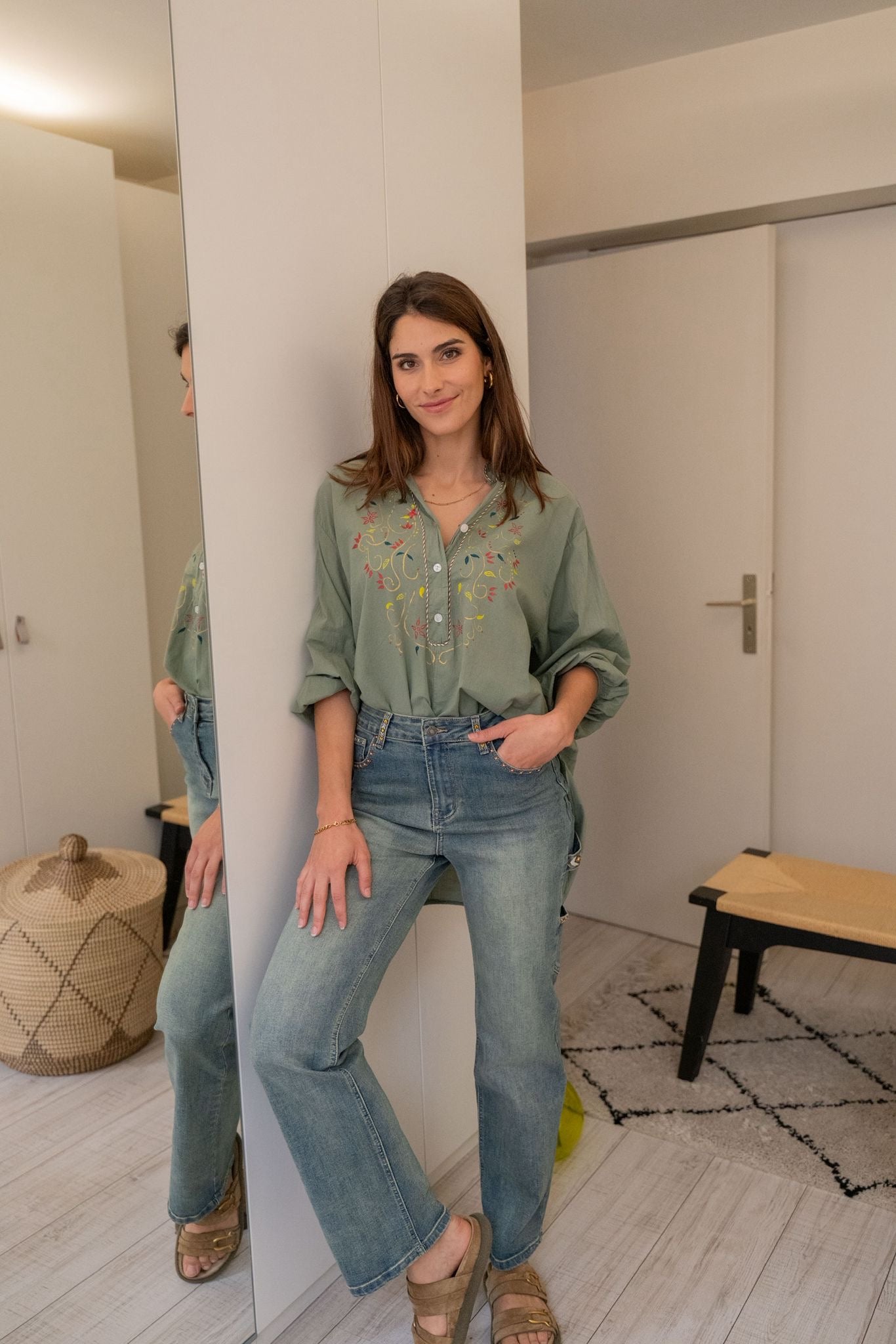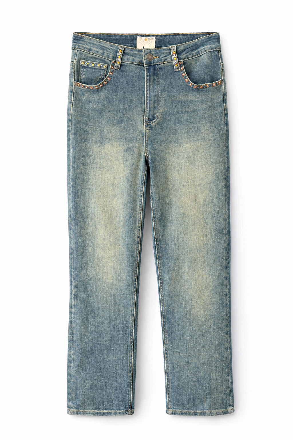 Jean coupe droite revisité avec une touche artisanale, alliant authenticité et modernité. Confectionné dans une toile denim légèrement délavée, il se distingue par ses broderies géométriques colorées délicatement placées sur les passants, les poches et les finitions. Sa coupe intemporelle assure un tombé naturel et confortable, tandis que les détails faits main apportent du caractère à la pièce. Un essentiel revisité, parfait pour un look casual avec une vraie signature stylistique.✨