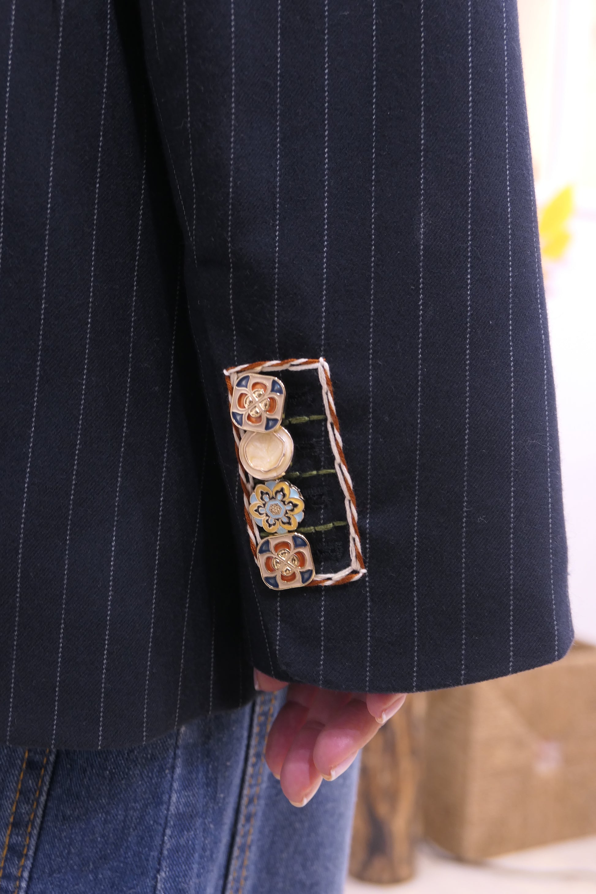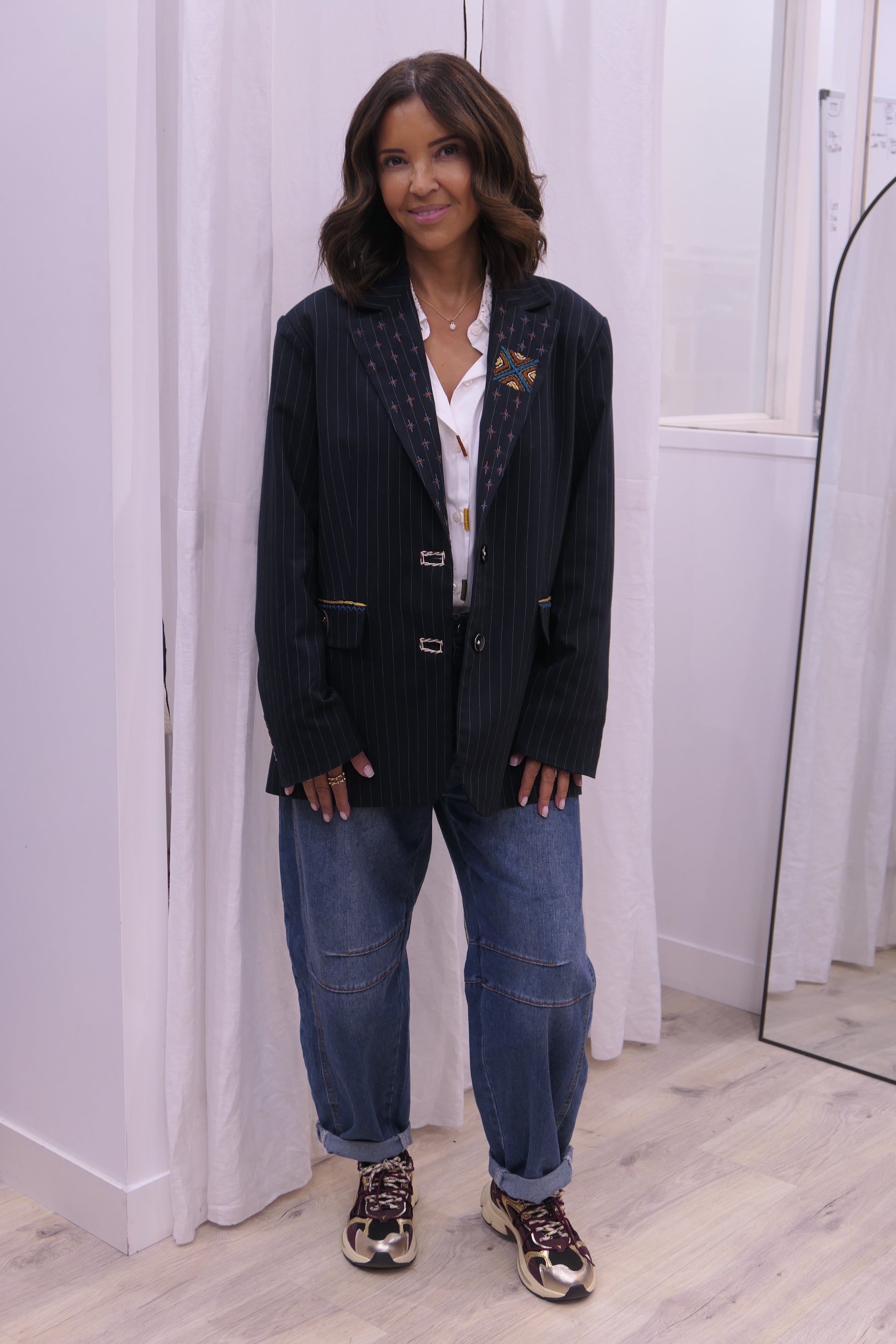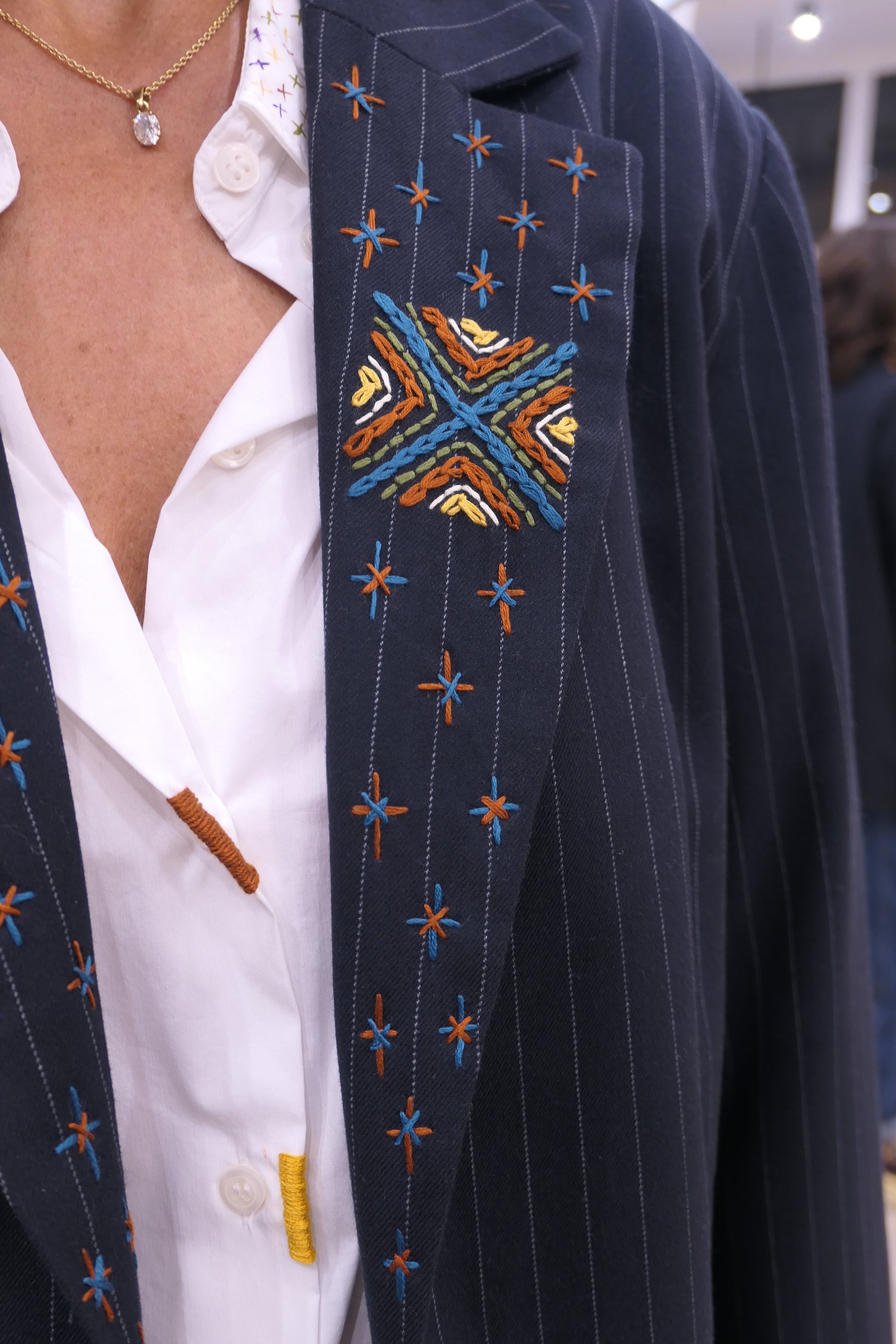 Blazer marine, revisité avec des broderies contrastées et un motif rempli sur la poche poitrine. Les broderies orange, bleu et écru apportent du relief au col, aux poches et aux boutonnières. Une pièce forte qui donne du caractère à n’importe quel look.