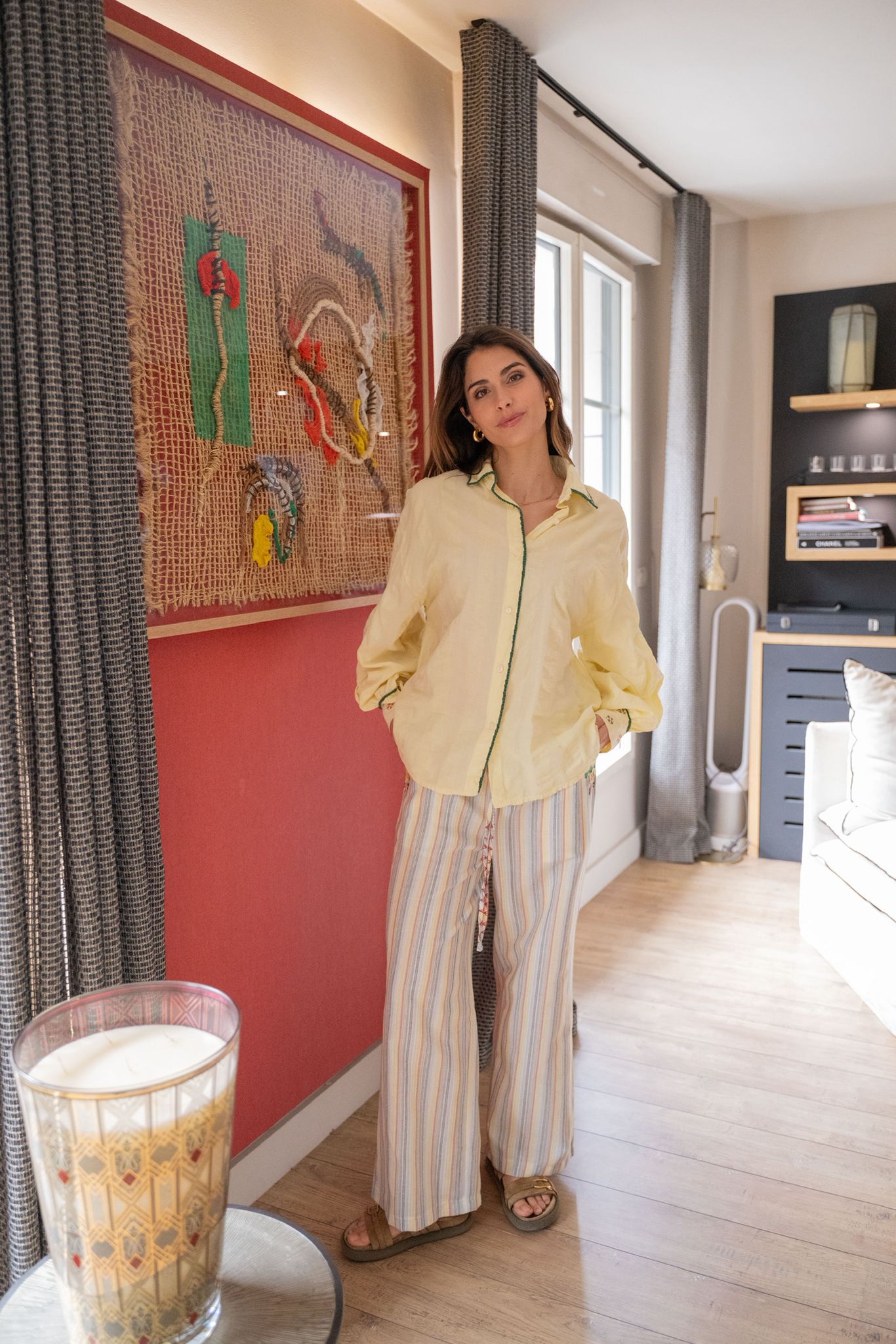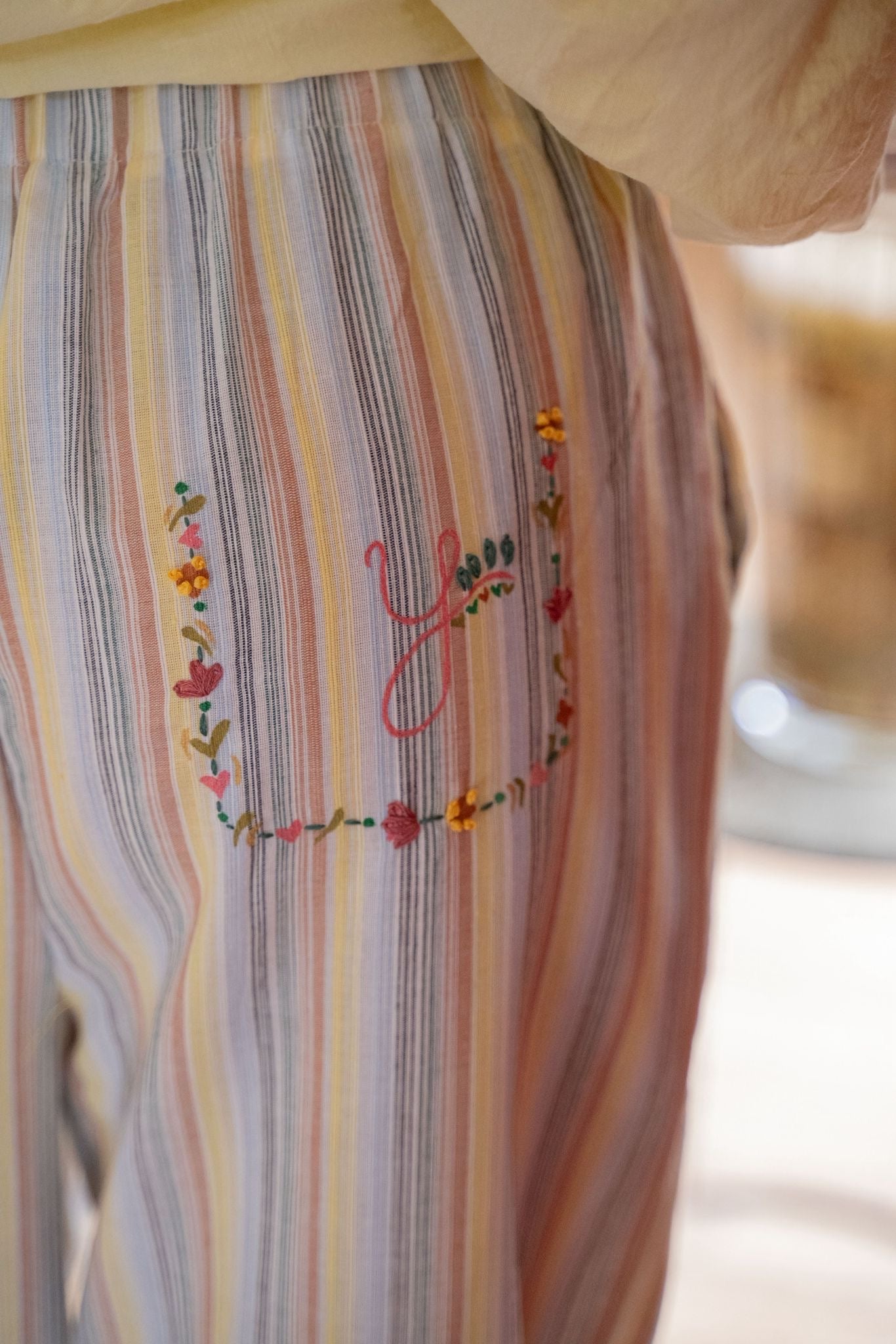 Pantalon à la coupe ample et légère, orné de fines rayures multicolores et de délicates broderies florales. Il possède une taille élastiquée avec lien à nouer pour plus de confort.
