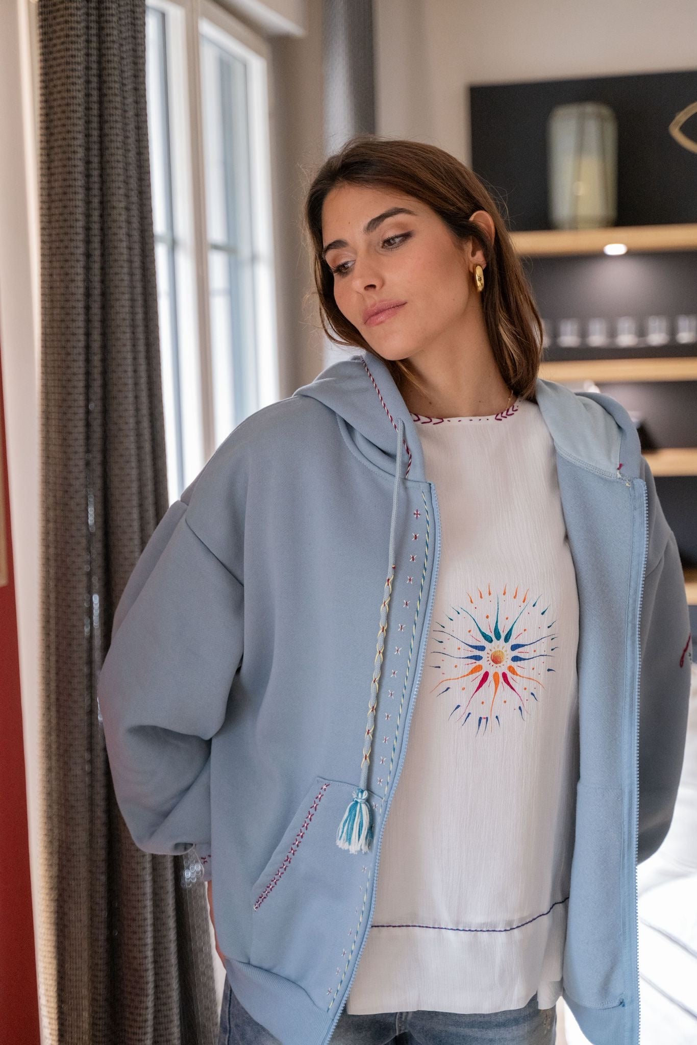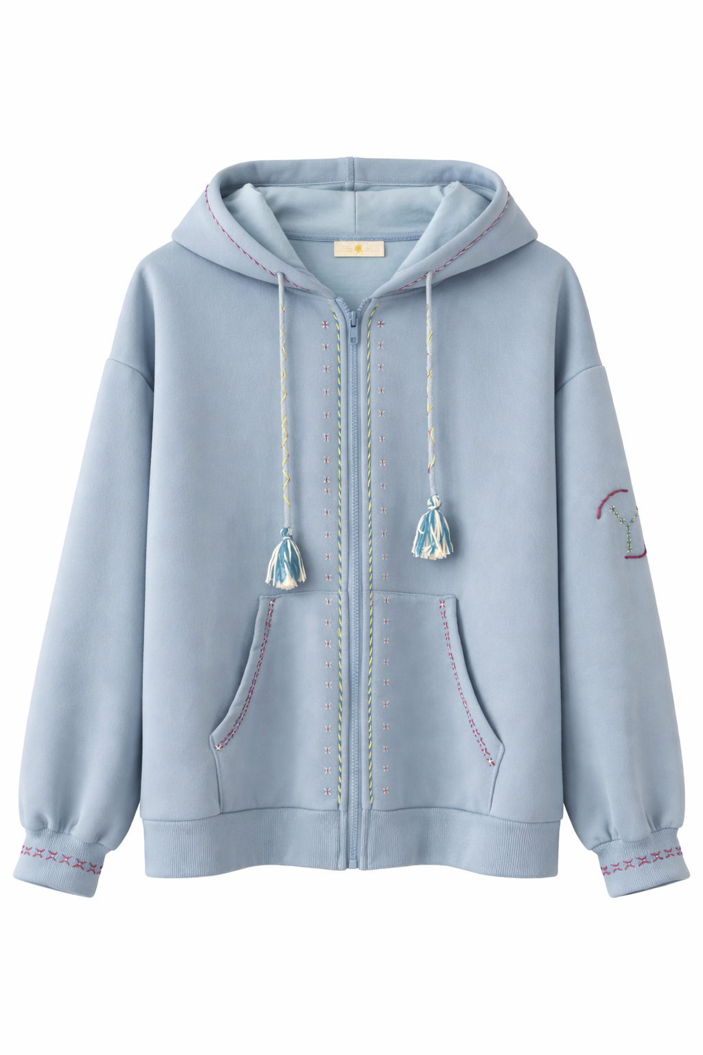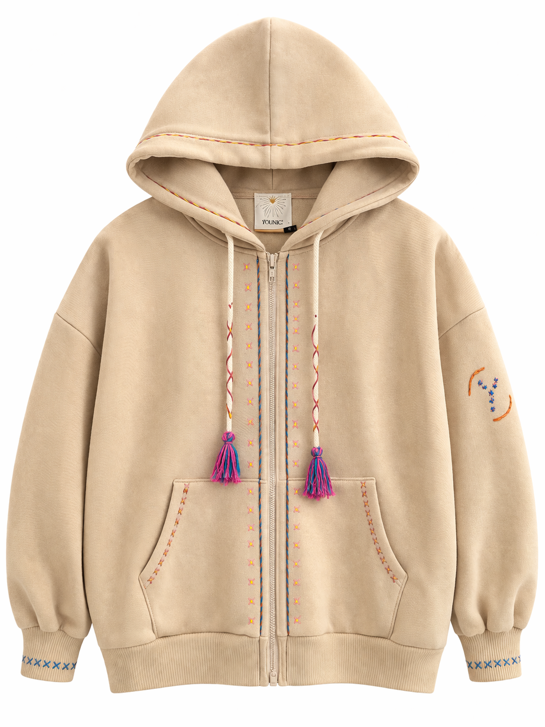 Sweat à la coupe confortable, agrémenté de broderies colorées pour une touche originale. Il dispose d’une capuche avec liens à pompons, d’une fermeture zippée et de deux poches à l’avant.
