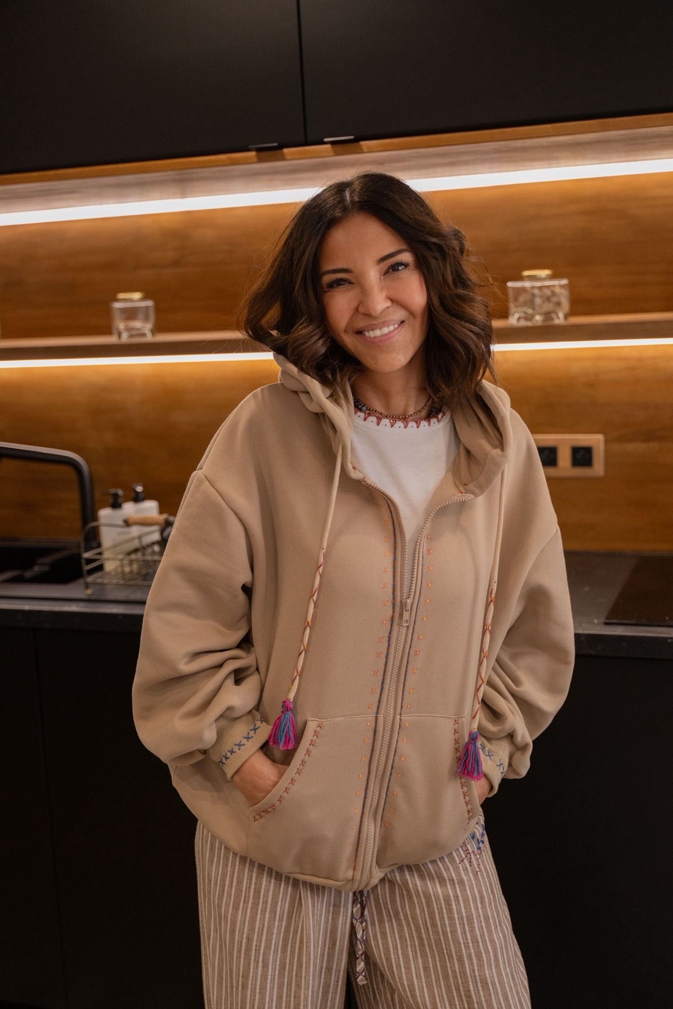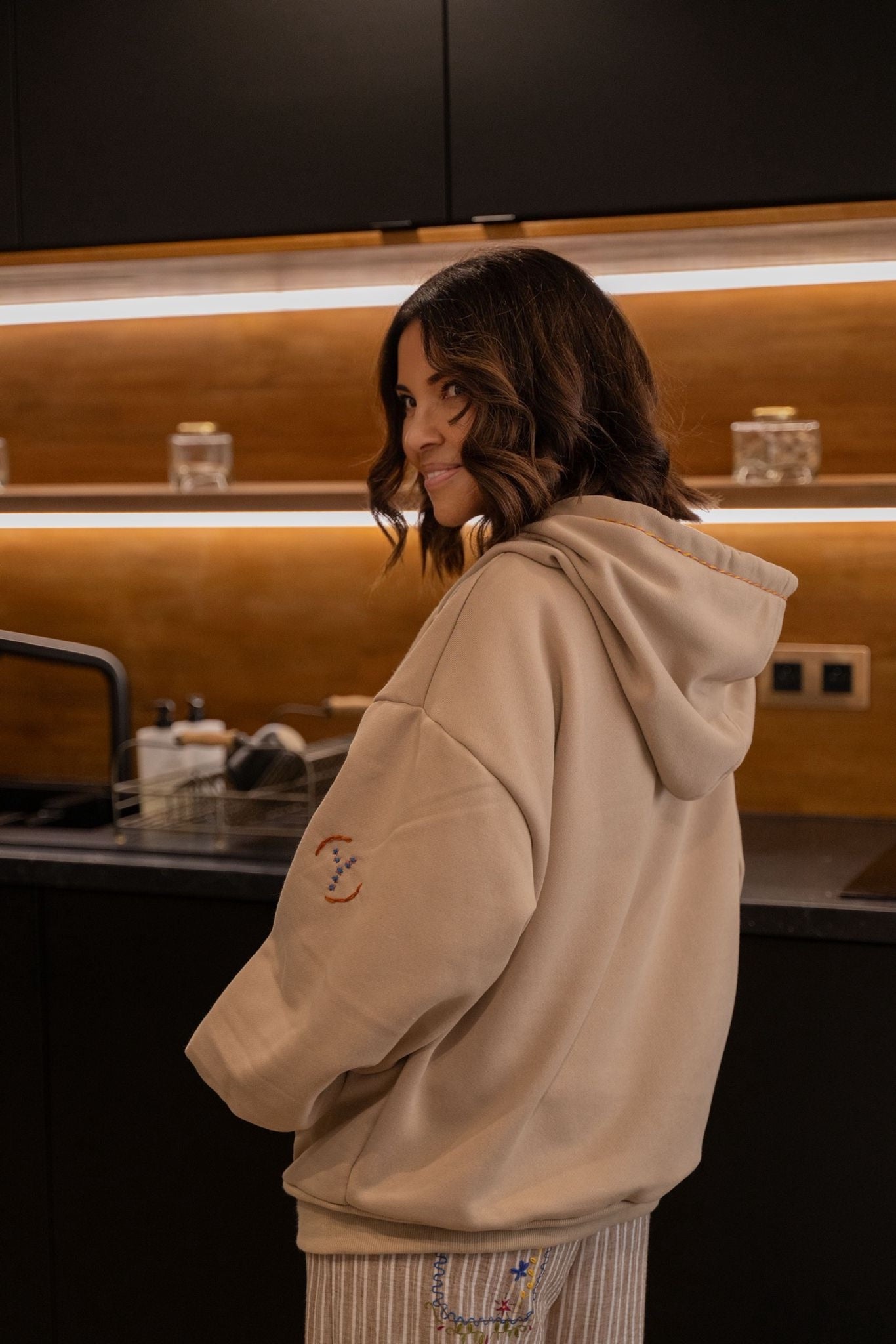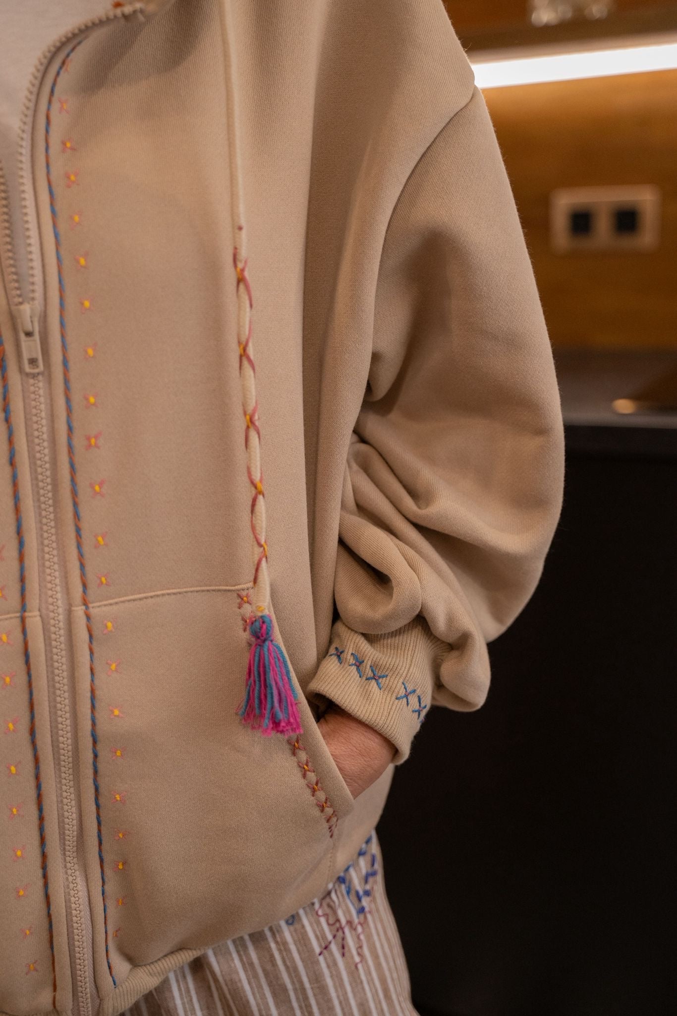 Sweat à la coupe confortable, agrémenté de broderies colorées pour une touche originale. Il dispose d’une capuche avec liens à pompons, d’une fermeture zippée et de deux poches à l’avant.