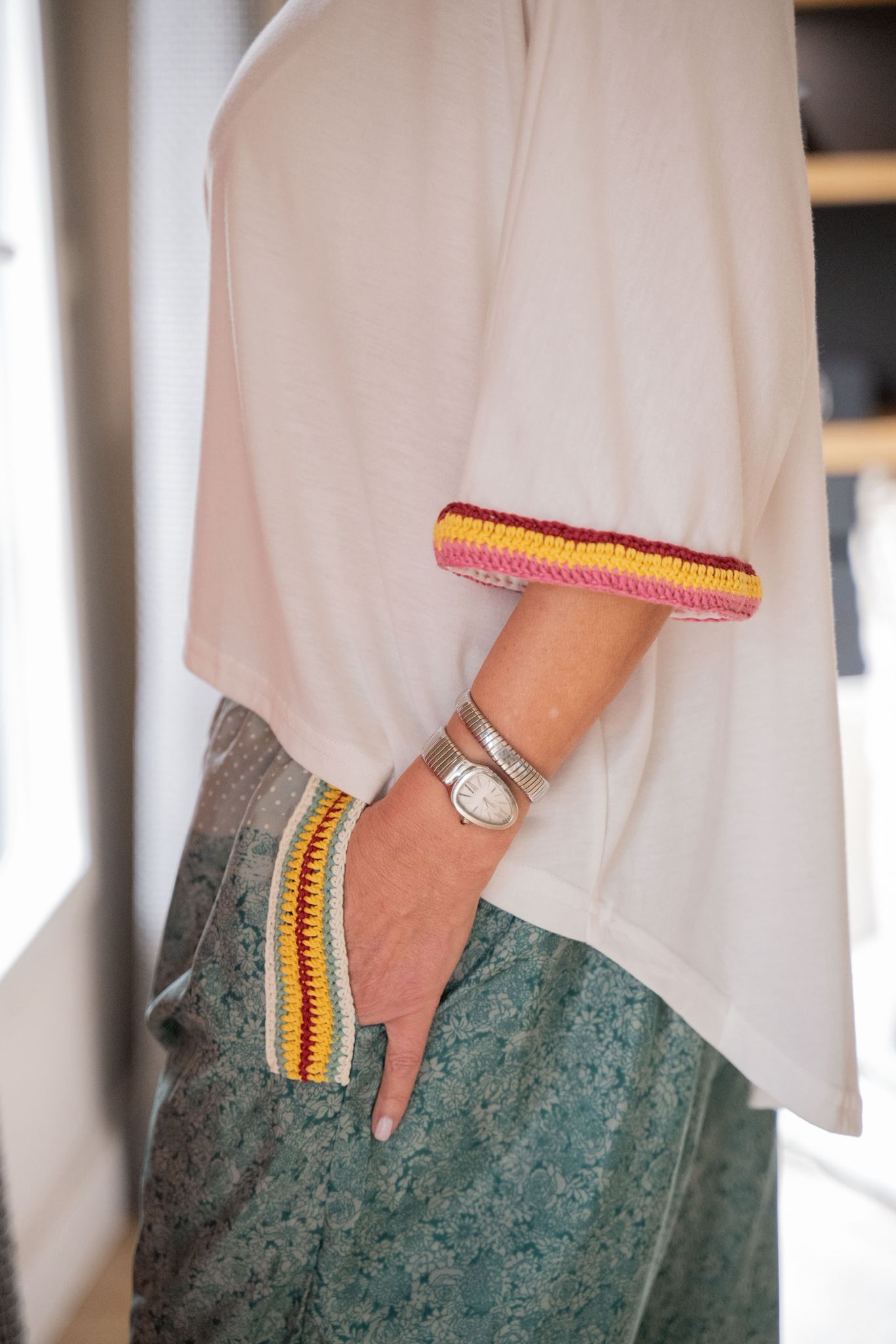 T-shirt fluide aux manches mi-longues, ornée de crochet aux manches et au col. Le tout apporte une touche artisanale et lumineuse.