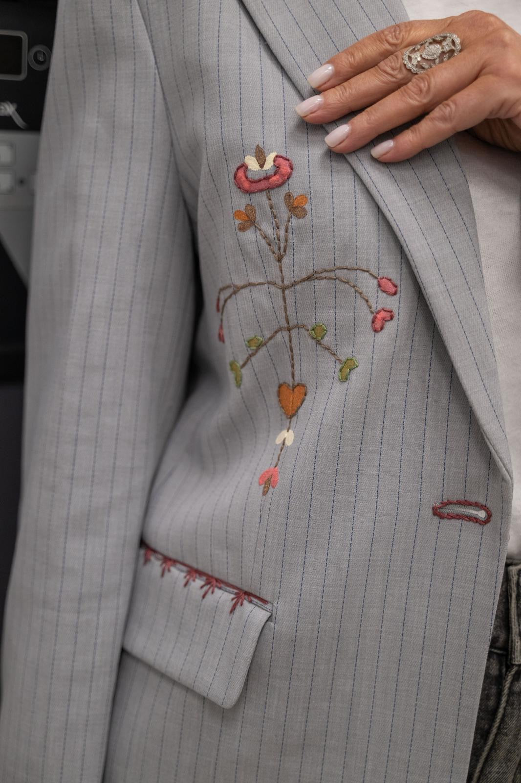 Blazer droit et souple, revisité avec des broderies contrastées et une ravissante peinture travaillée à la main. Les broderies apportent du relief au blazer et une touche d'originalité. Une pièce forte qui donne du caractère à n’importe quel look.