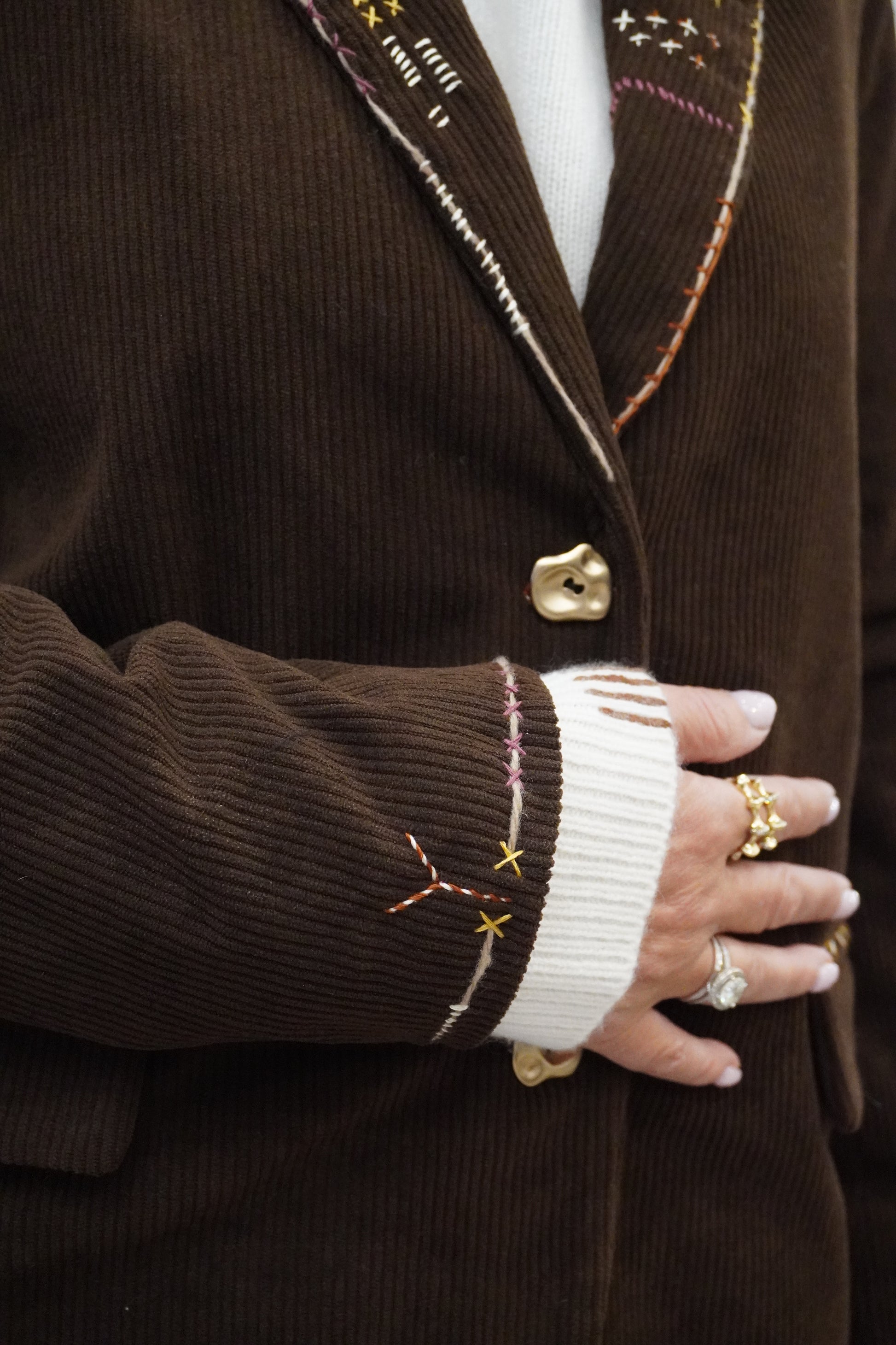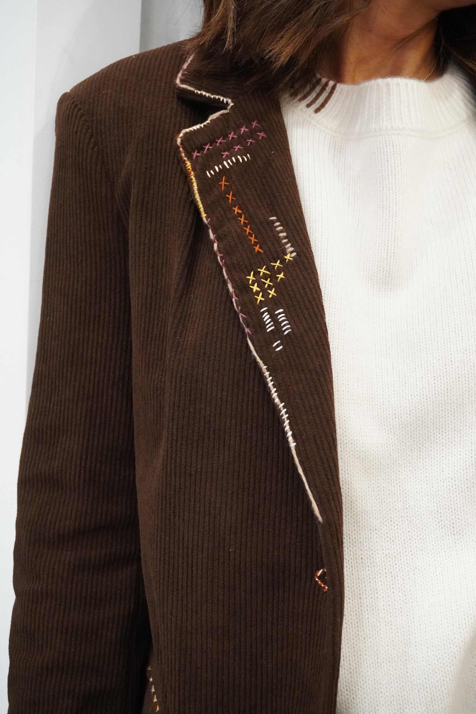 Blazer en velours doux marron entièrement brodé à la main avec un mélange de fils à brodé et de fils de laine qui apportent textures et originalité. Belle qualité avec tenue et une coupe droite, élégante et confortable.