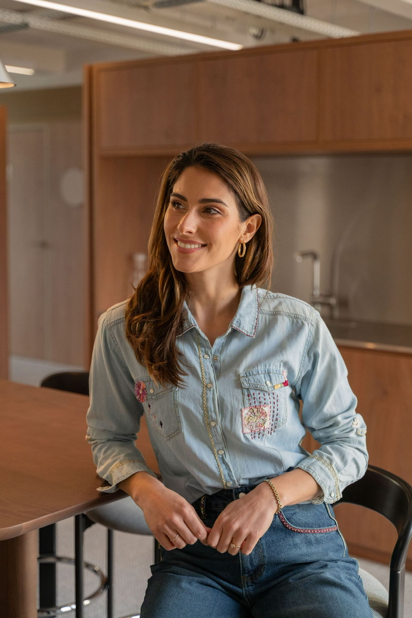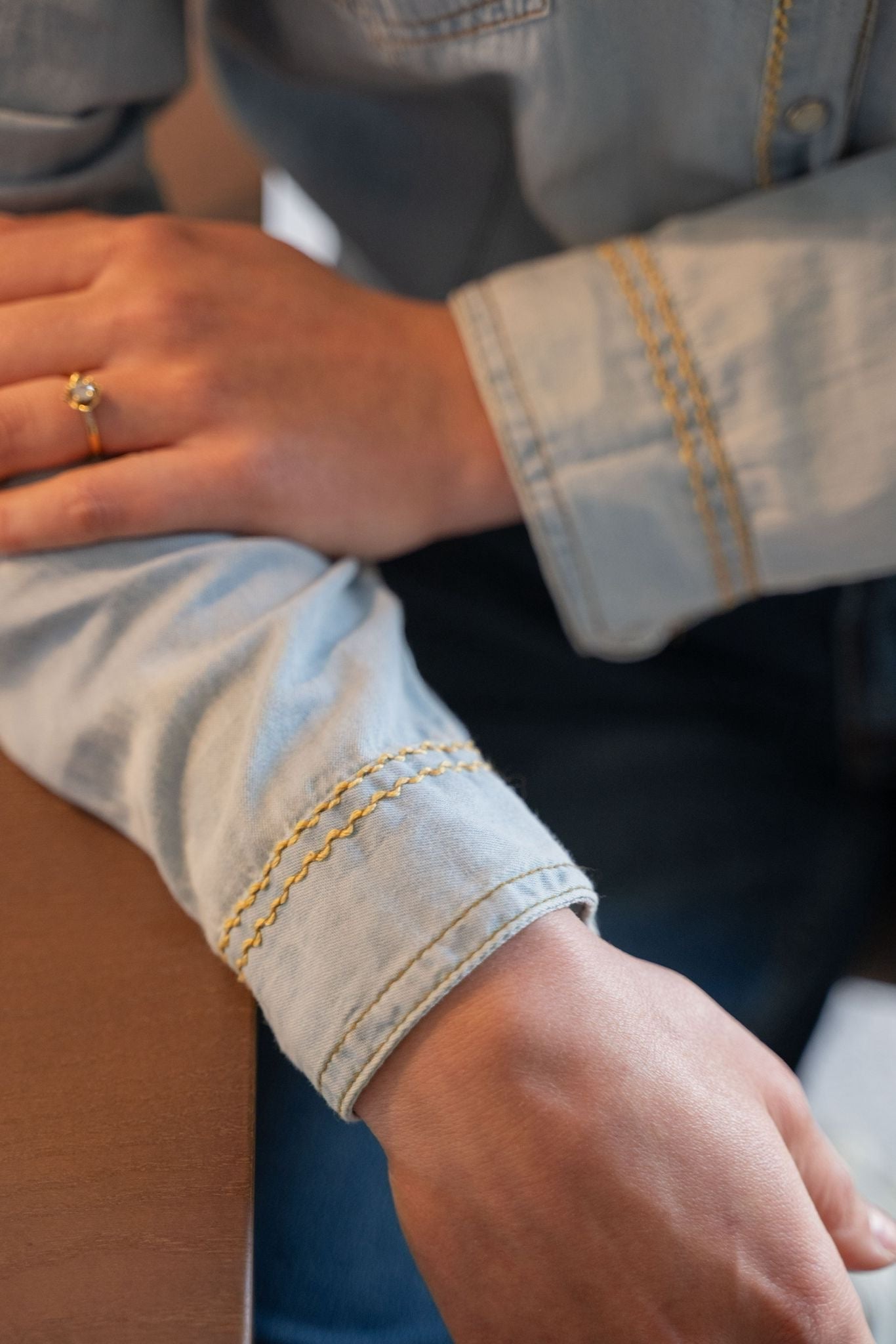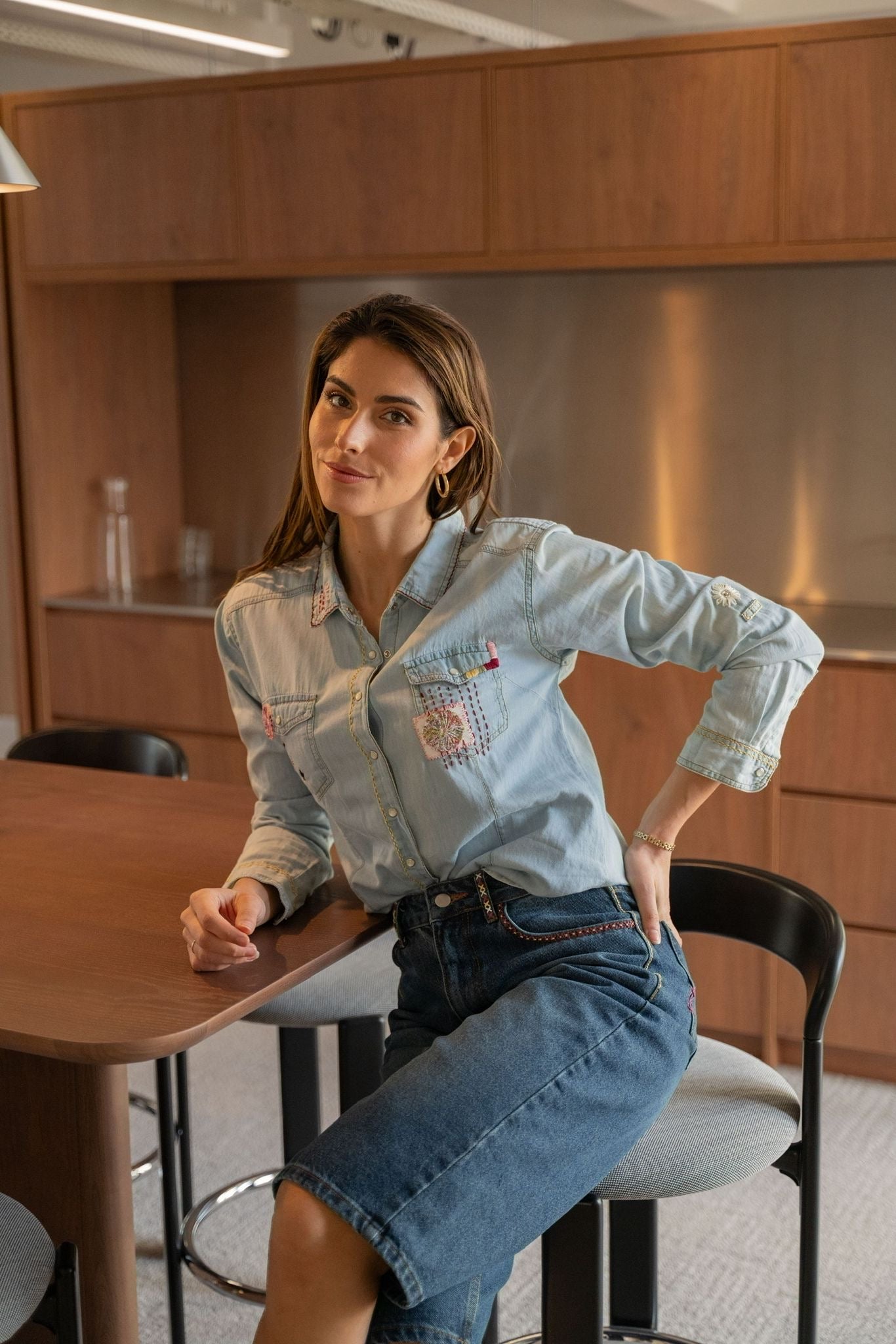 Chemise en denim clair ornée de broderies colorées et de détails artisanaux sur le col, les poches et les manches. Une pièce originale qui mêle esprit casual et touches créatives.