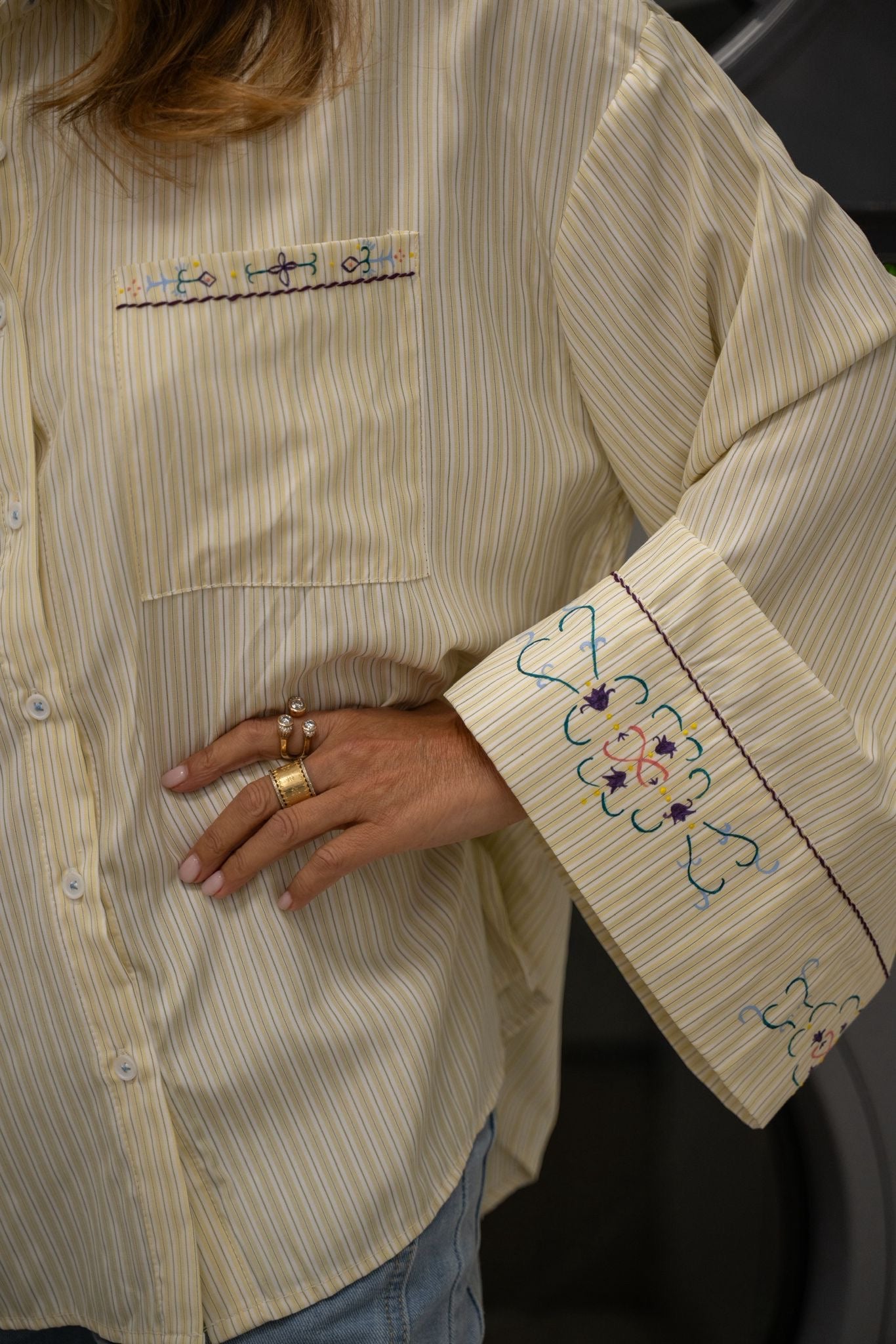 Chemise jaune avec une coupe fluide, détails de broderie et de peinture textile, le tout réalisé à la main dans notre atelier parisien, pour un style à la fois chic et original.