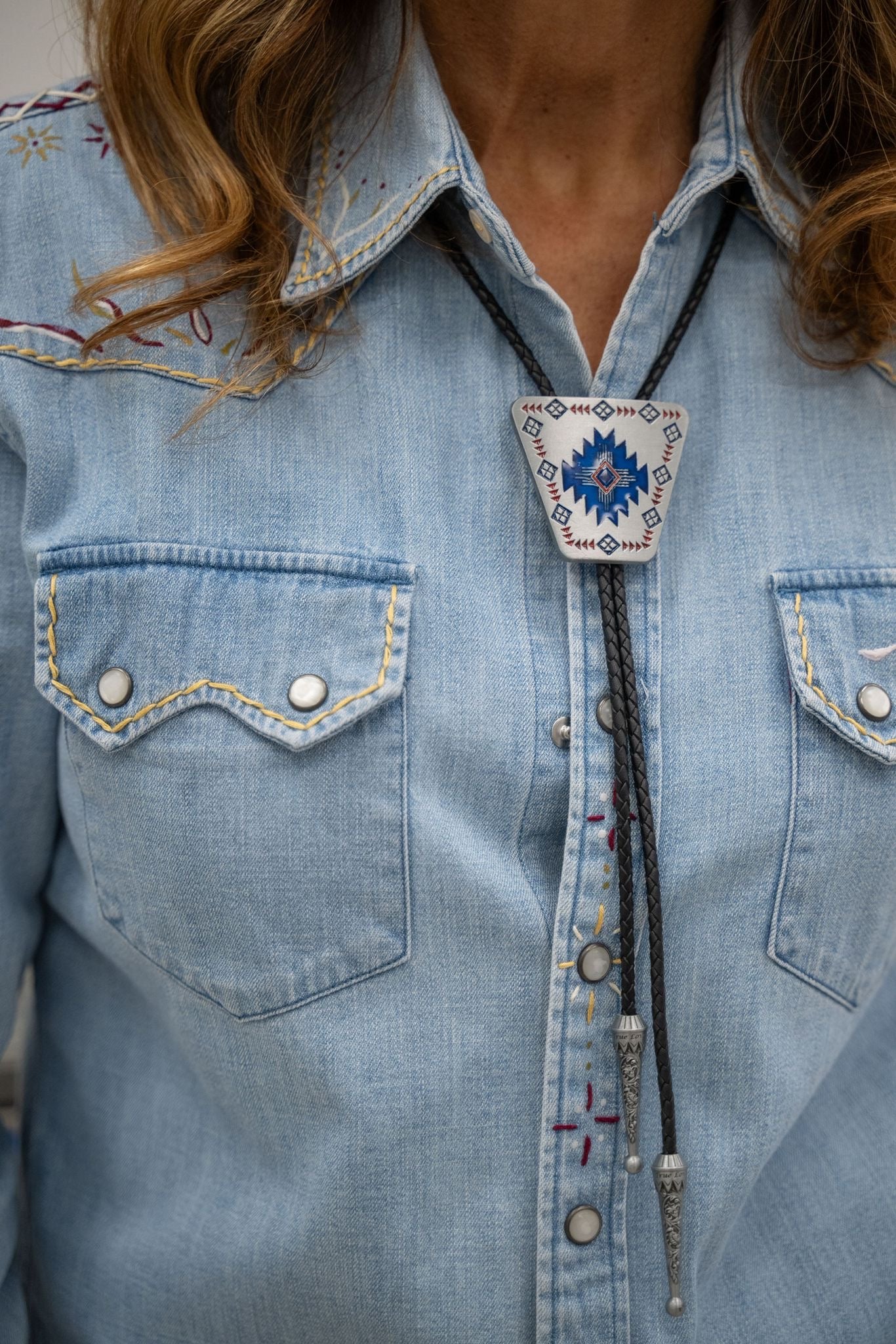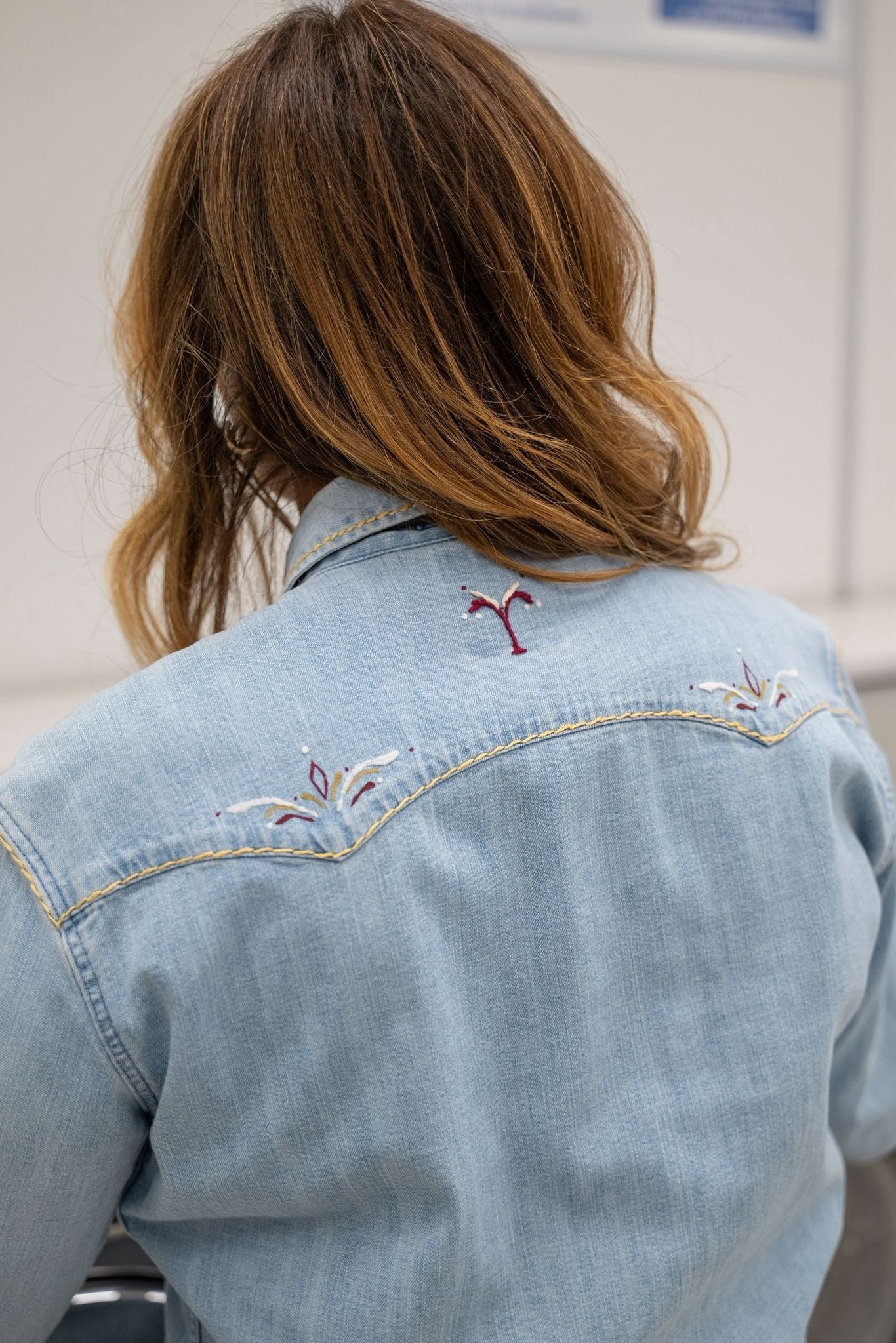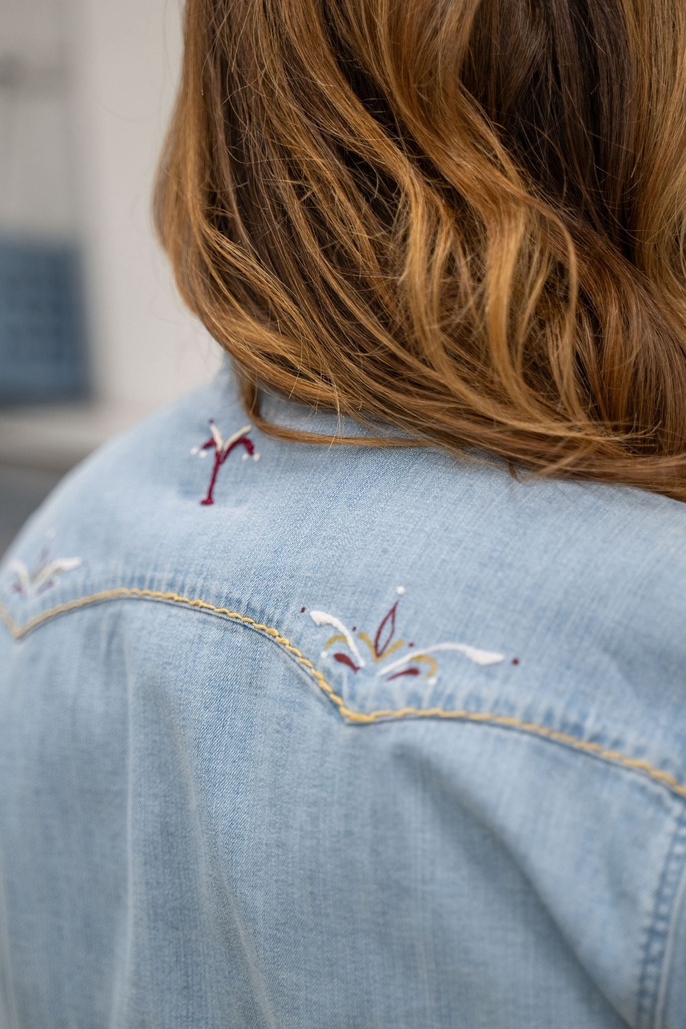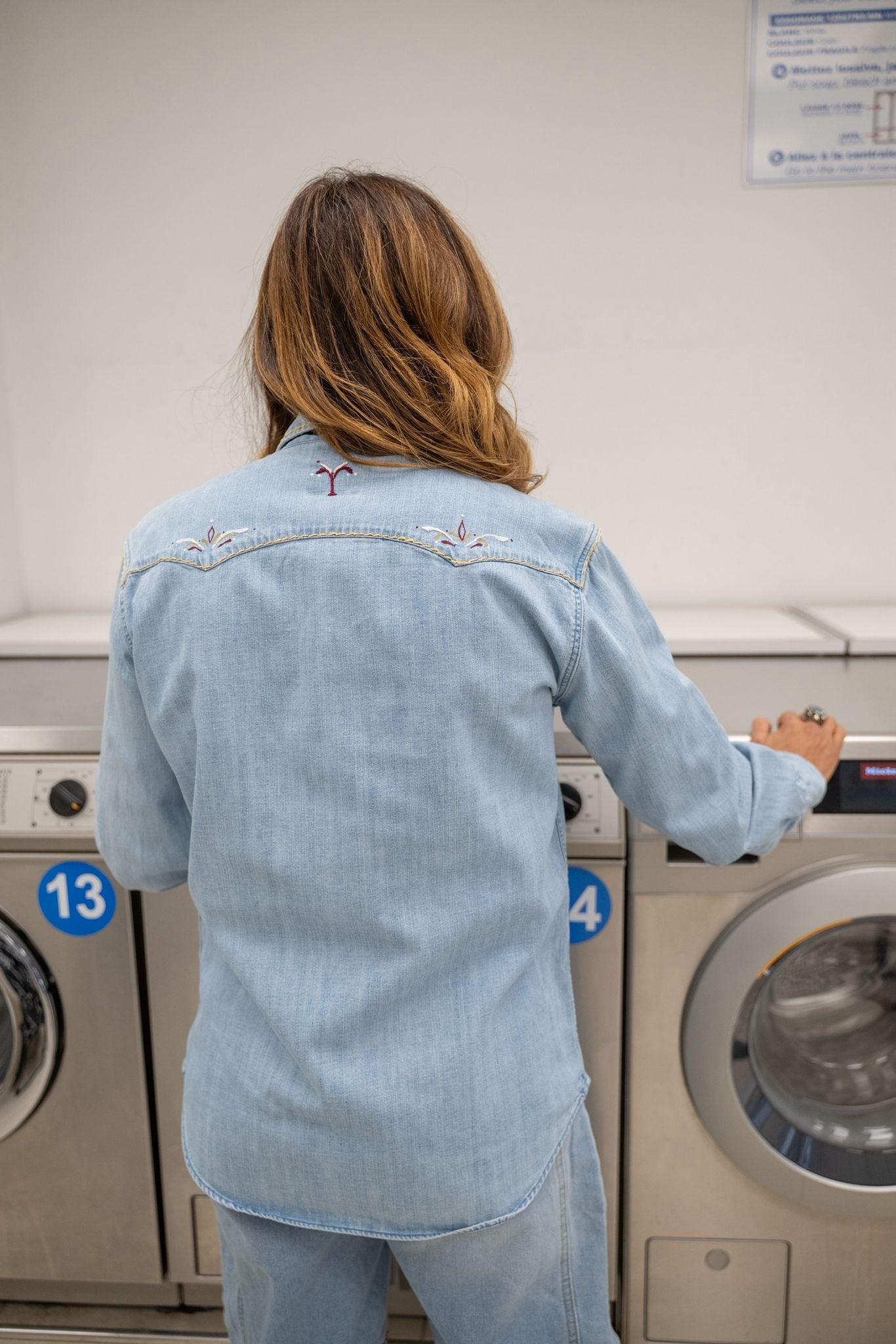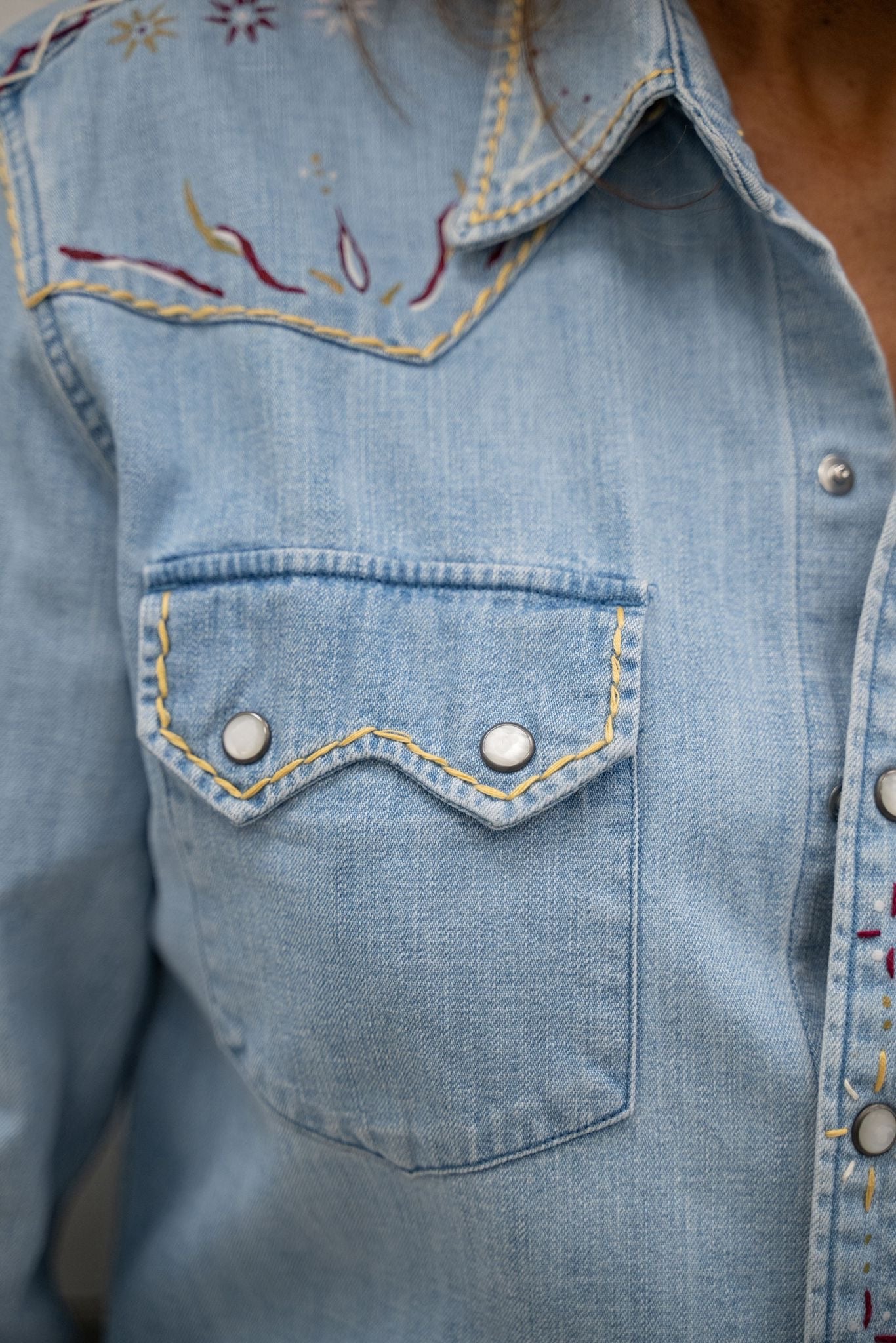 Chemise en jean au style western revisité, entièrement travaillée à la main avec de délicates broderies sur le col, les épaules et les poches. Les finitions contrastées et les détails brodés apportent du caractère à cette pièce unique.