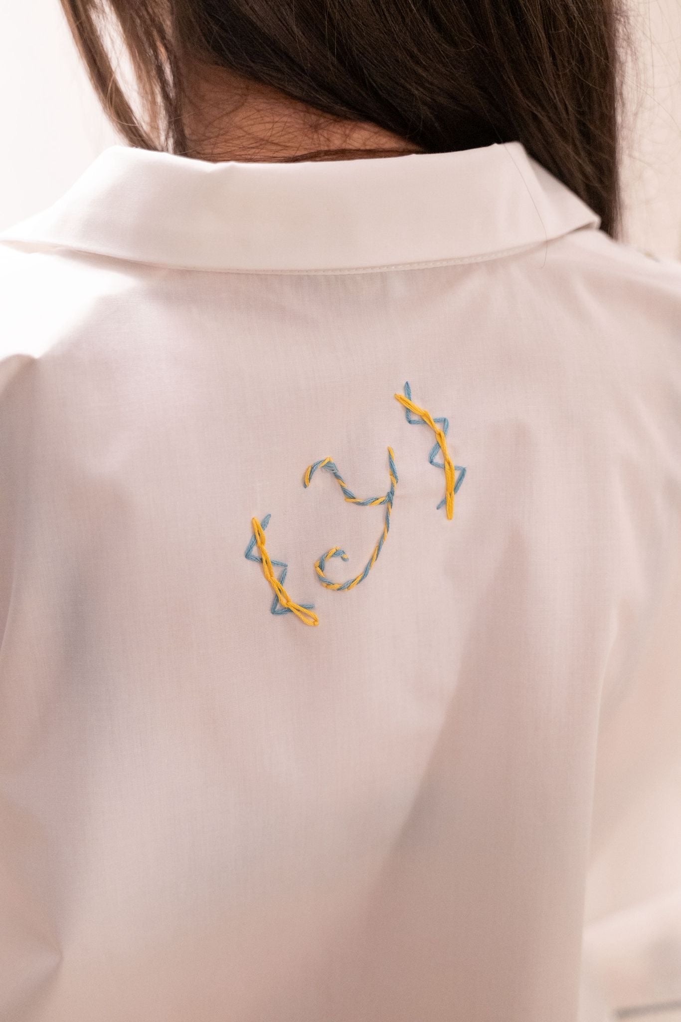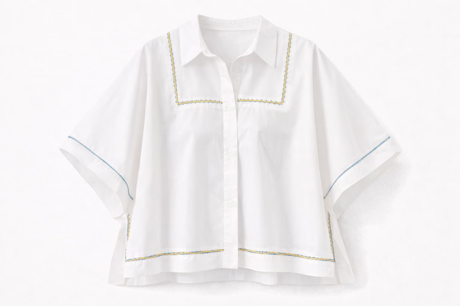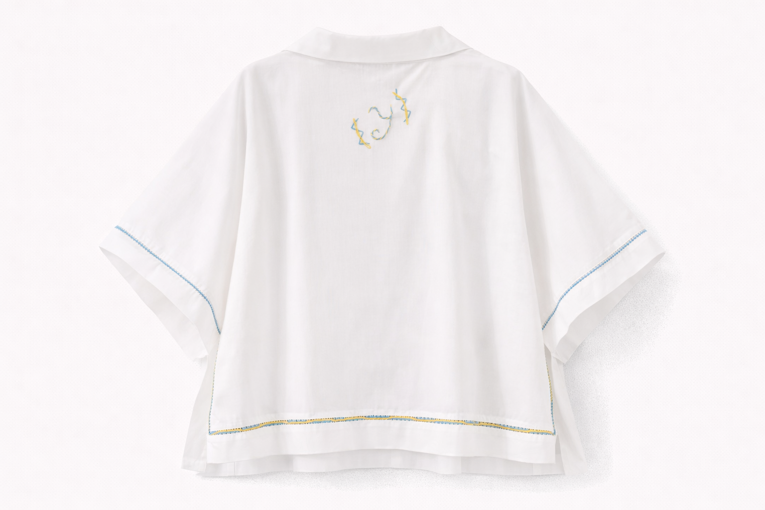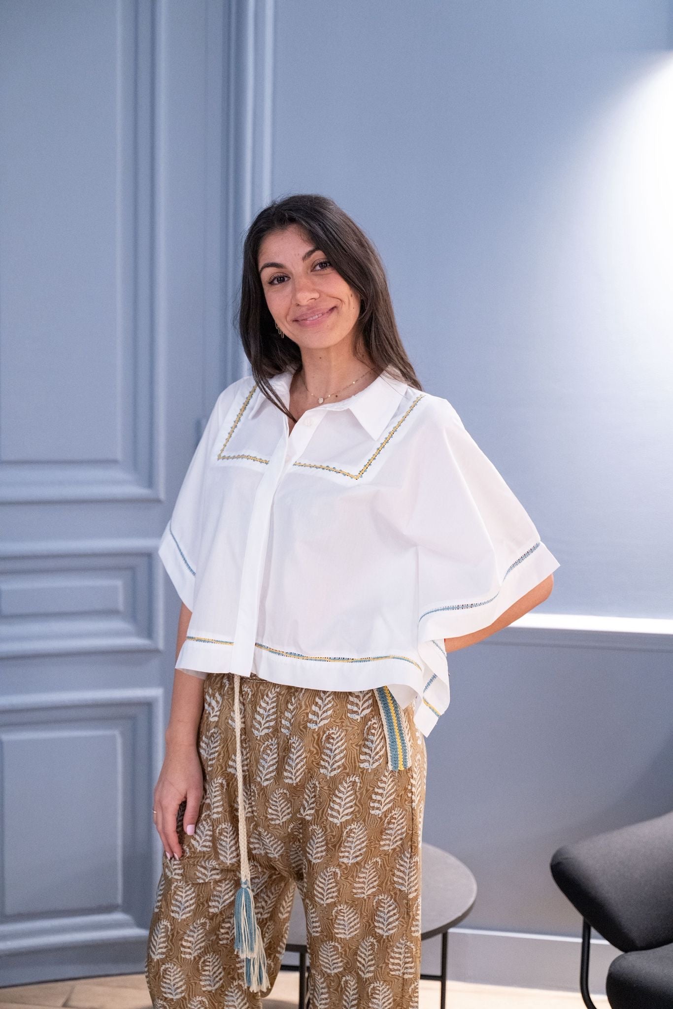 Blouse blanche à la coupe fluide, ouverte sur les côtés pour un porté aérien et moderne. Les broderies fines réalisées à la main soulignent l’encolure, les manches et la base, apportant une touche artisanale délicate. Une pièce légère et élégante, pensée pour allier confort, mouvement et raffinement.