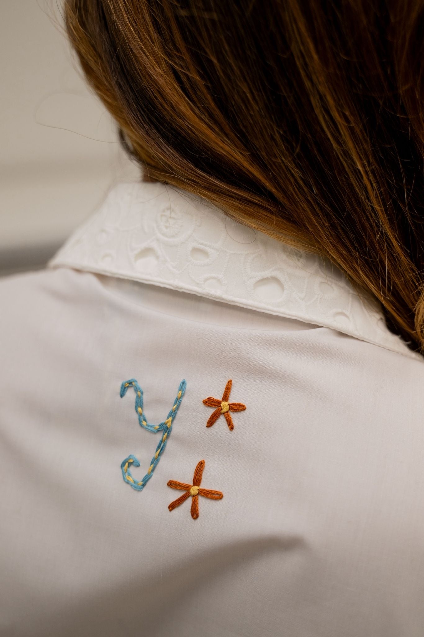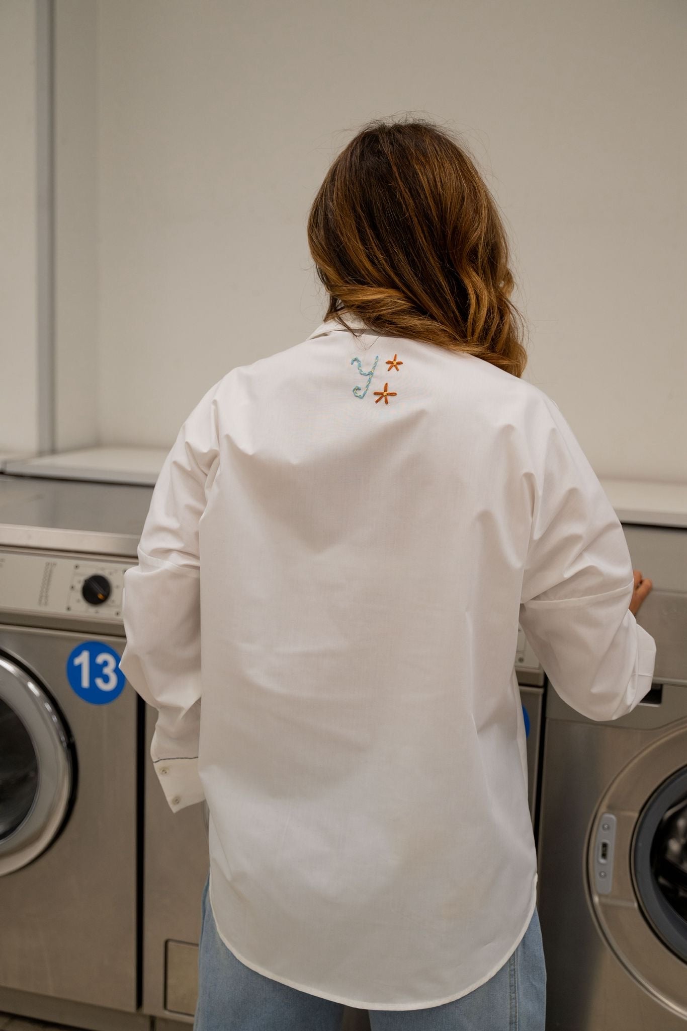 Chemise blanche élégante et lumineuse, sublimée par de broderies florales délicates réalisées sur l’épaule et le long de la manche. Le jeu de couleurs et de textures apporte une touche artisanale raffinée tout en restant facile à porter.