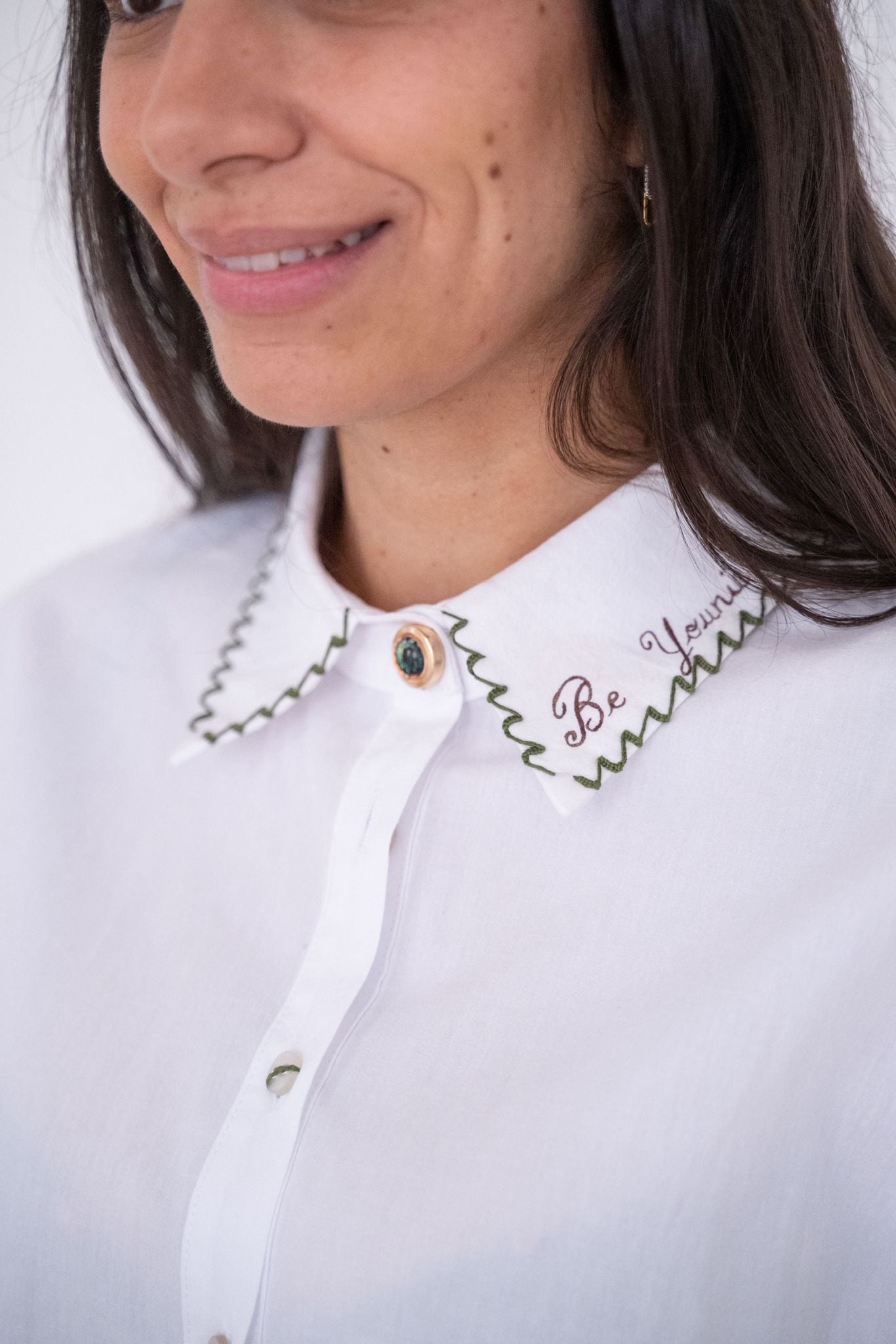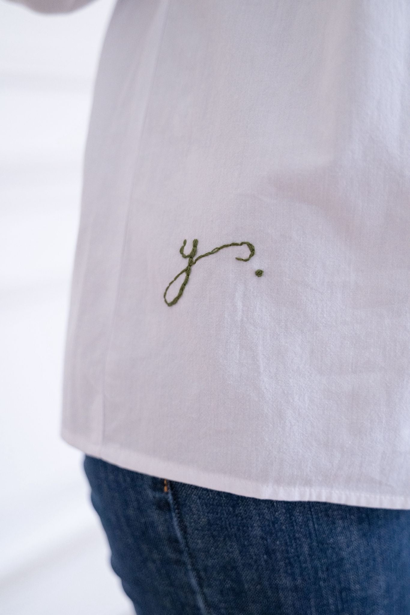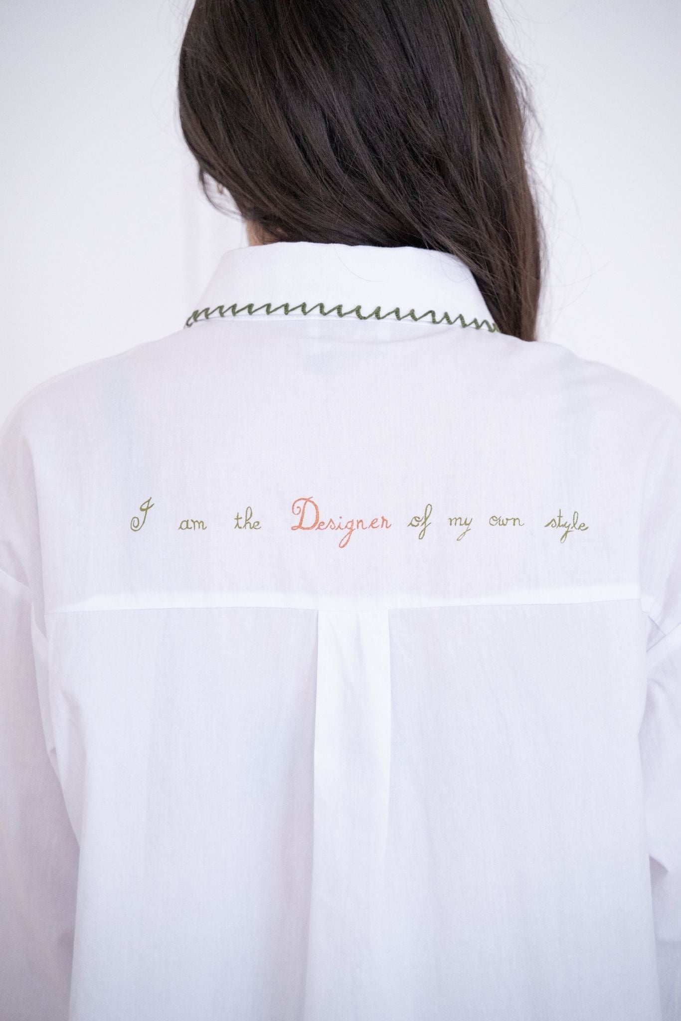 Chemise blanche à la coupe fluide et délicate, sublimée par des écritures réalisées à la main en peinture textile, discrètement placées au dos et sur les poignets. Les finitions brodées au col apportent une touche de raffinement supplémentaire. Une pièce élégante, intemporelle, relevée d’une note d’originalité subtile.