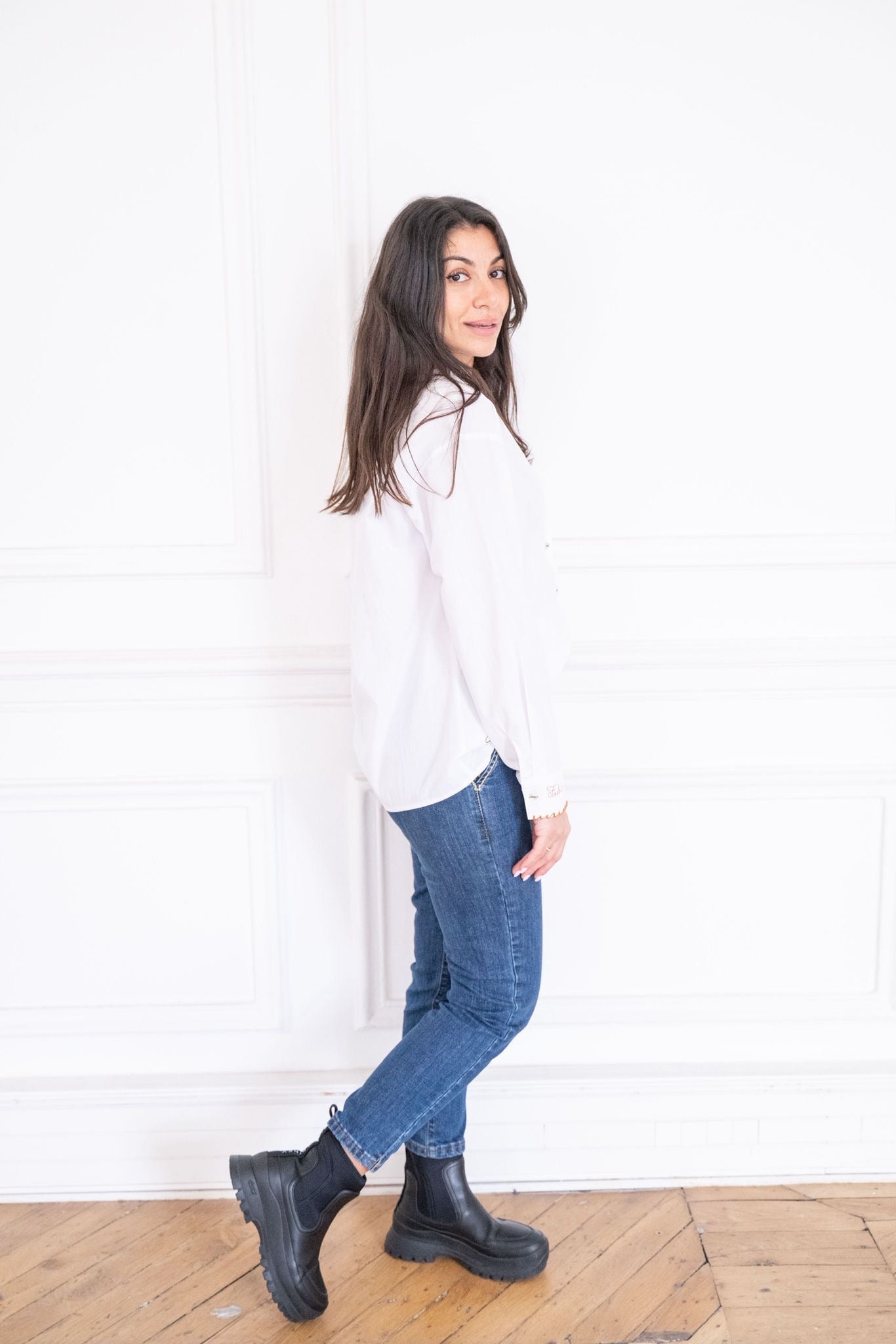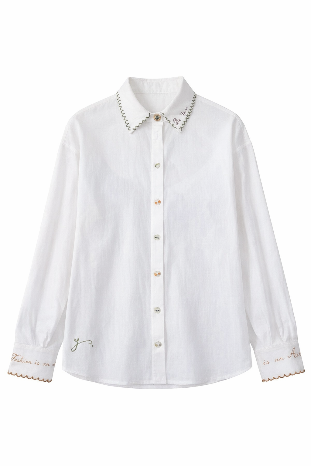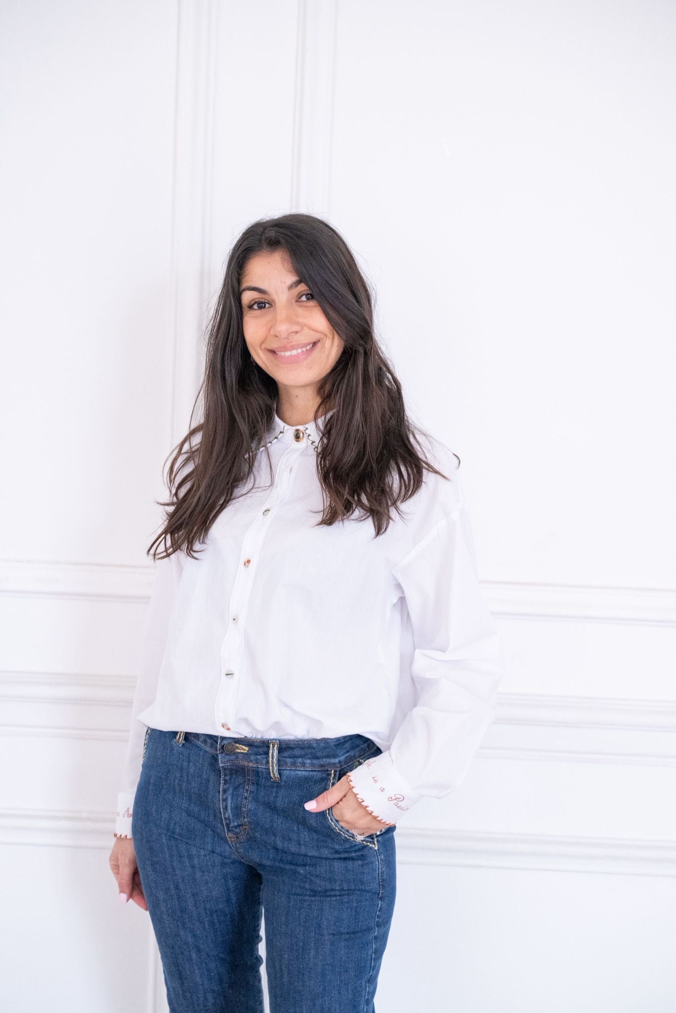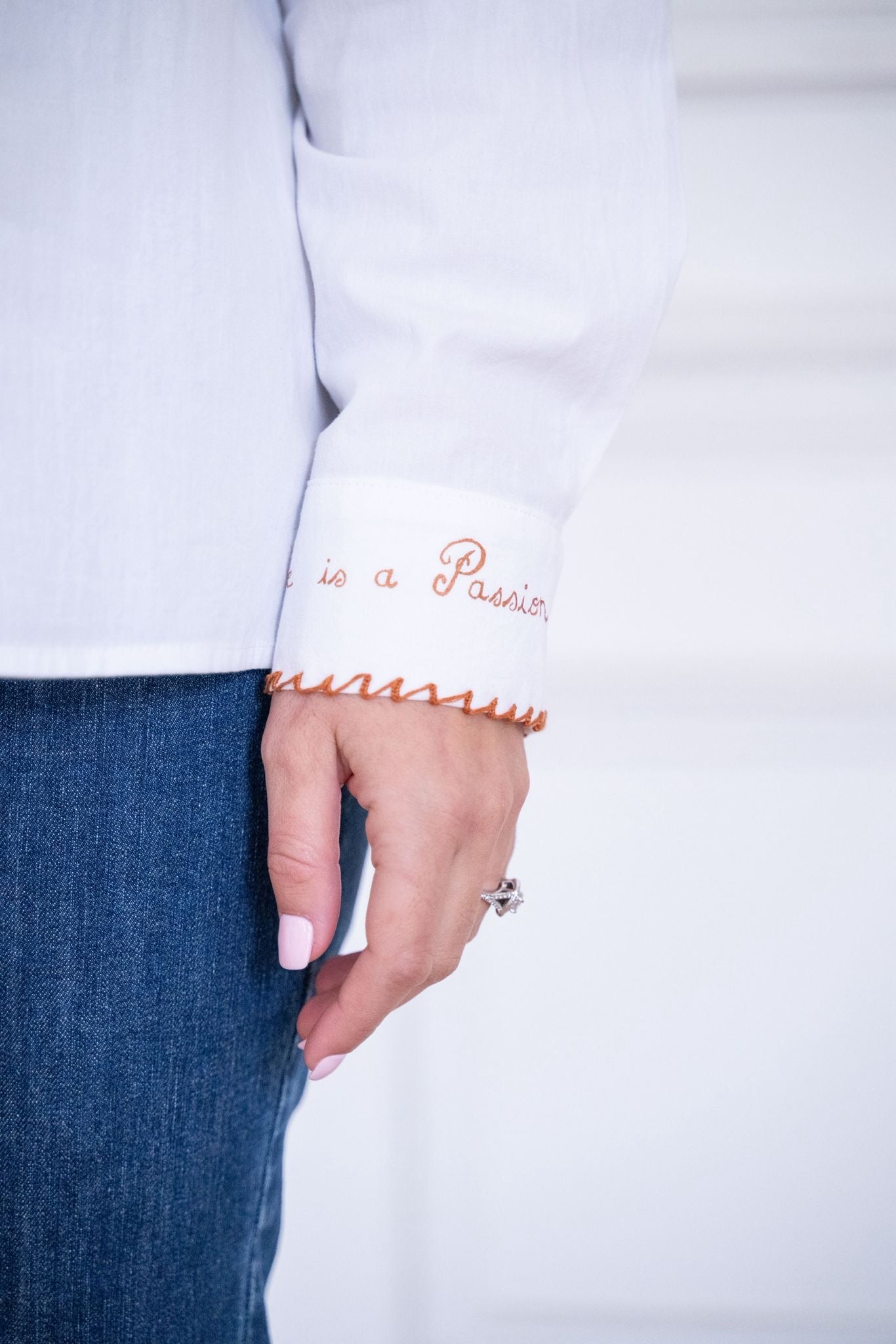 Chemise blanche à la coupe fluide et délicate, sublimée par des écritures réalisées à la main en peinture textile, discrètement placées au dos et sur les poignets. Les finitions brodées au col apportent une touche de raffinement supplémentaire. Une pièce élégante, intemporelle, relevée d’une note d’originalité subtile.