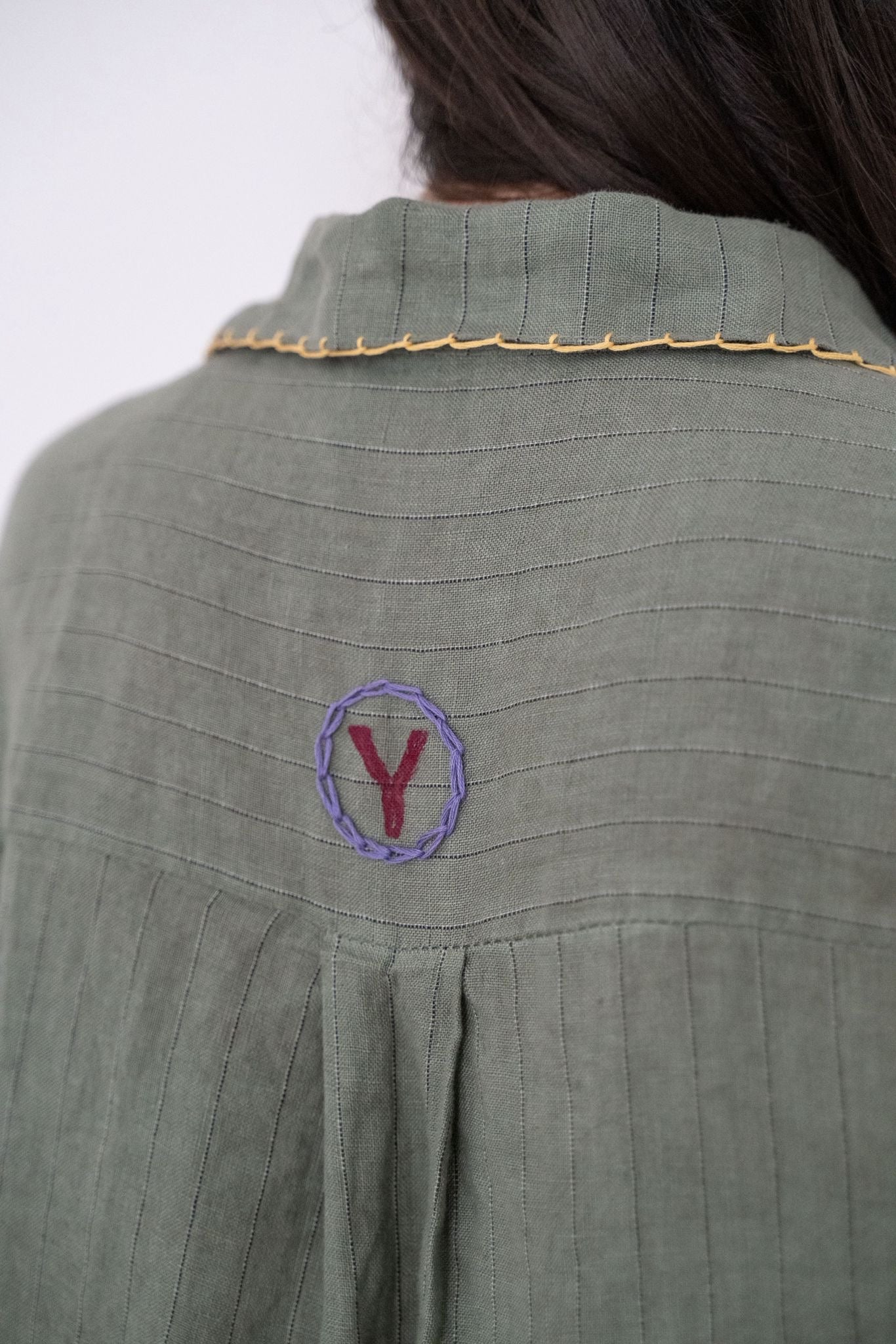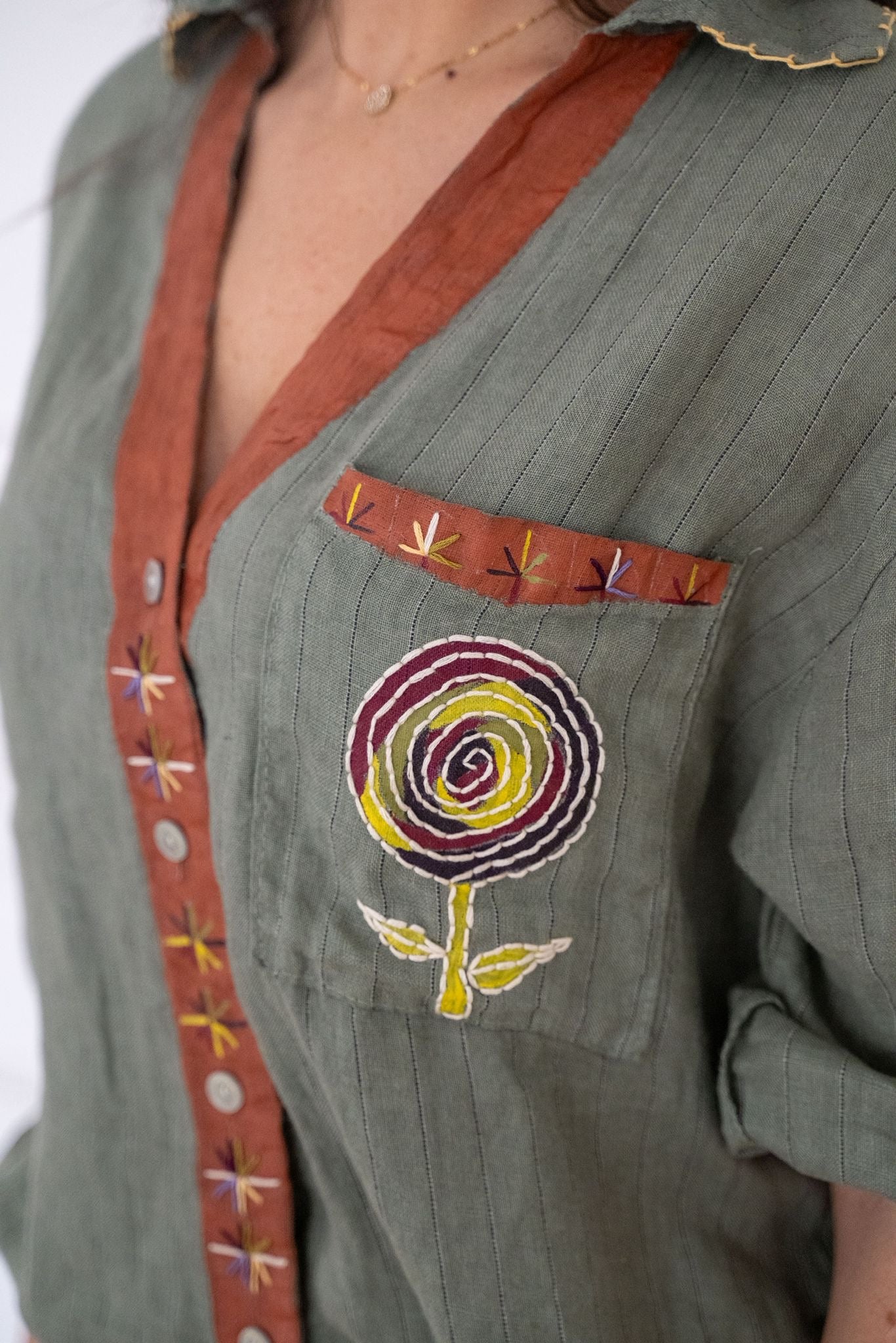Chemise en lin 100 % naturel, légère et respirante, dans une teinte vert doux au charme authentique. Détails artisanaux mêlant broderie délicate et touches de peinture, avec finitions contrastées le long de la patte de boutonnage et sur la poche poitrine. Une pièce qui allie élégance décontractée et esprit créatif, idéale pour un look bohème chic au quotidien.