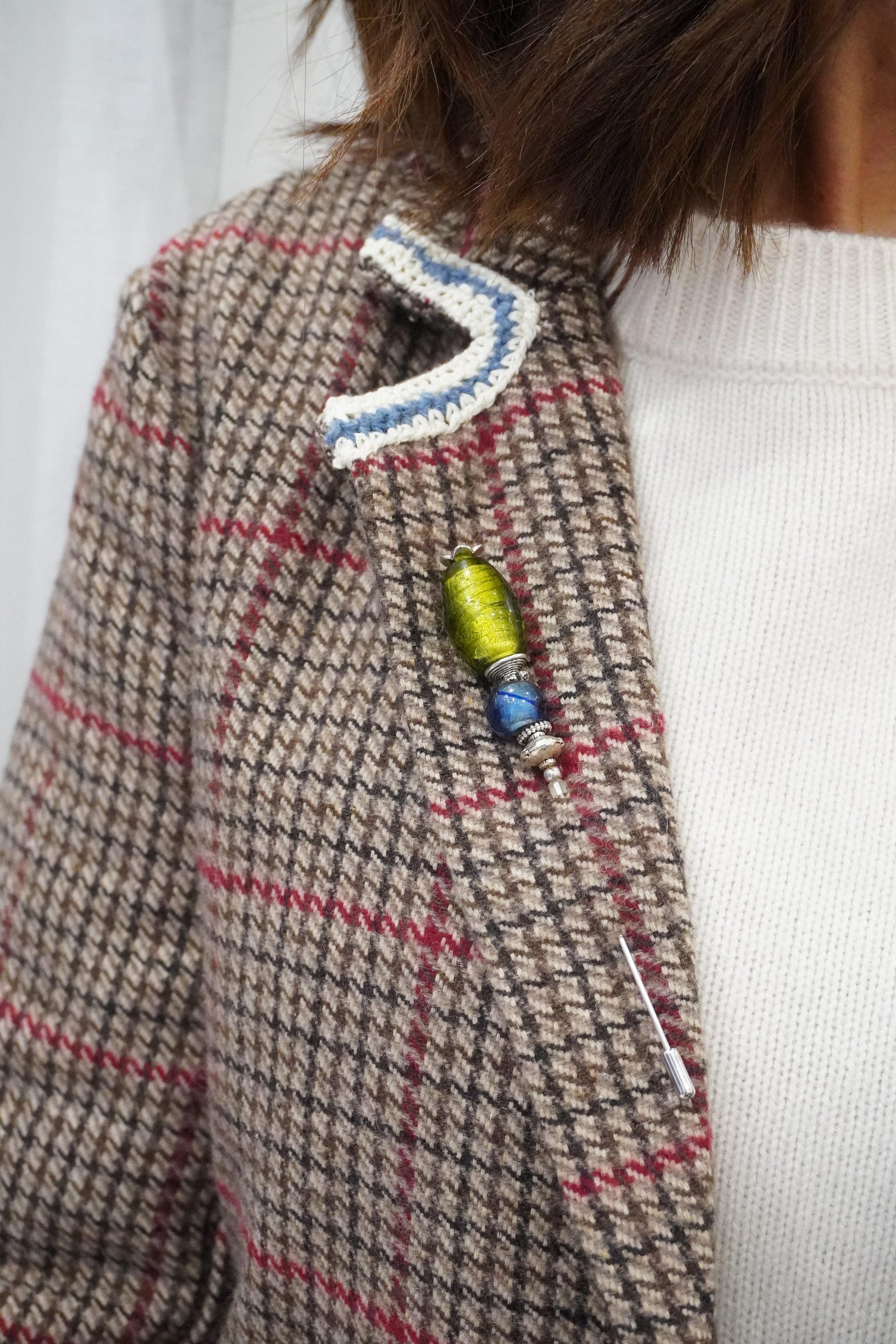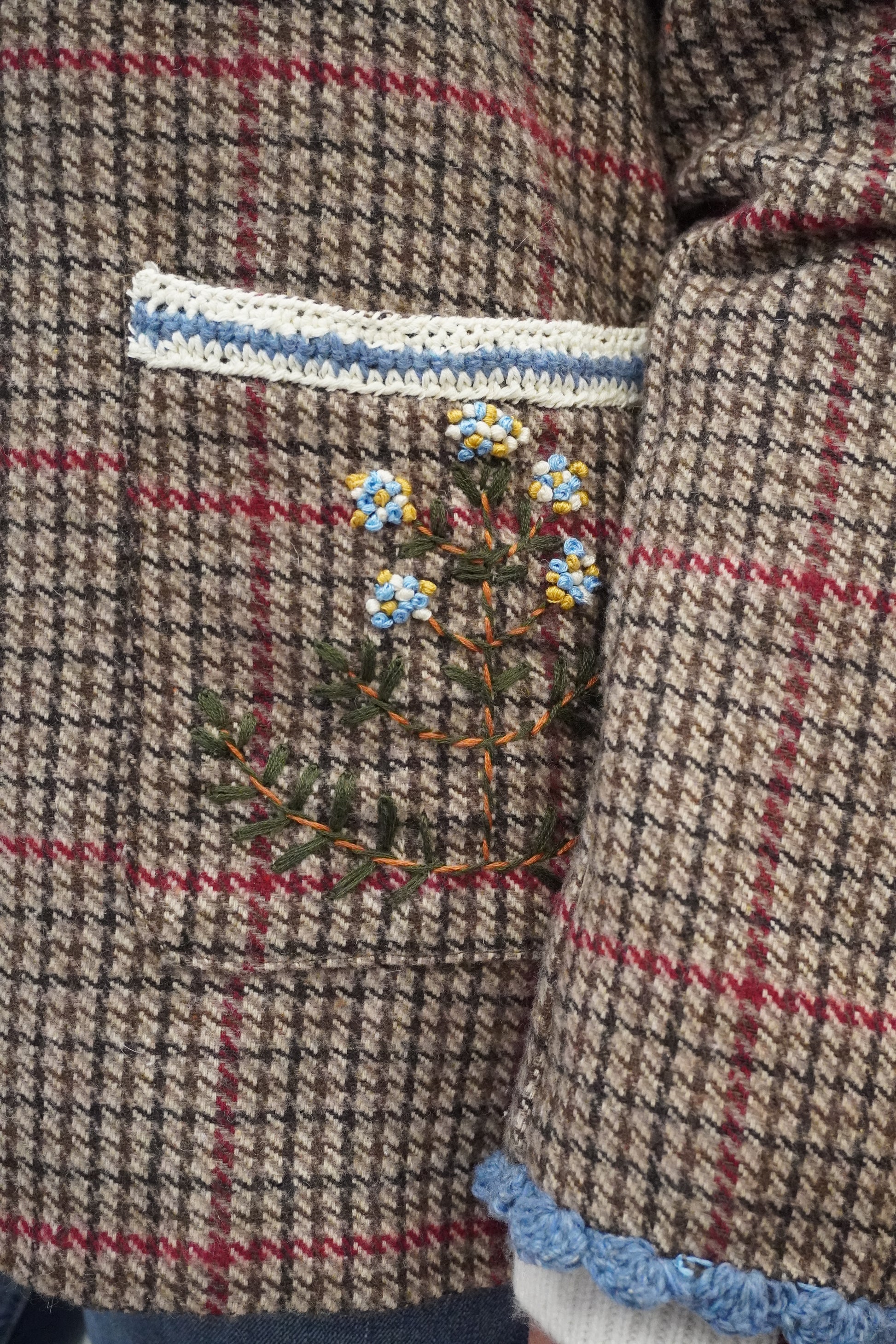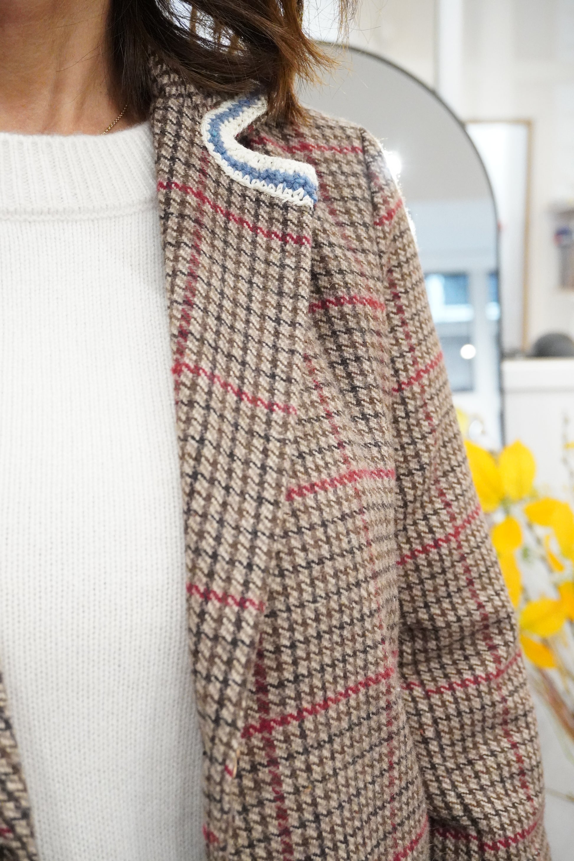 Blazer pied-de-poule droit et souple revisité avec un mix de broderies, détails au crochet et bijoux décoratifs sur le col. Coupe structurée mais confortable, avec des finitions contrastées sur les poches et les poignets. Un modèle travaillé qui apporte une touche originale mais facile à porter. Existe en deux coloris : bleu et rose.