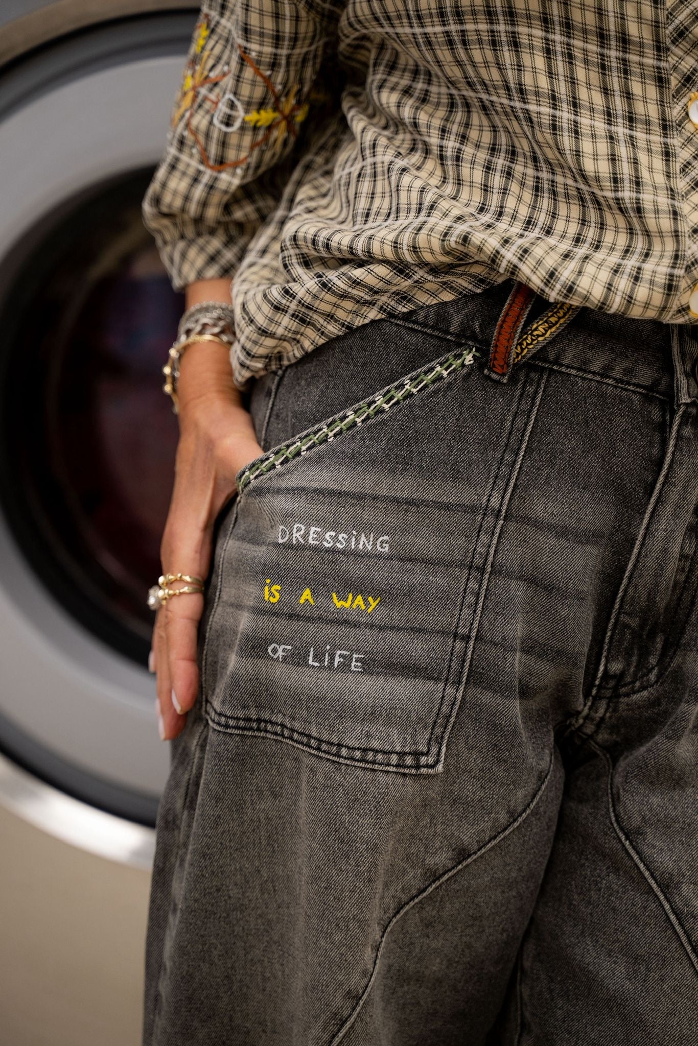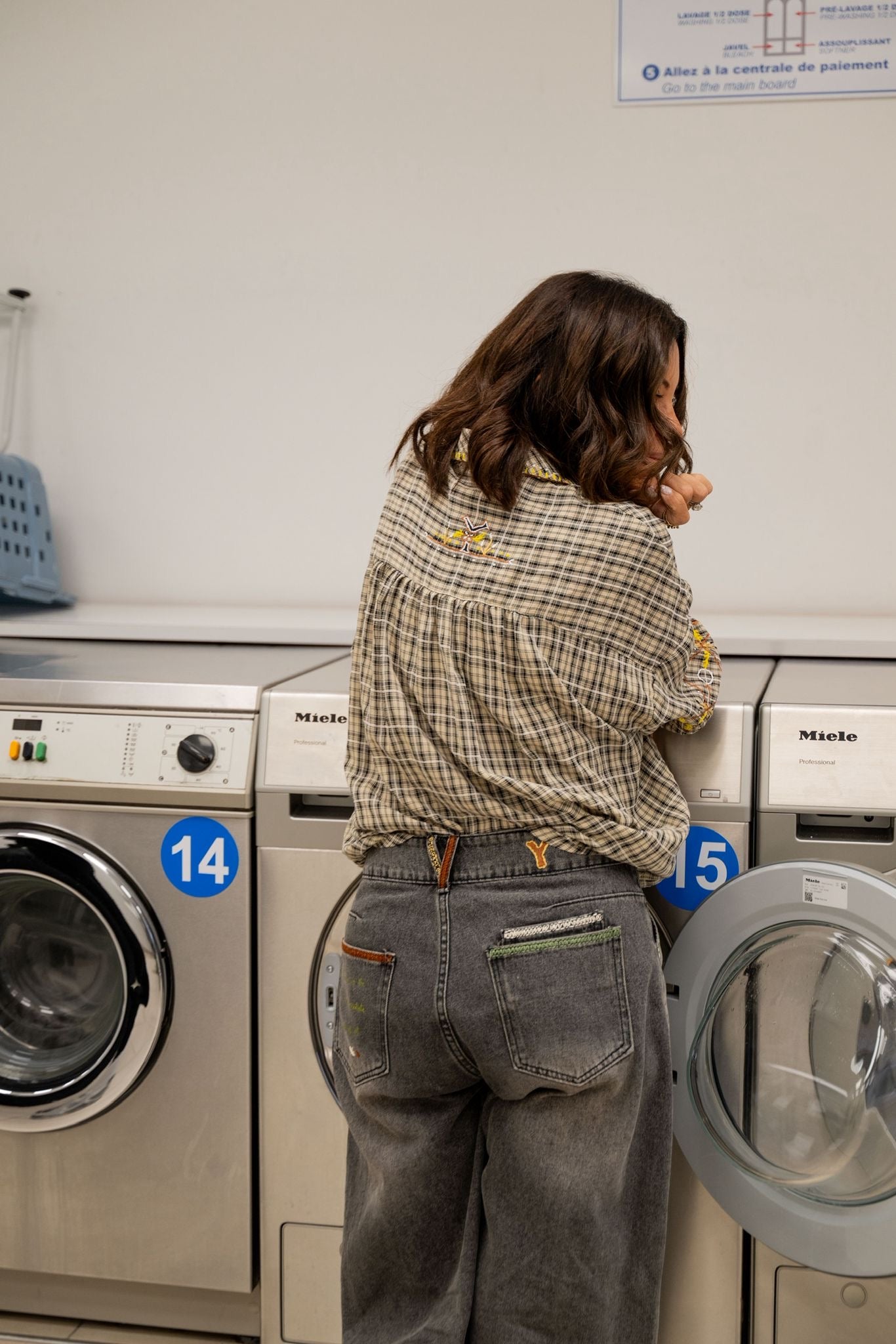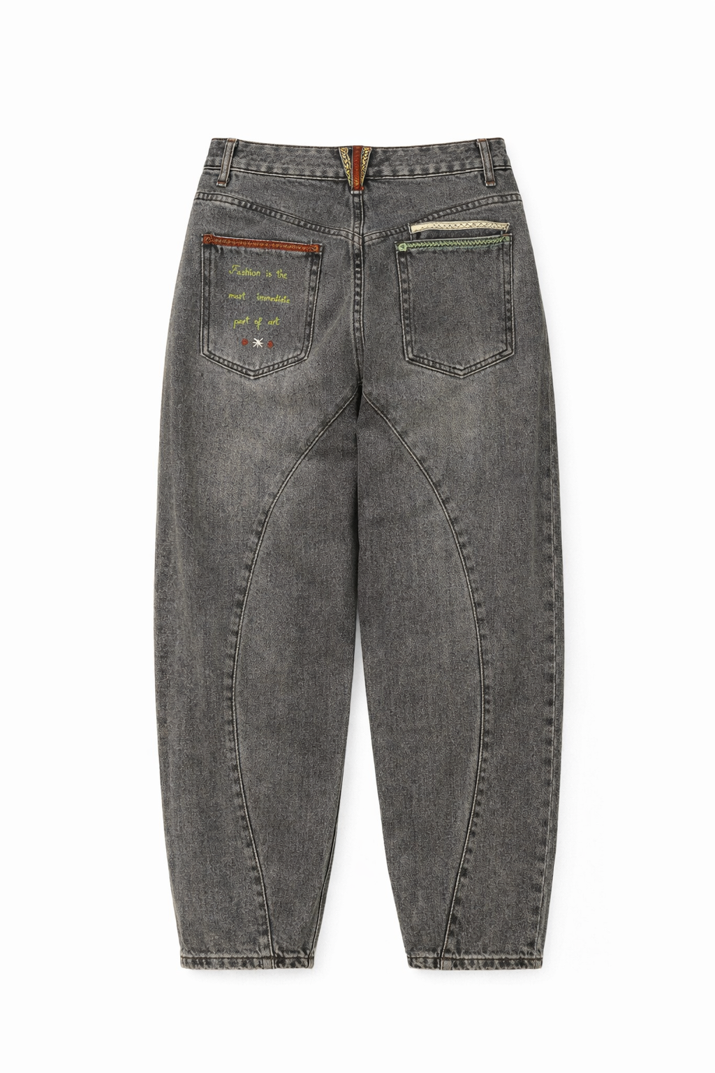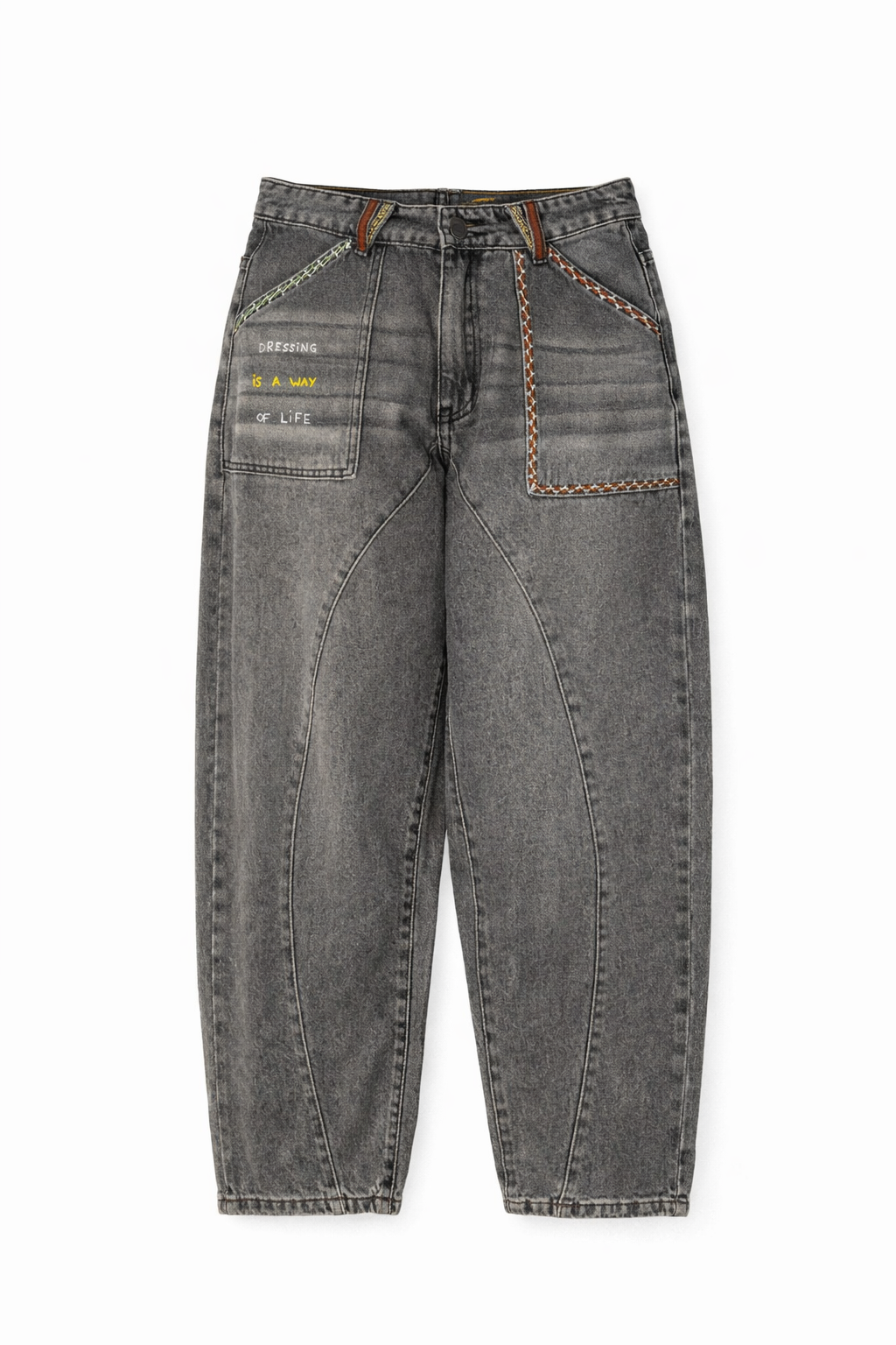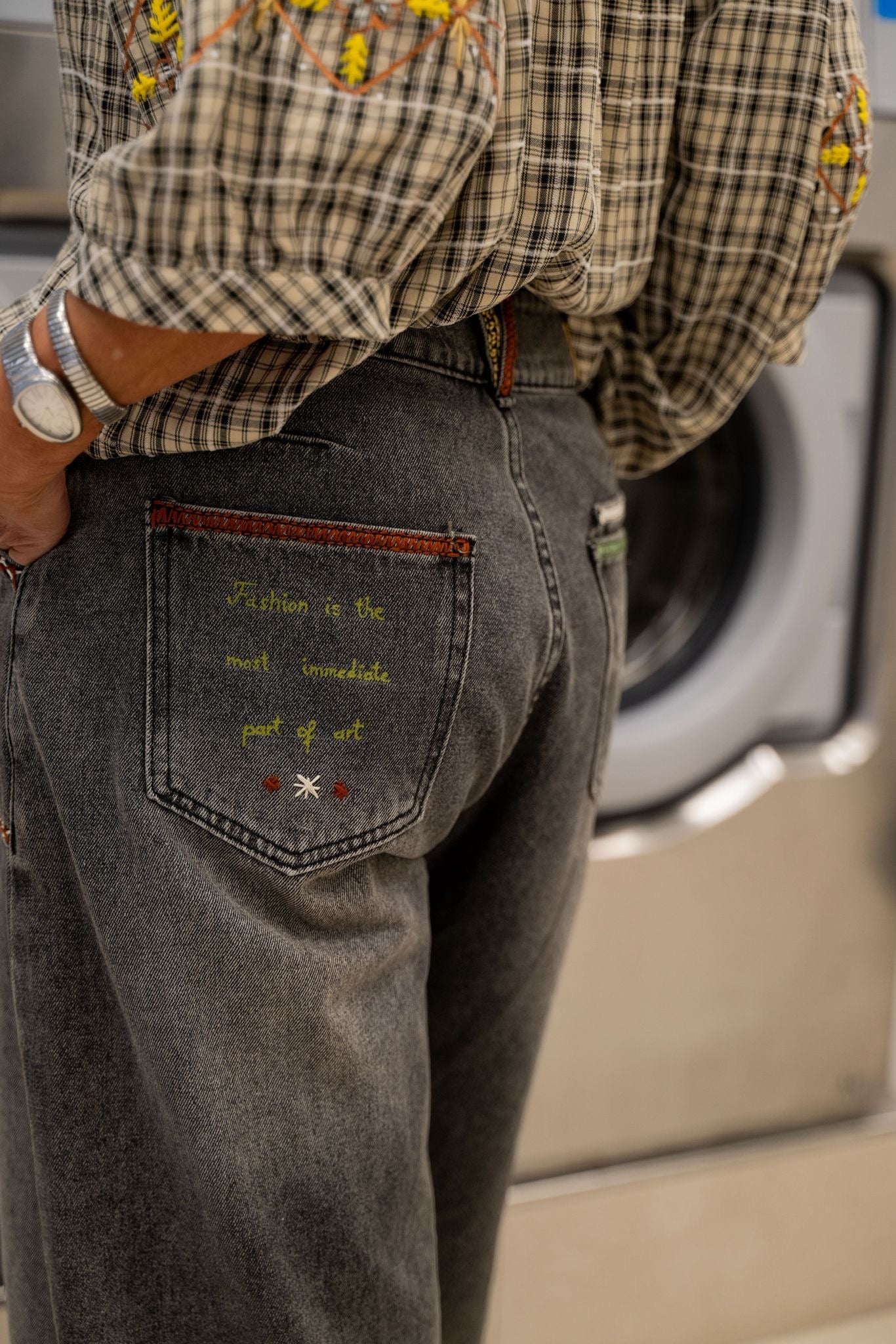 Jean gris, avec une coupe barrel, travaillé à la main avec un mix de broderies et de peinture. Détails colorés pour une touche graphique discrète mais originale. Denim souple et confortable, facile à porter au quotidien.