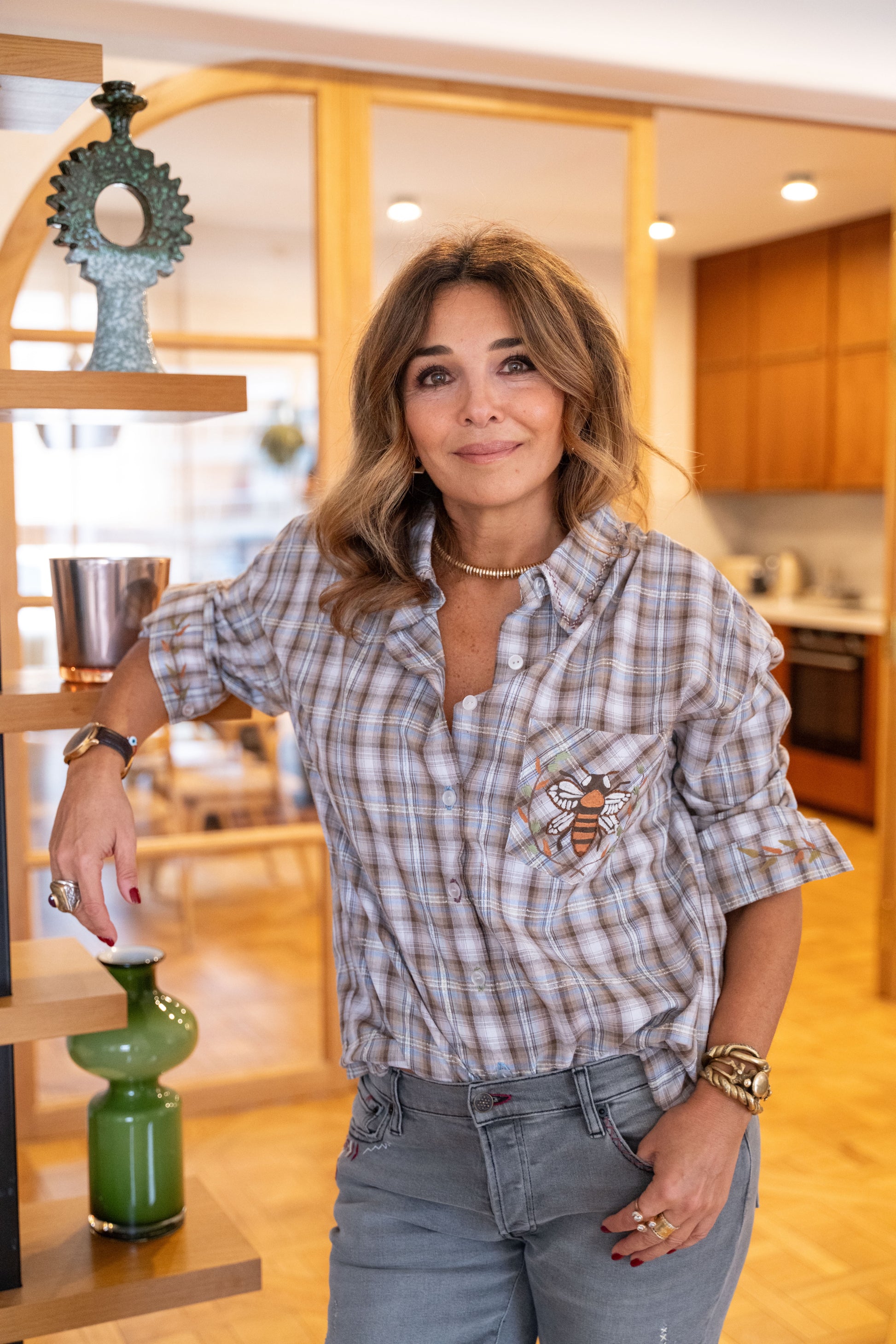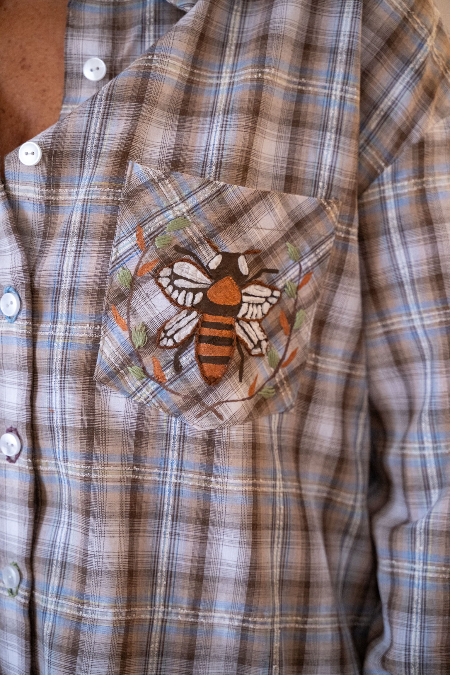 Chemise à carreaux fluide, détails de broderie et de peinture textile, le tout réalisé à la main dans notre atelier parisien, pour un style à la fois chic et original.