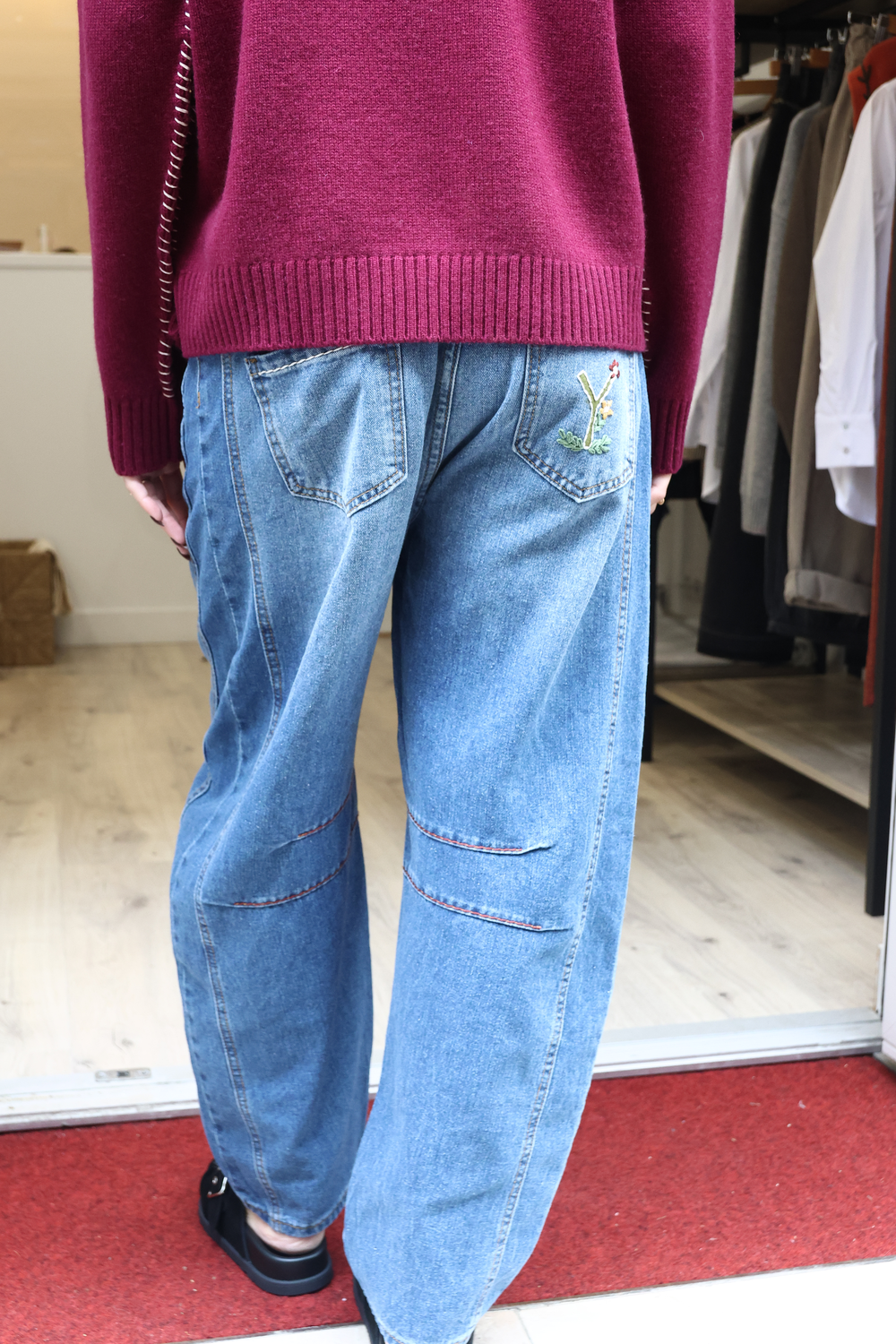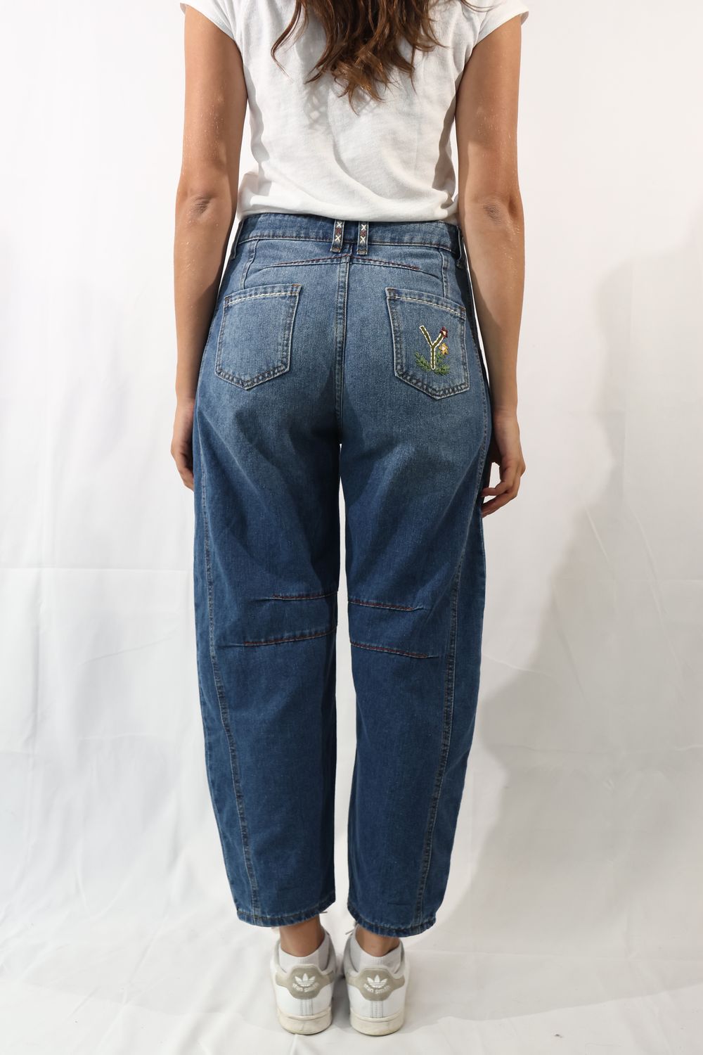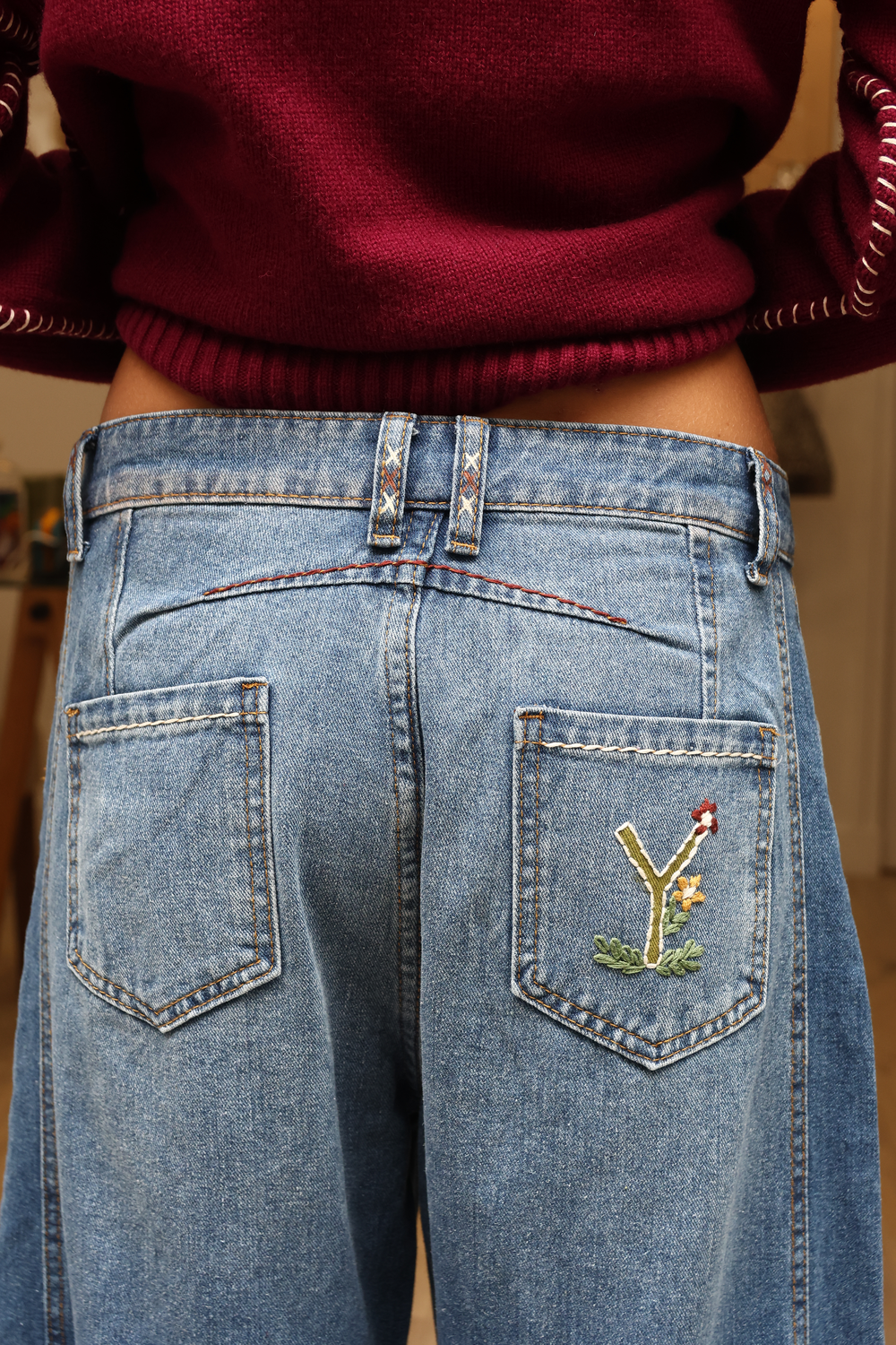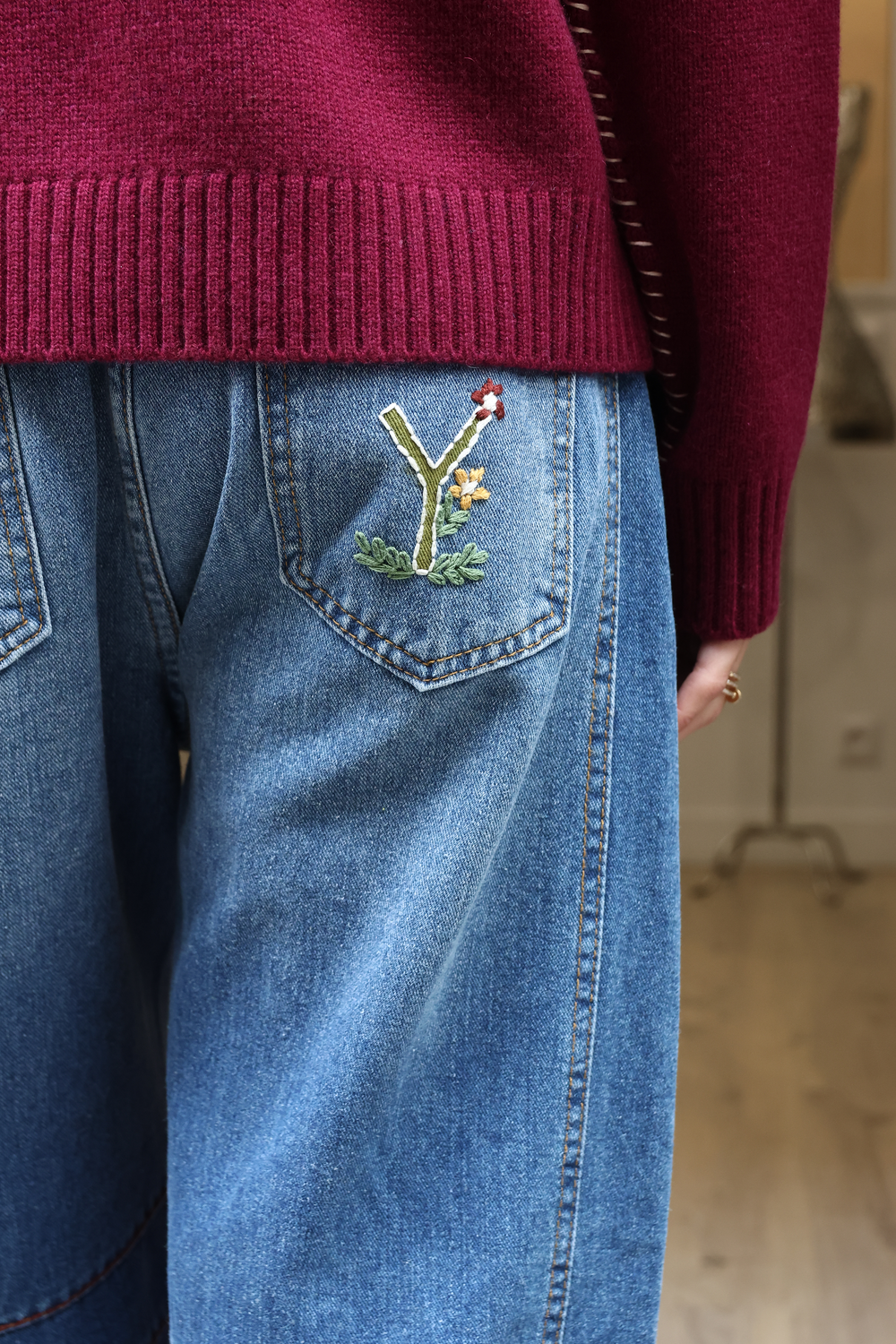 Jean barrel, revisité avec des broderies et peintures raffinées, réalisées à la main.