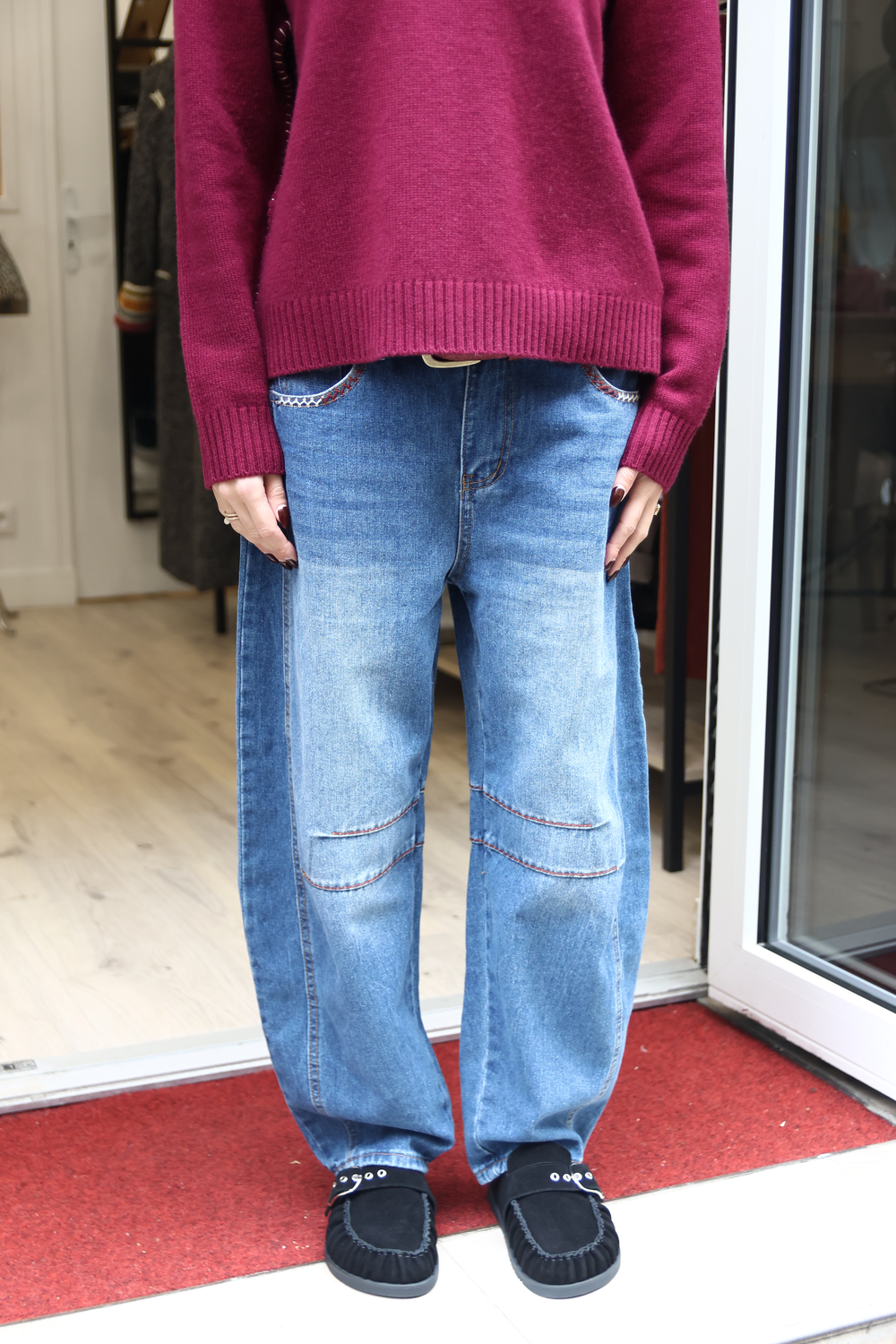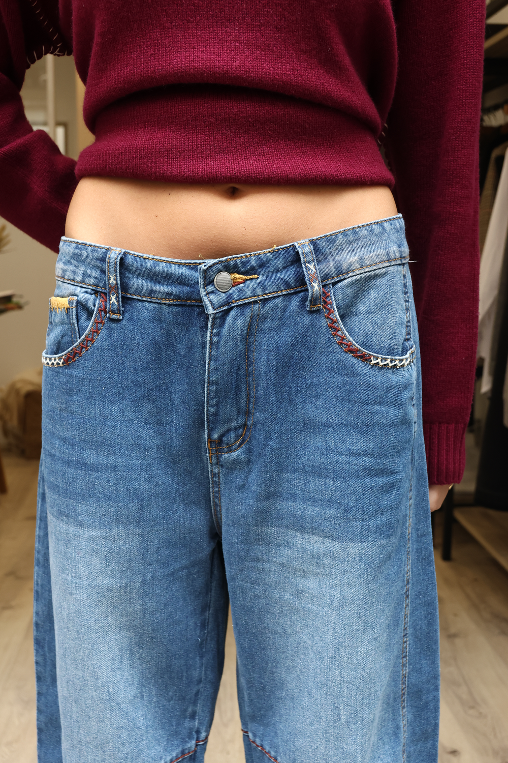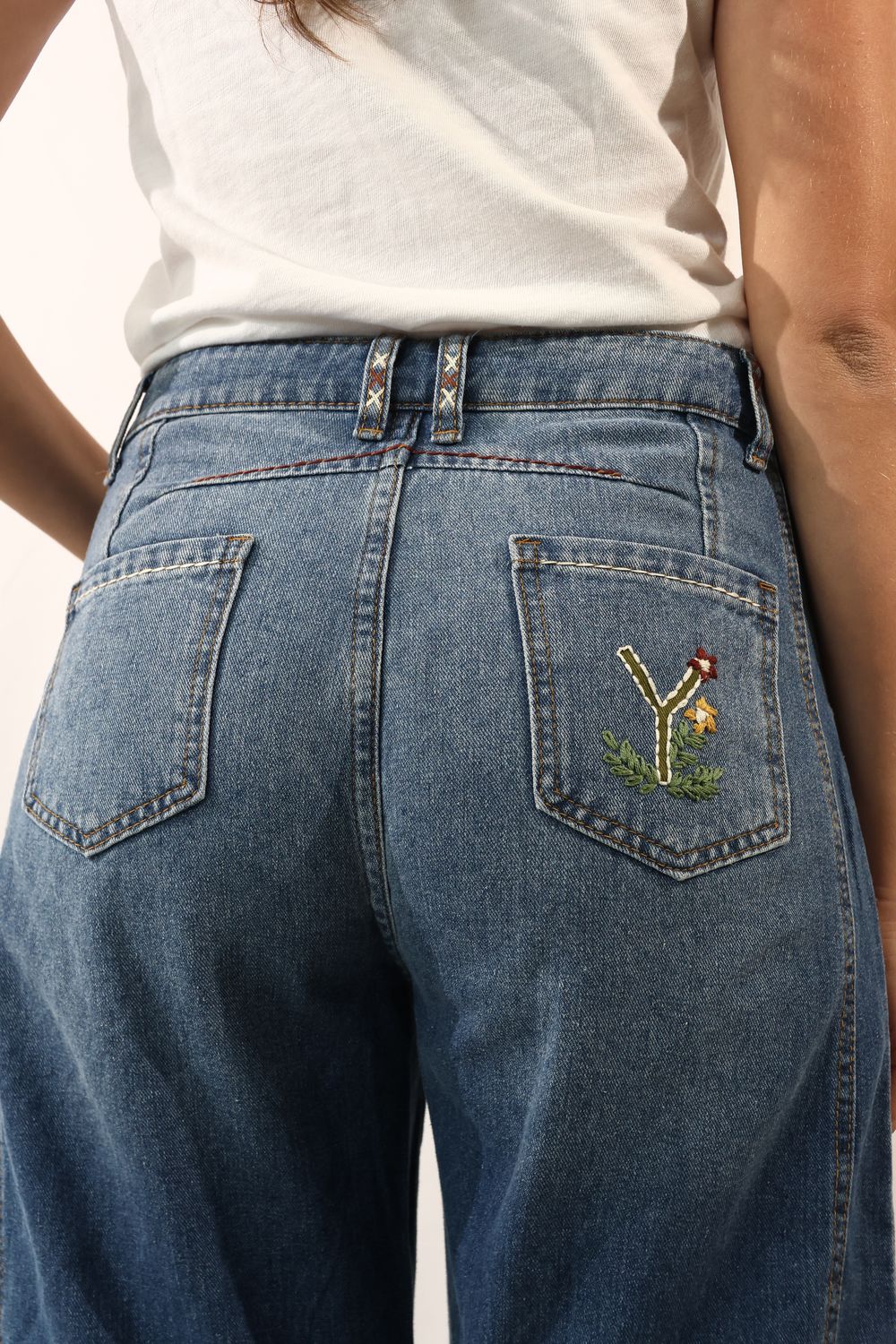 Jean barrel, revisité avec des broderies et peintures raffinées, réalisées à la main.