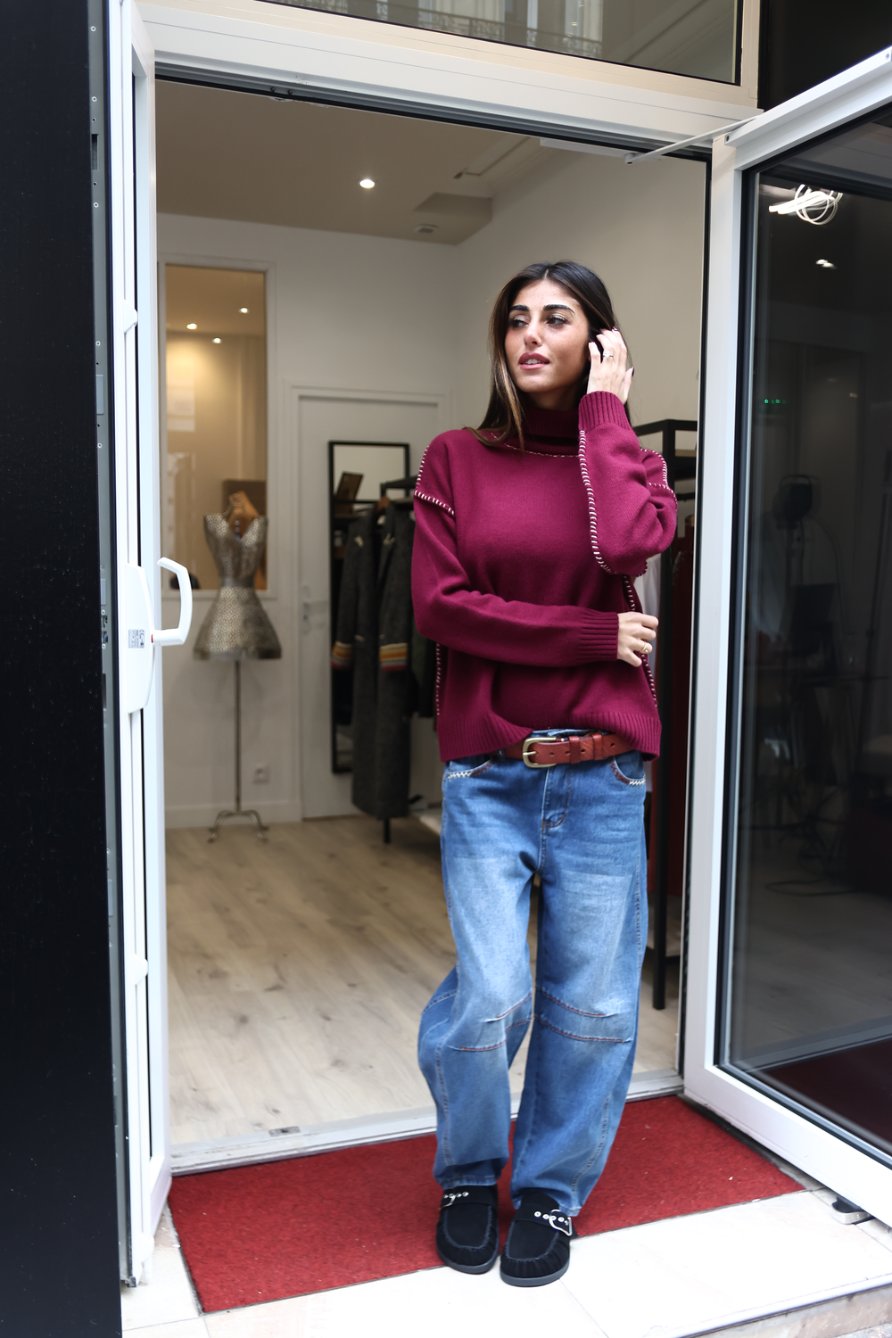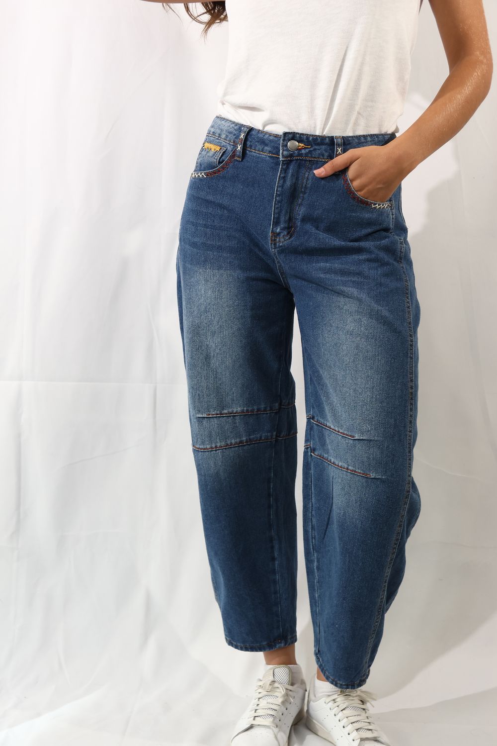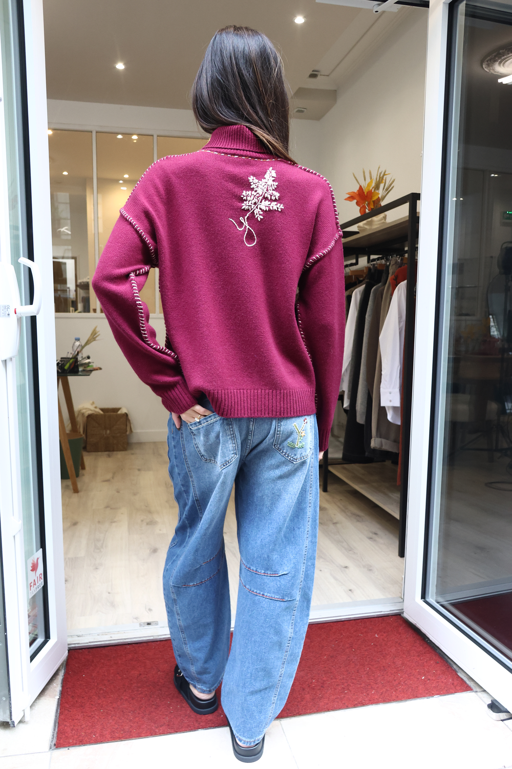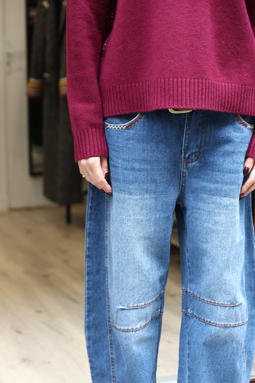 Jean barrel, revisité avec des broderies et peintures raffinées, réalisées à la main.