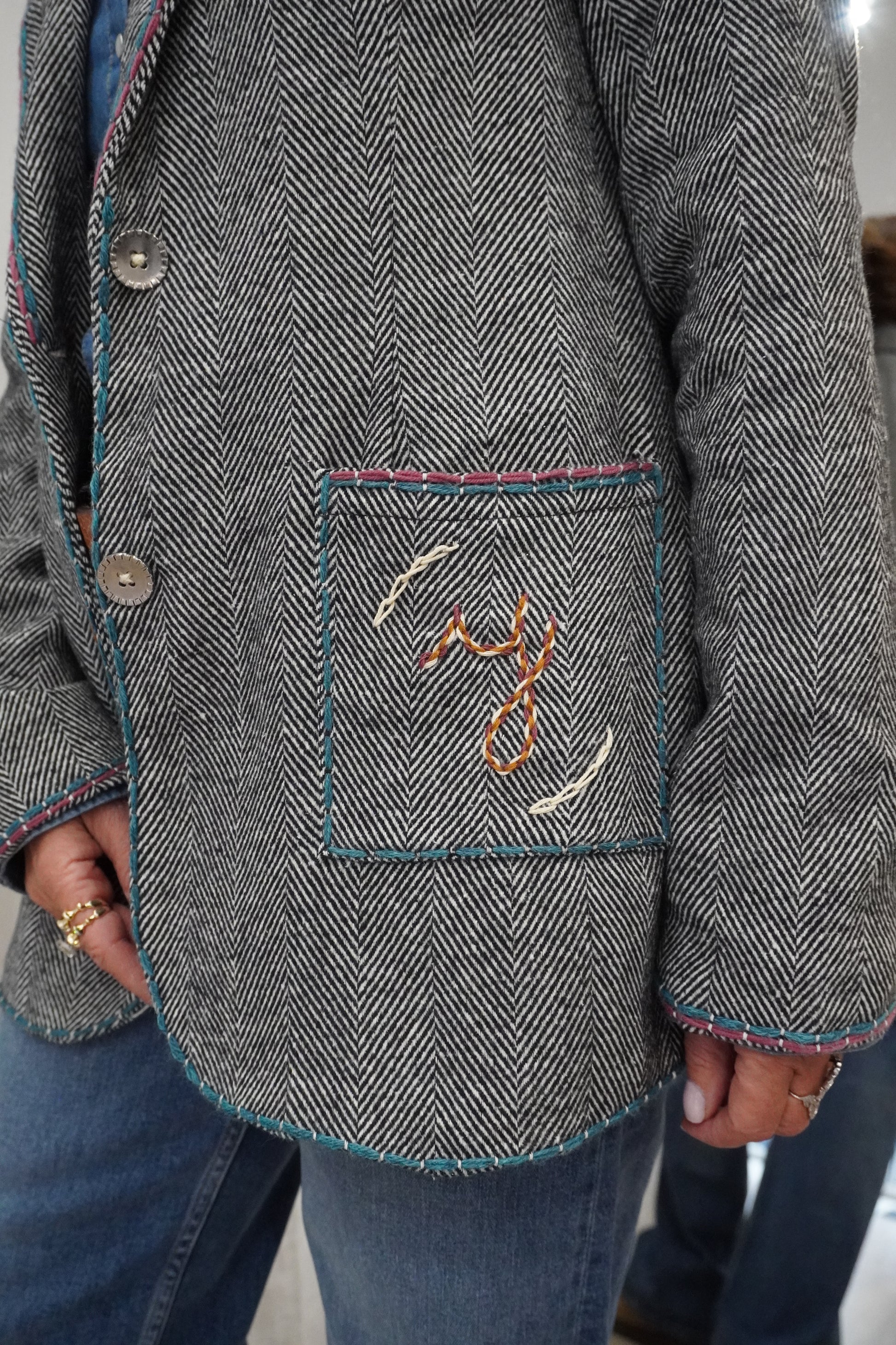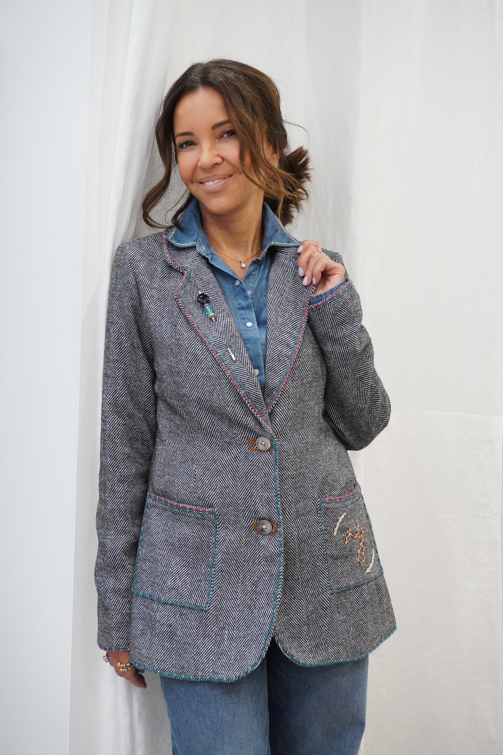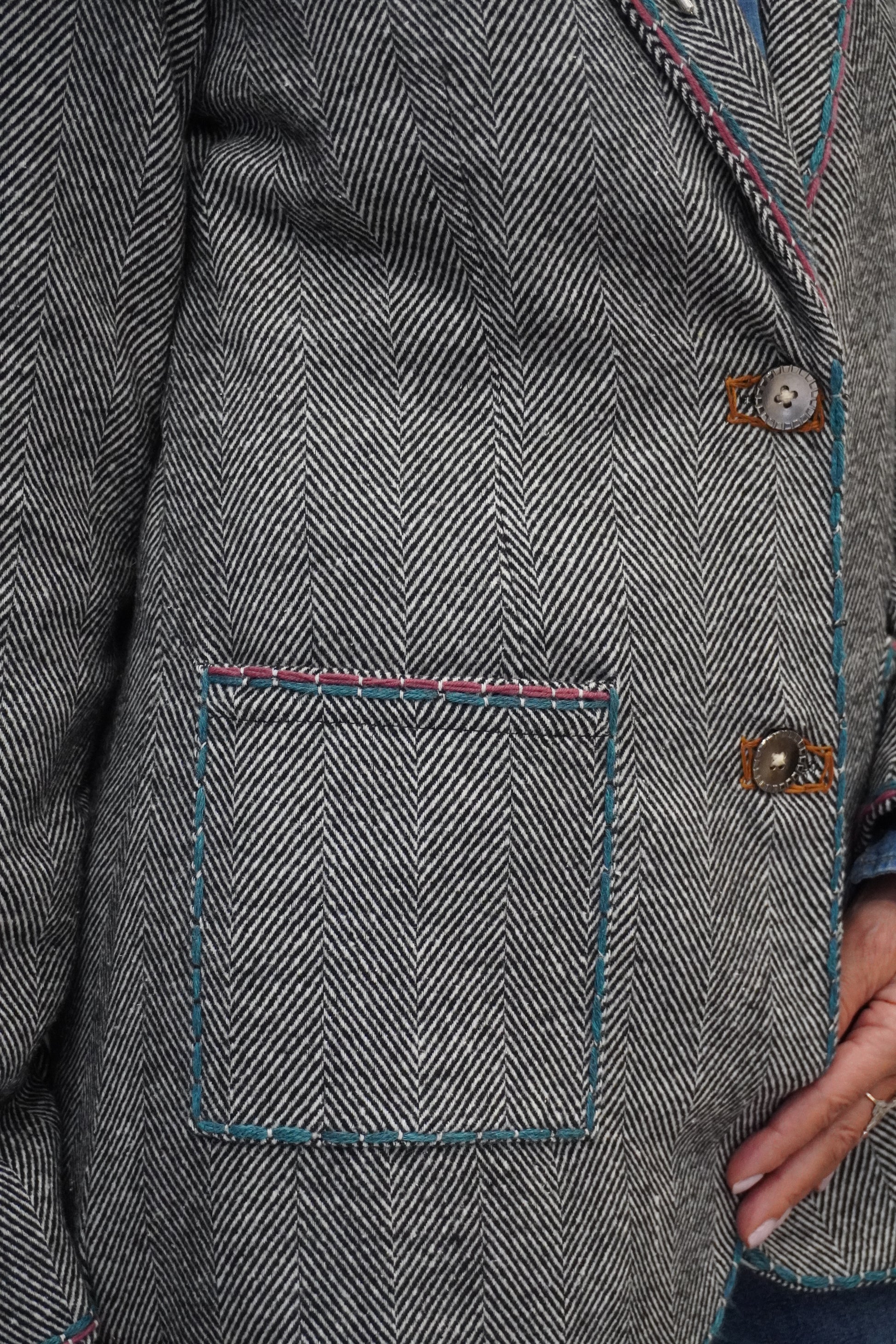 Blazer droit et souple en chevron gris, revisité avec des broderies contrastées et un bijoux sur le col. Les broderies réalisées à la main apportent du relief au blazer et une touche d'originalité. Une pièce forte qui donne du caractère à n’importe quel look.