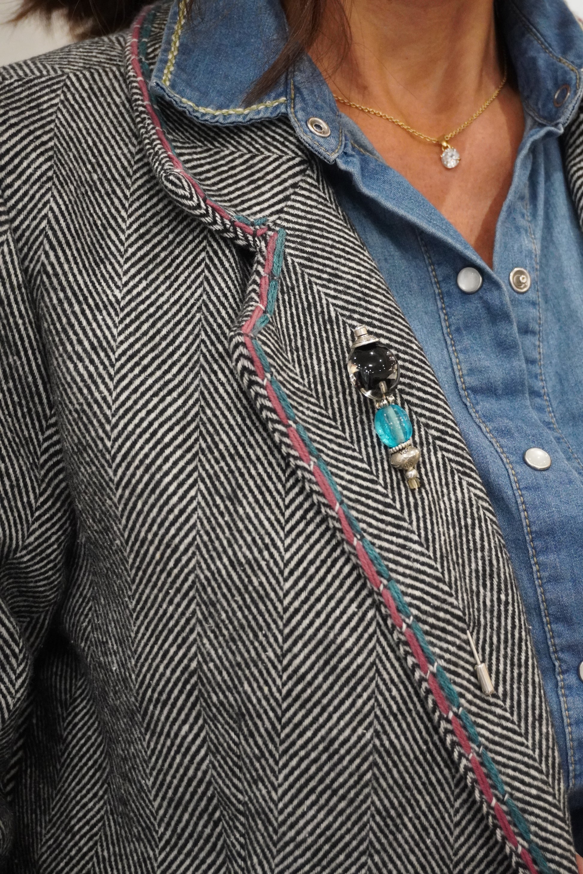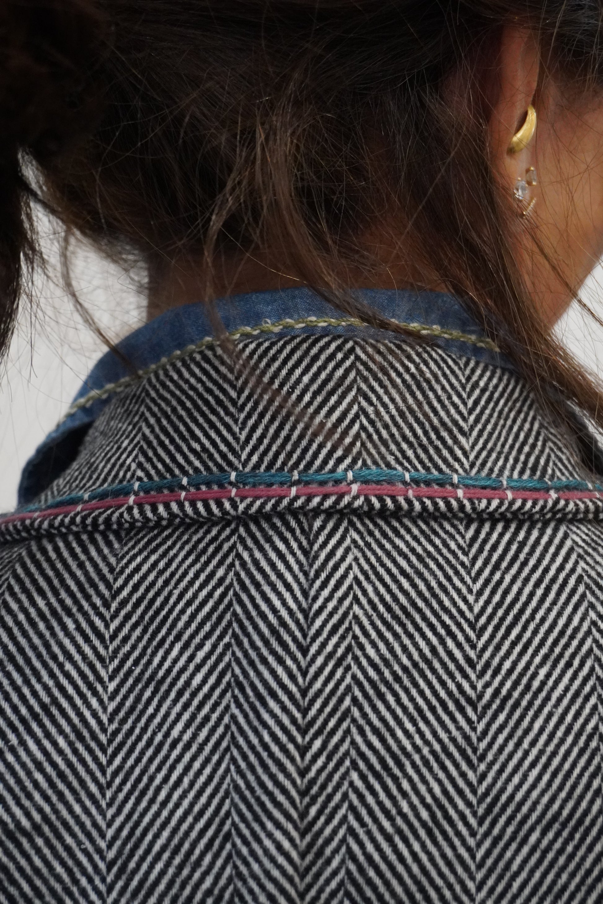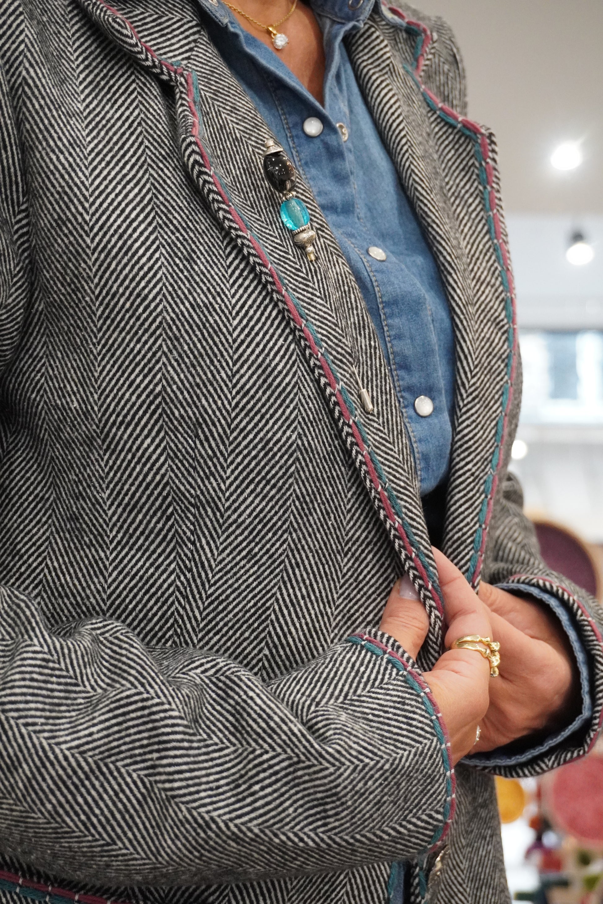 Blazer droit et souple en chevron gris, revisité avec des broderies contrastées et un bijoux sur le col. Les broderies réalisées à la main apportent du relief au blazer et une touche d'originalité. Une pièce forte qui donne du caractère à n’importe quel look.