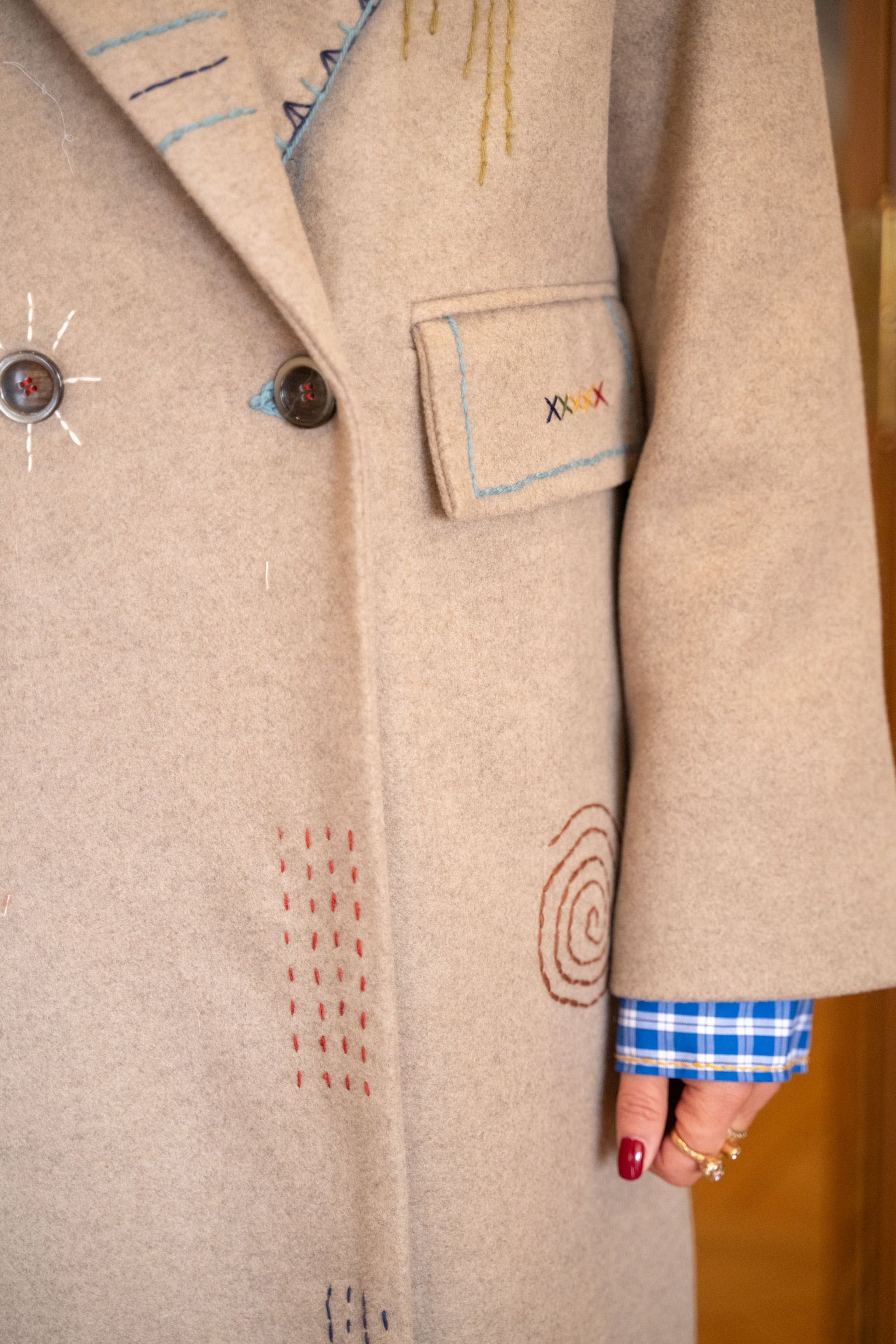 Manteau long beige uni entièrement brodé à la main avec des motifs colorés placés sur l’avant, le col, les poches et le dos. Coupe droite, élégante et confortable, qui apporte une touche graphique tout en restant très facile à porter au quotidien.