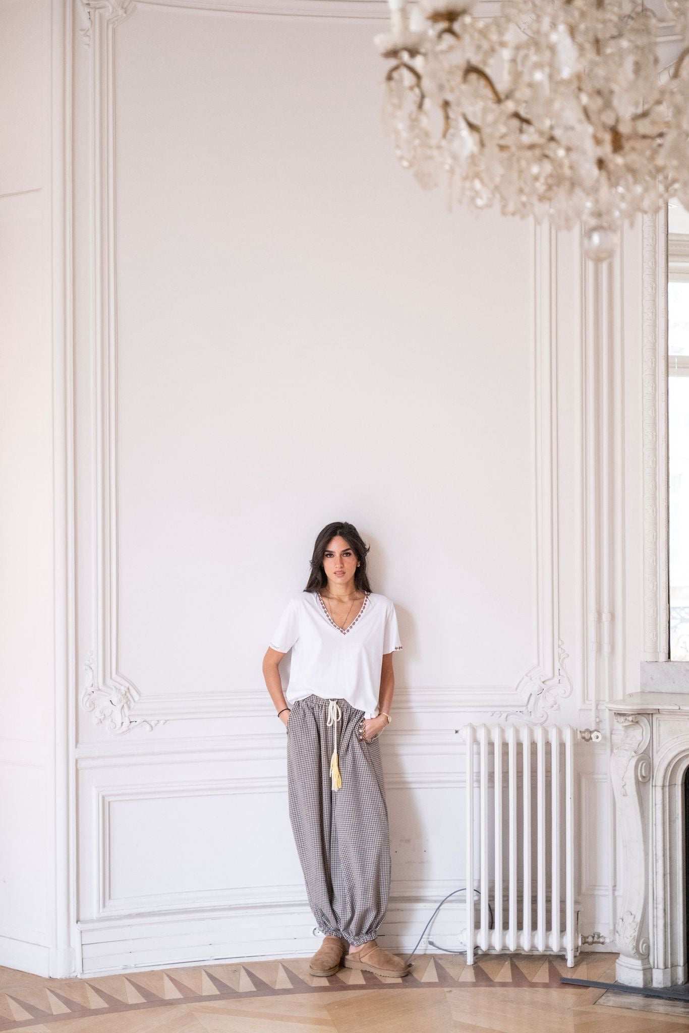 Pantalon à motif vichy marron, à la coupe fluide et confortable, doté d’une taille élastiquée pour un porté naturel. Il est rehaussé de broderies délicates le long des côtés et d’un lien en crochet à la taille, apportant une touche artisanale subtile. Une pièce au style affirmé, idéale pour un vestiaire quotidien à l’esprit bohème chic.