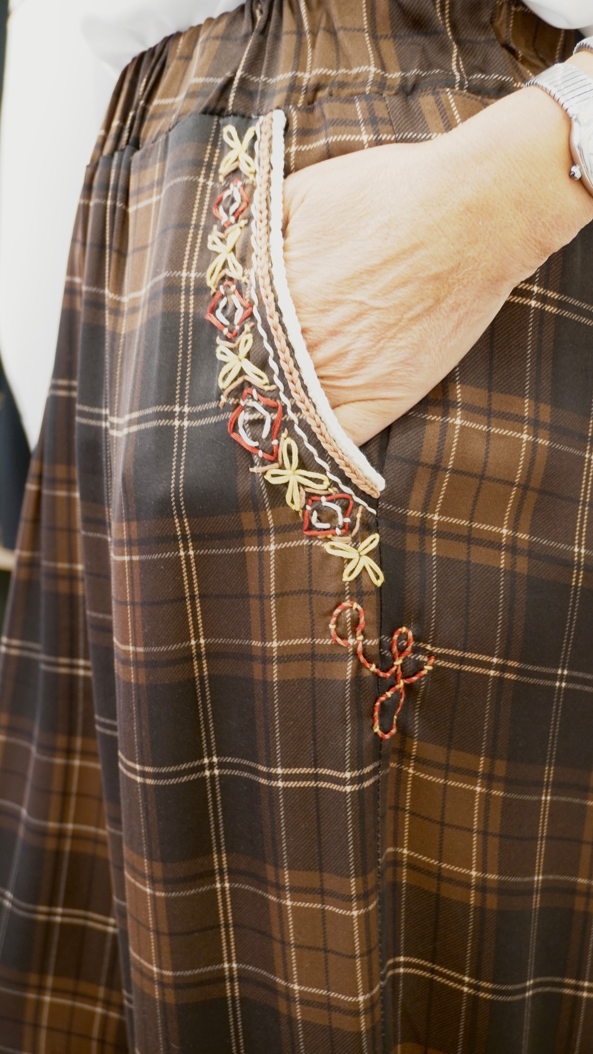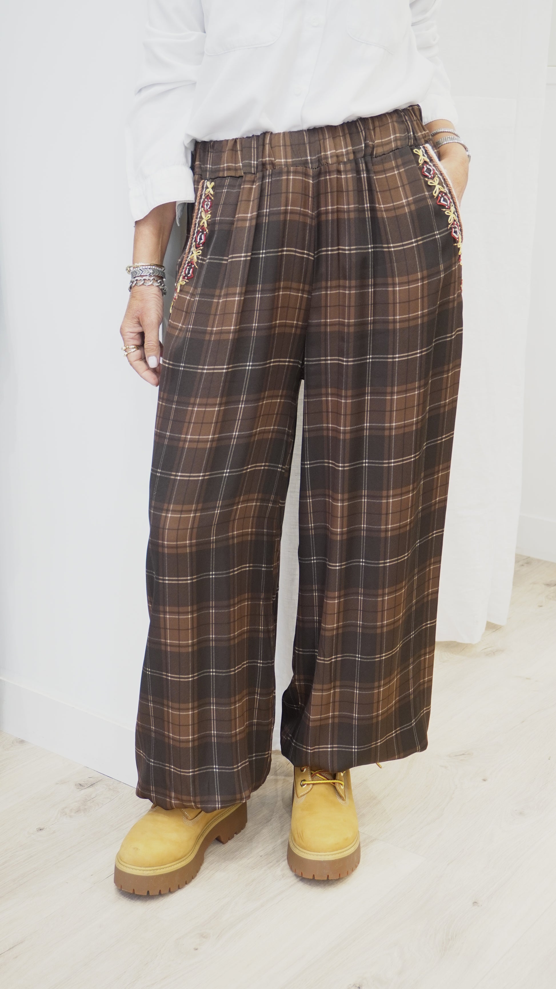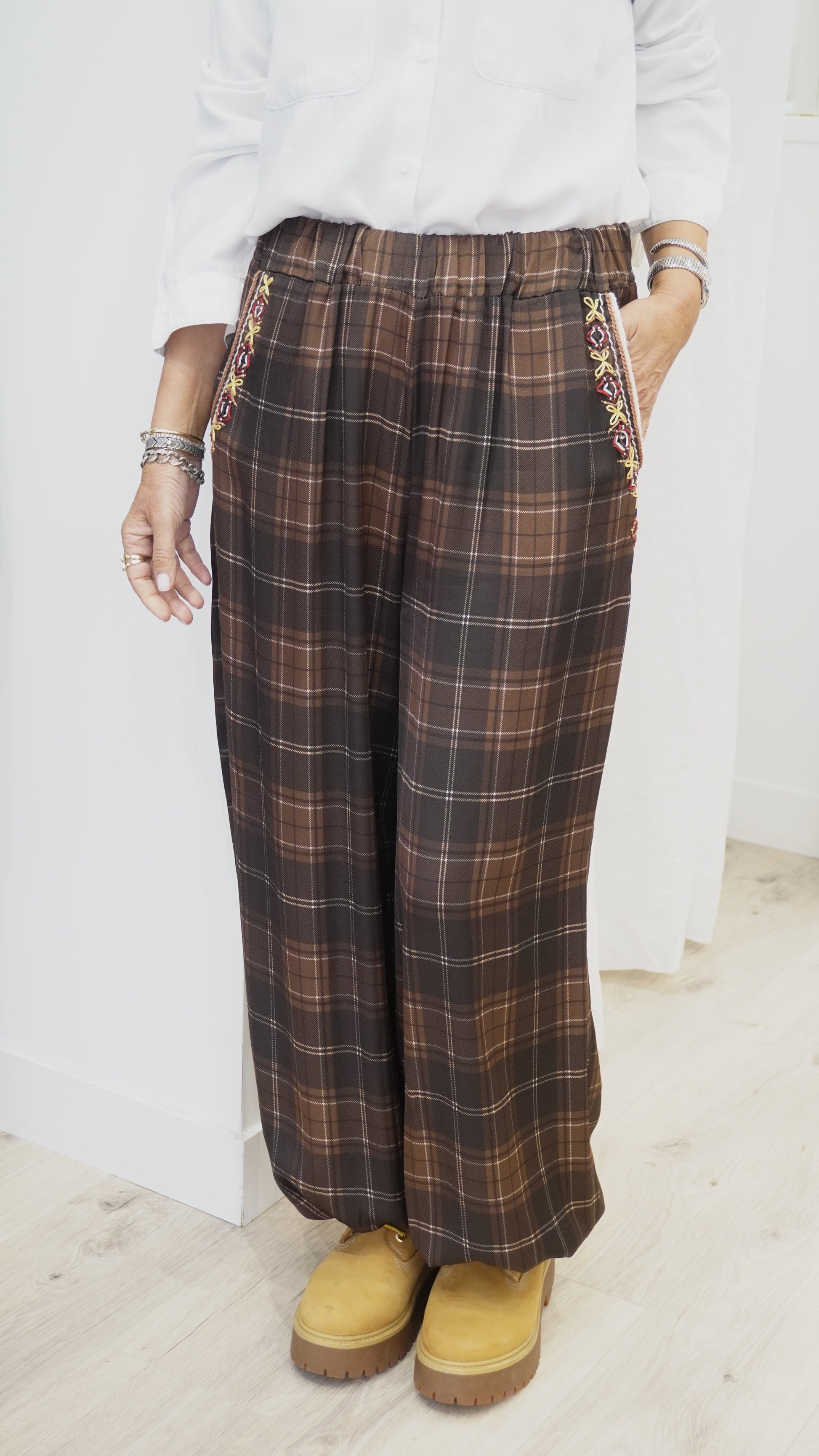 Ce pantalon fluide marron à carreaux revisite l’élégance décontractée avec une touche artisanale. Travaillé à la main, il se distingue par des finitions en crochet et des broderies discrètes qui lui confèrent un caractère unique.