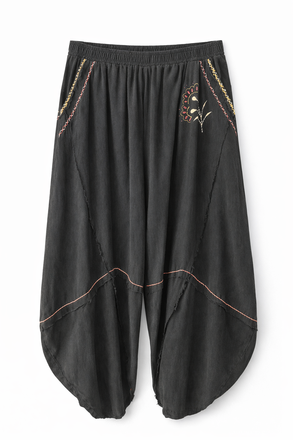 Sarouel à la coupe ample et confortable, conçu pour un style décontracté et original. Cette pièce est travaillée avec un mélange de peinture et de broderie, apportant une touche artisanale unique et subtile. Sa taille élastique et son tissu fluide offrent une grande liberté de mouvement au quotidien.
