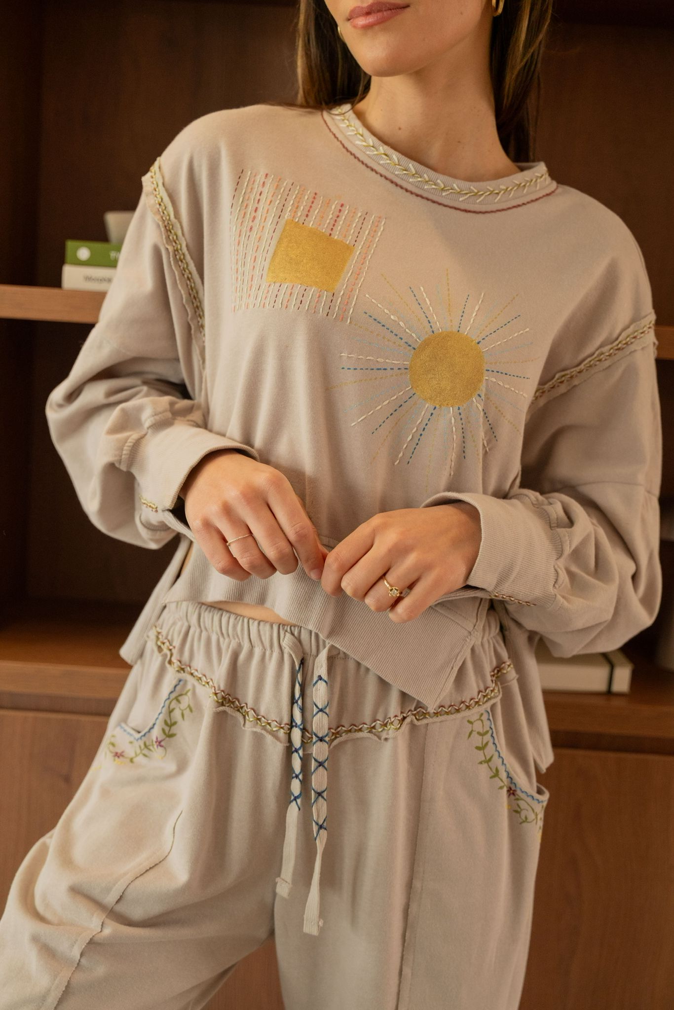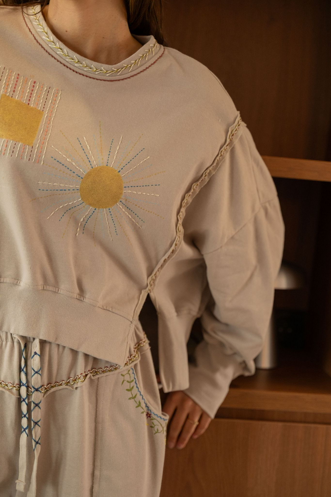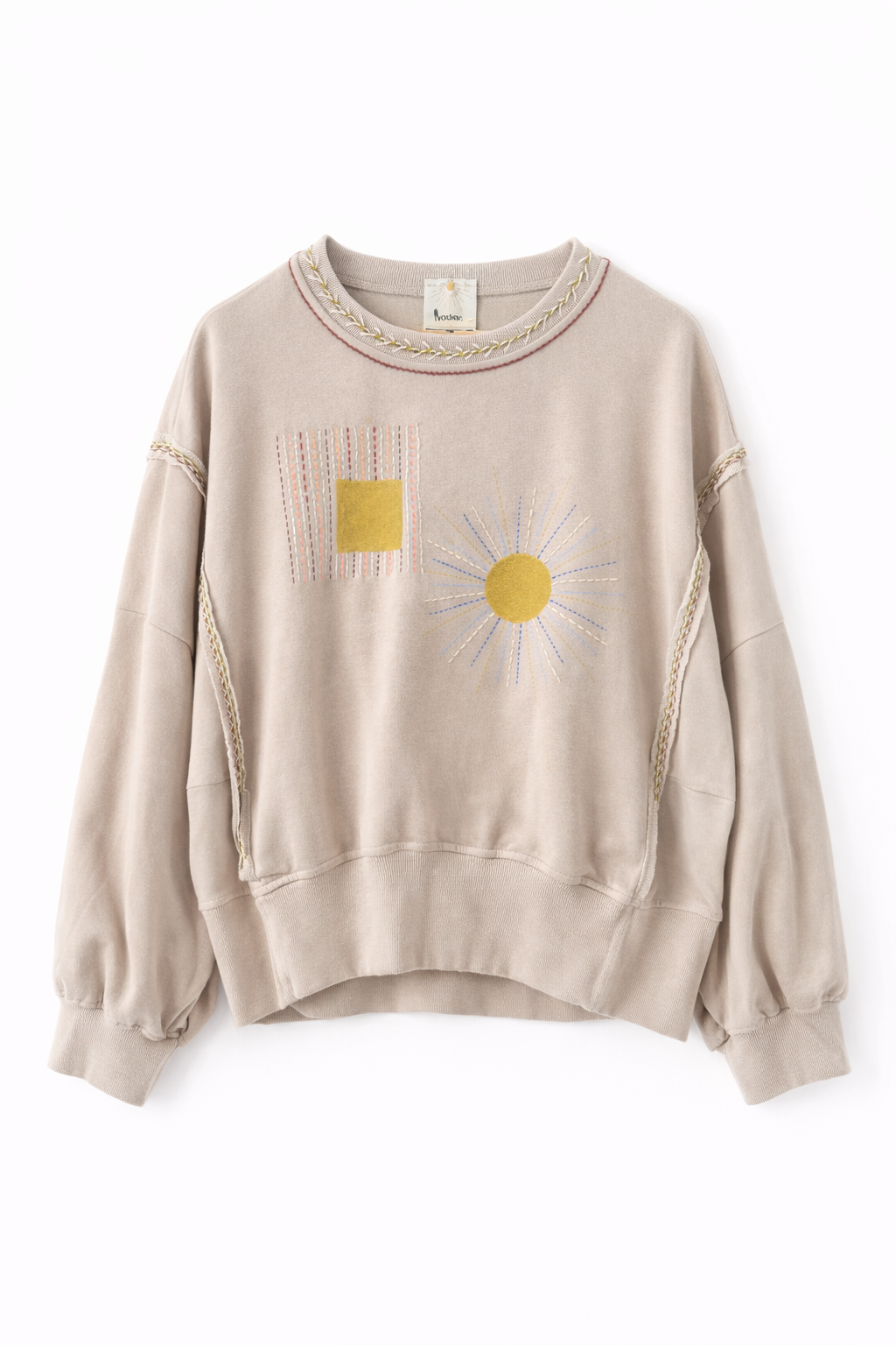 Sweat beige à la coupe confortable, décoré de broderies et peintures graphiques et solaires sur le devant. Les finitions tressées au col et le long des manches apportent une touche artisanale et originale.