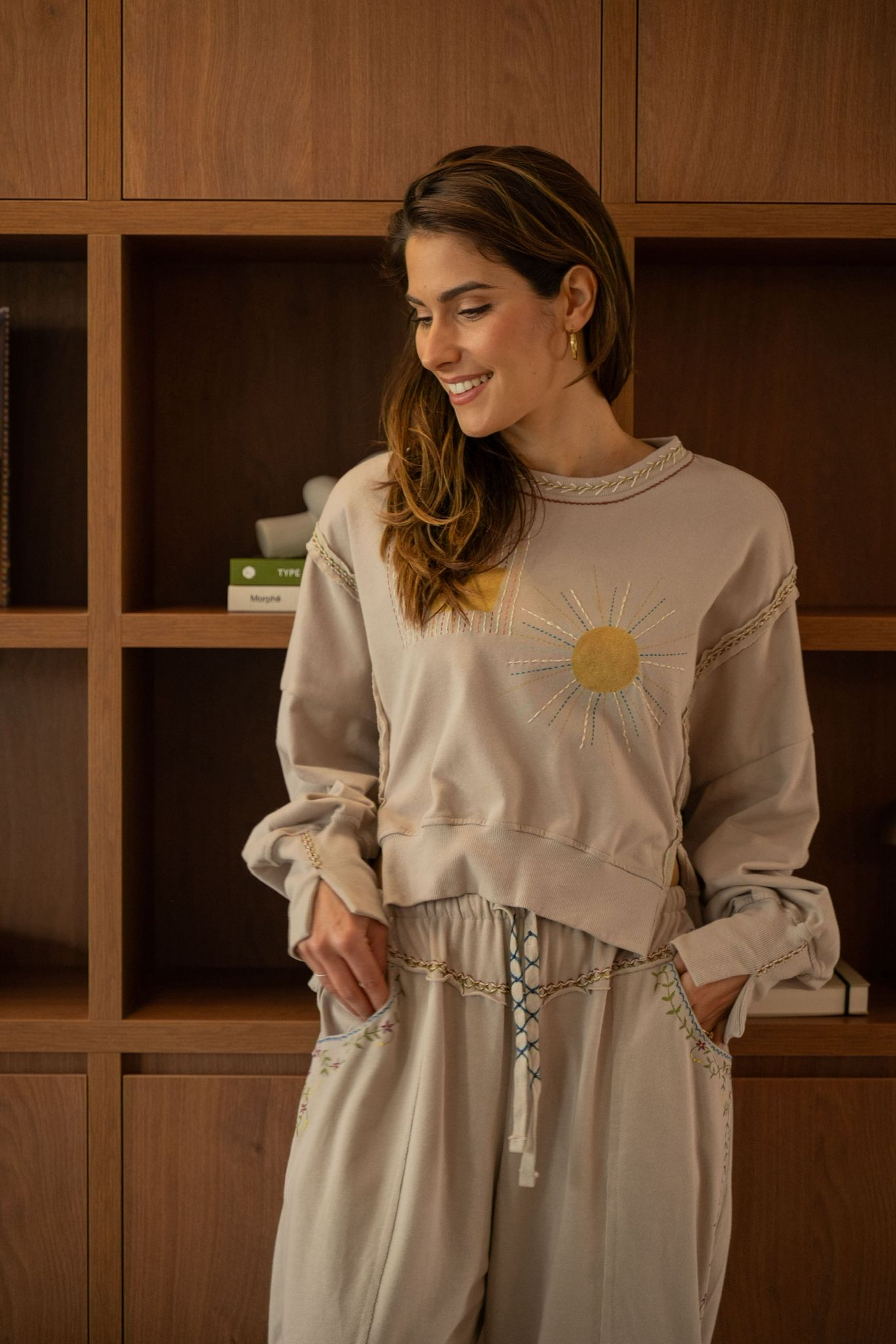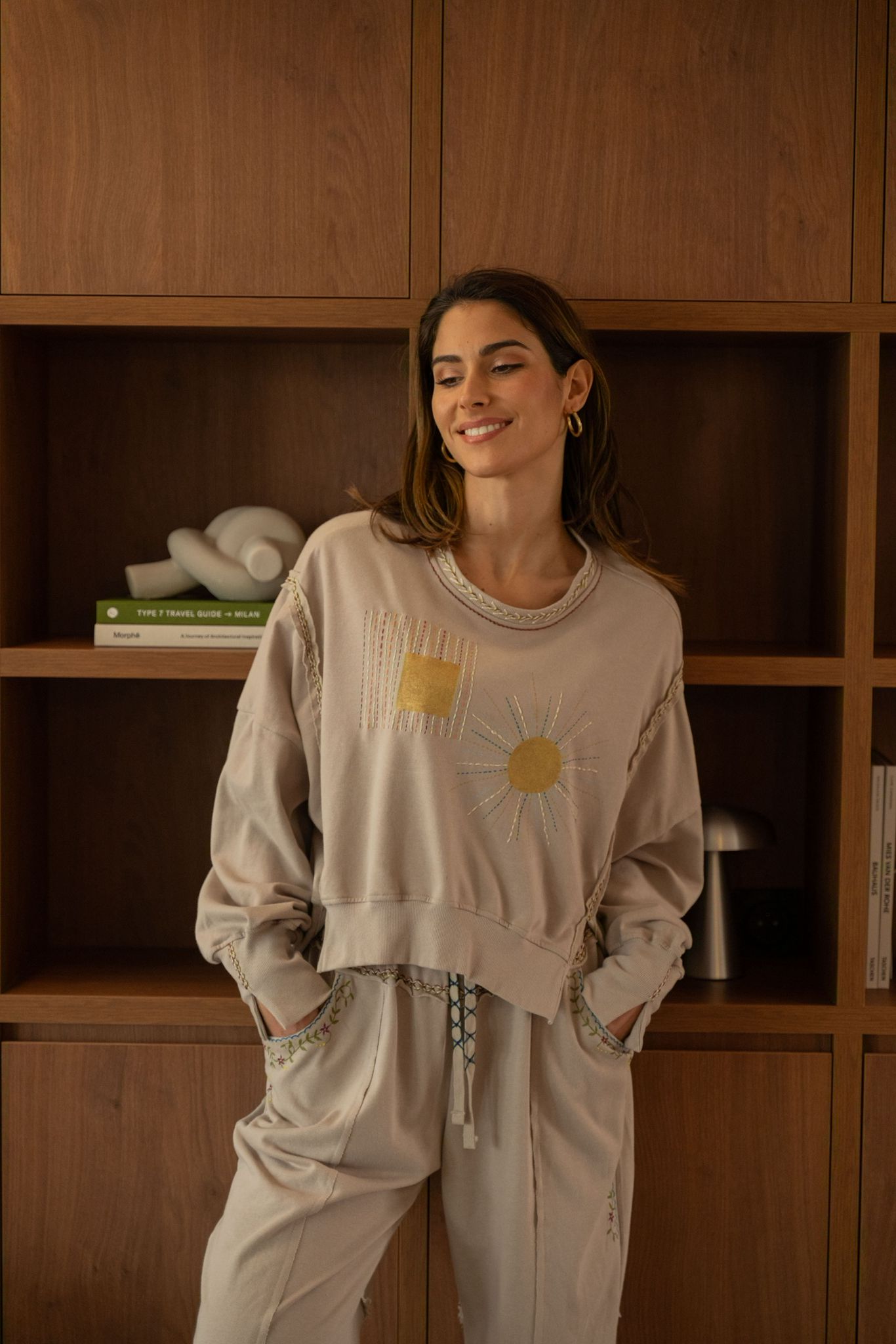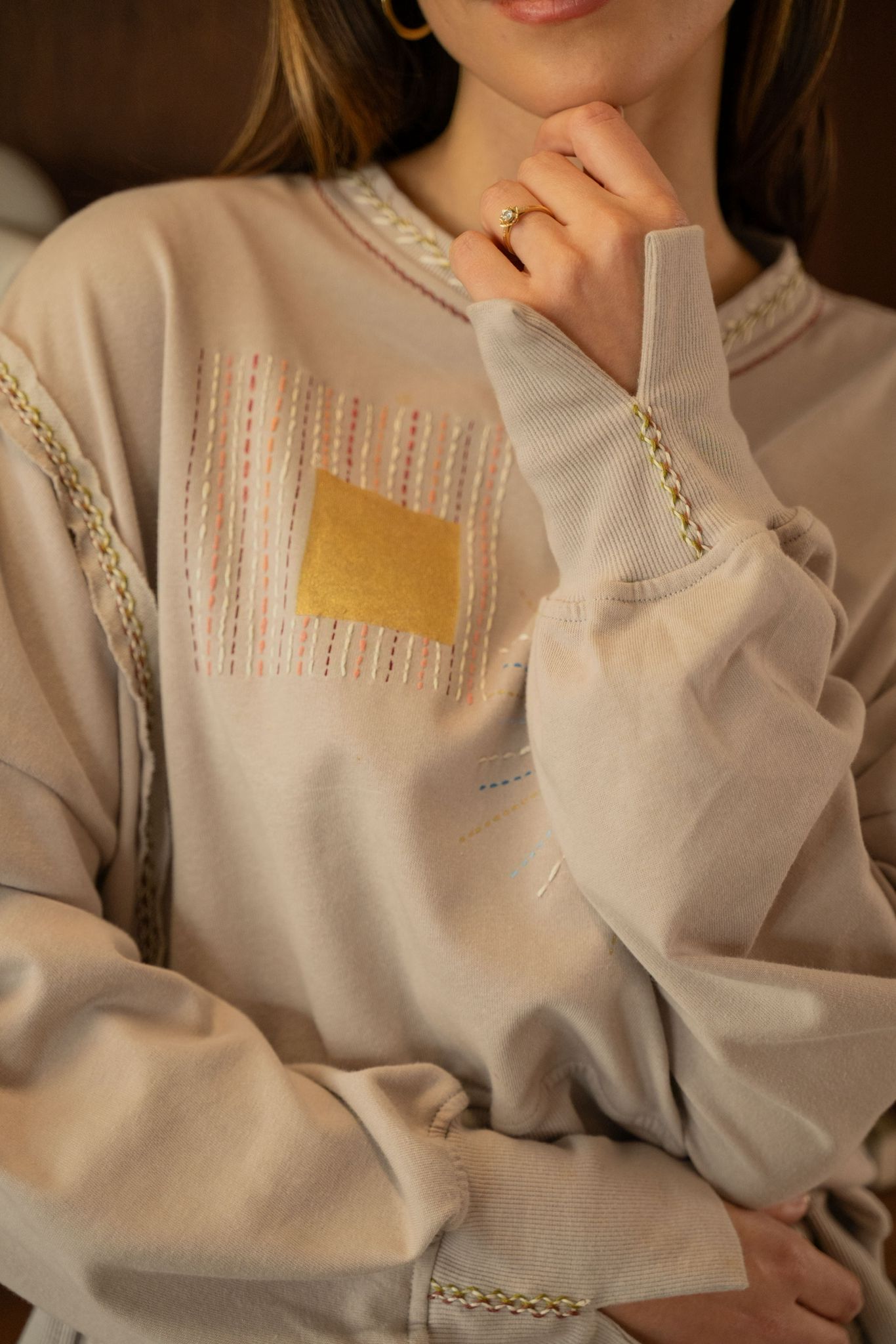 Sweat beige à la coupe confortable, décoré de broderies et peintures graphiques et solaires sur le devant. Les finitions tressées au col et le long des manches apportent une touche artisanale et originale.