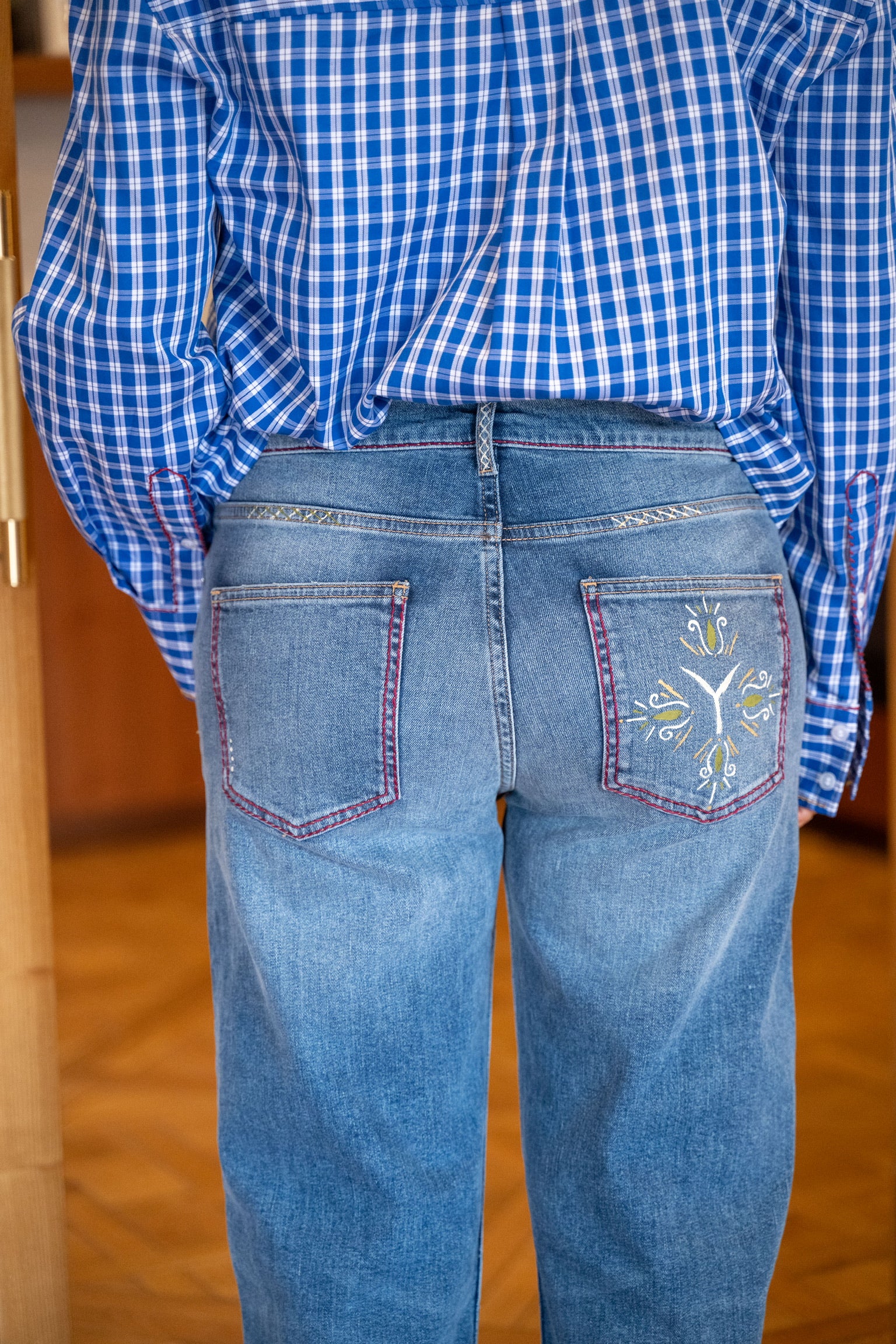 Jean bleu coupe droite avec broderies bordeaux et touches de peinture discrètes. Détails contrastés visibles sur la ceinture, les poches avant et l’une des poches arrière. Un denim confortable avec de l'élasthanne, qui est parfait à porter au quotidien.
