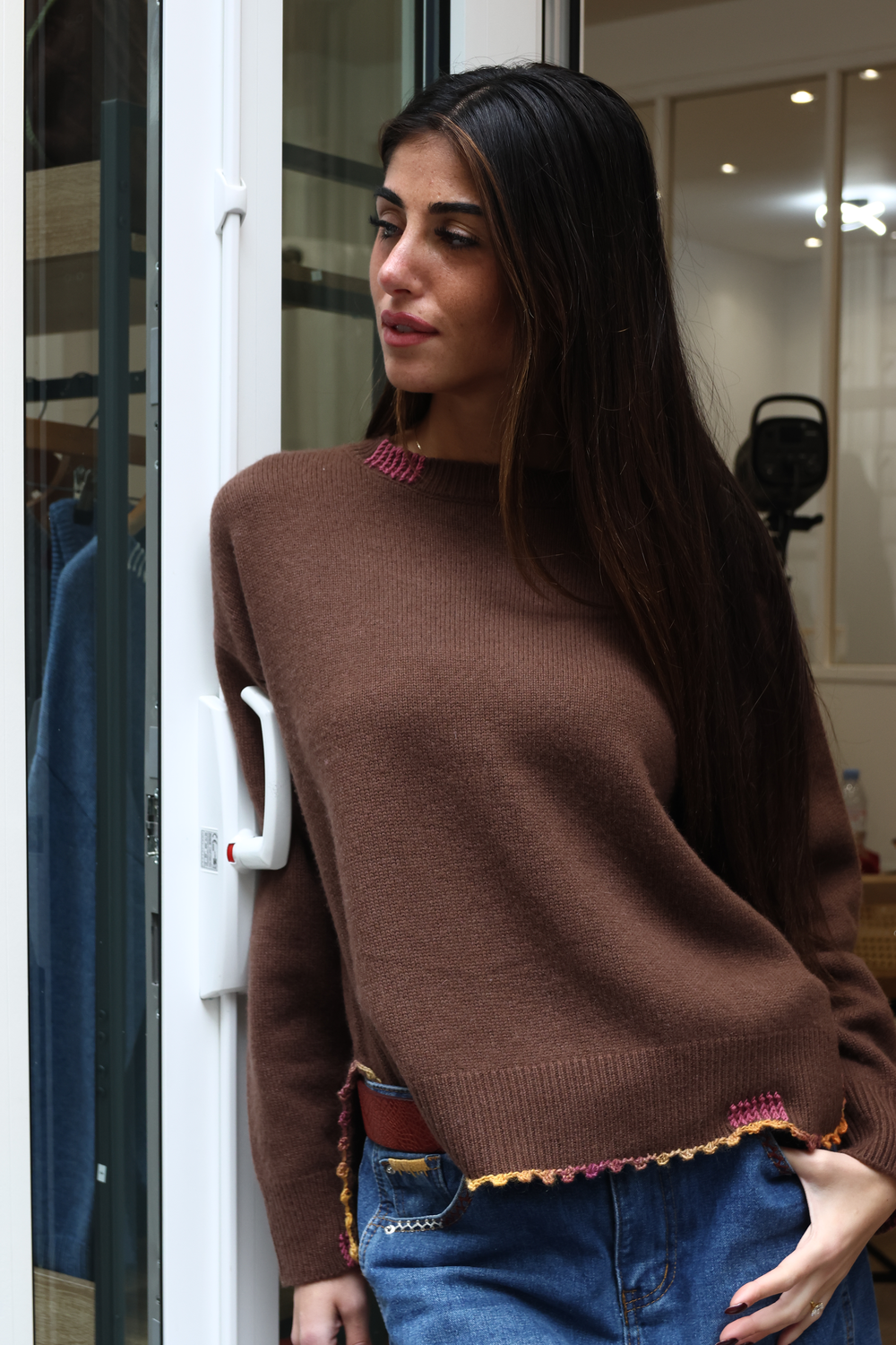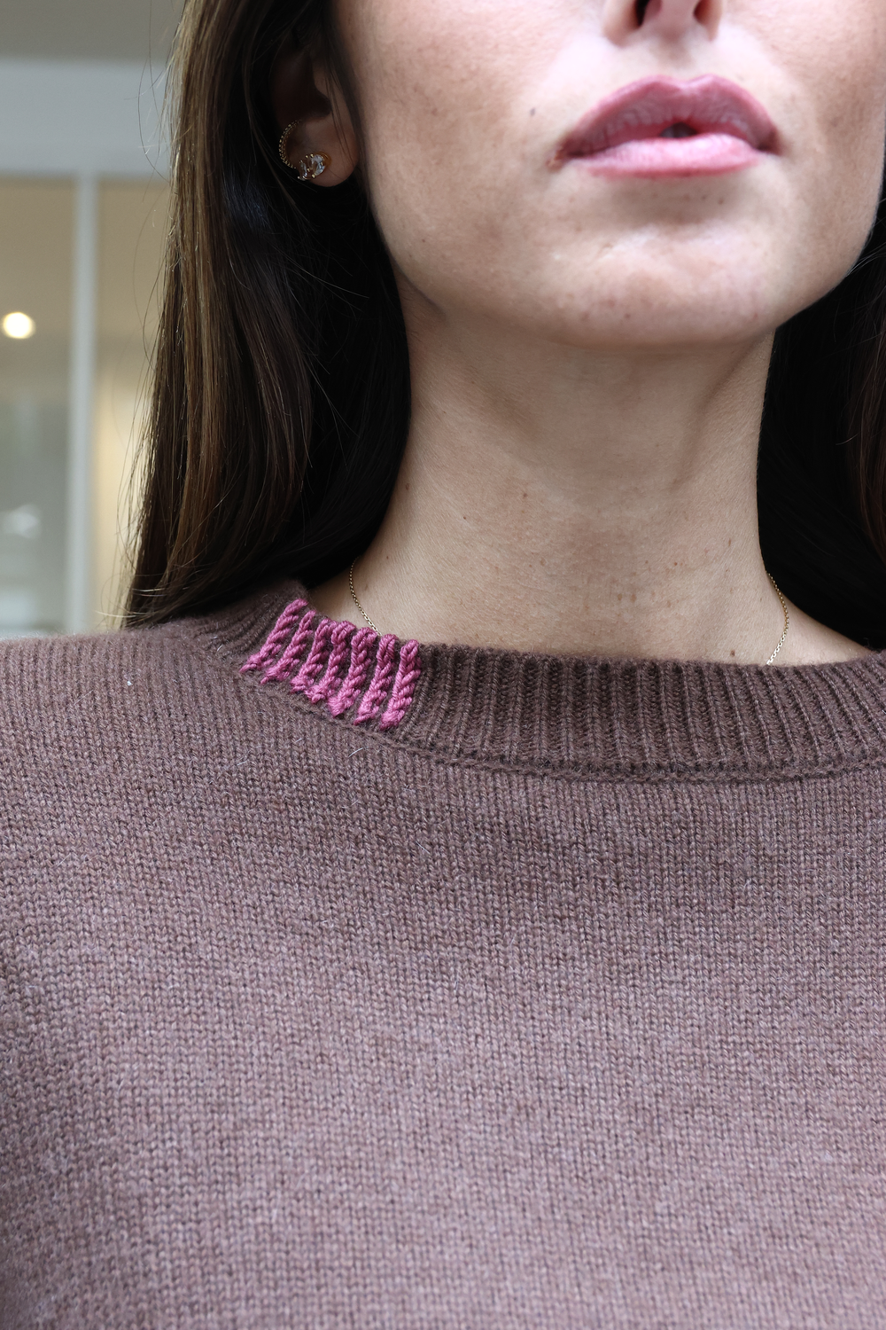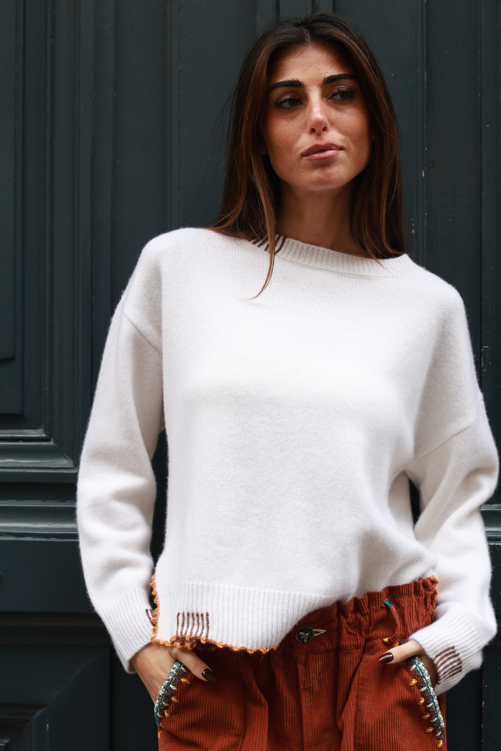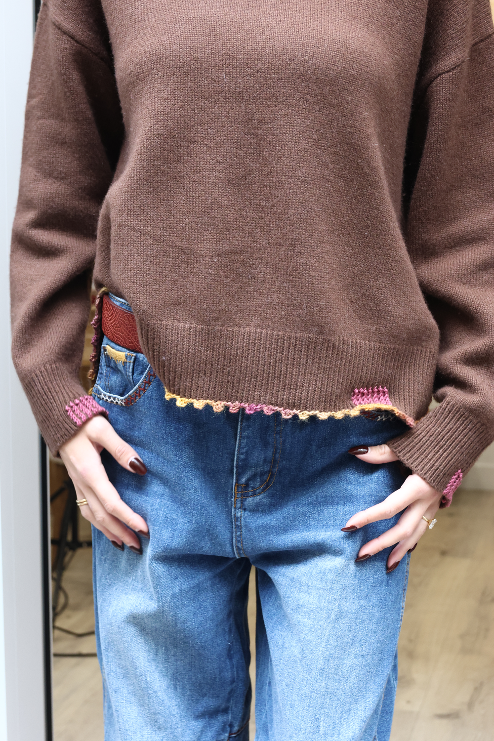 Pull en cachemire, disponible en différents coloris, avec détails au crochet.
