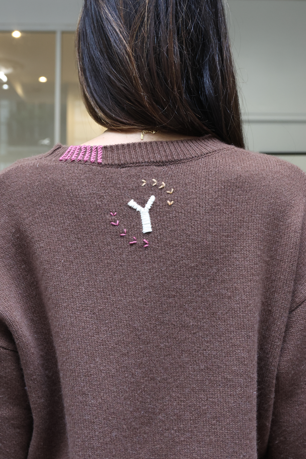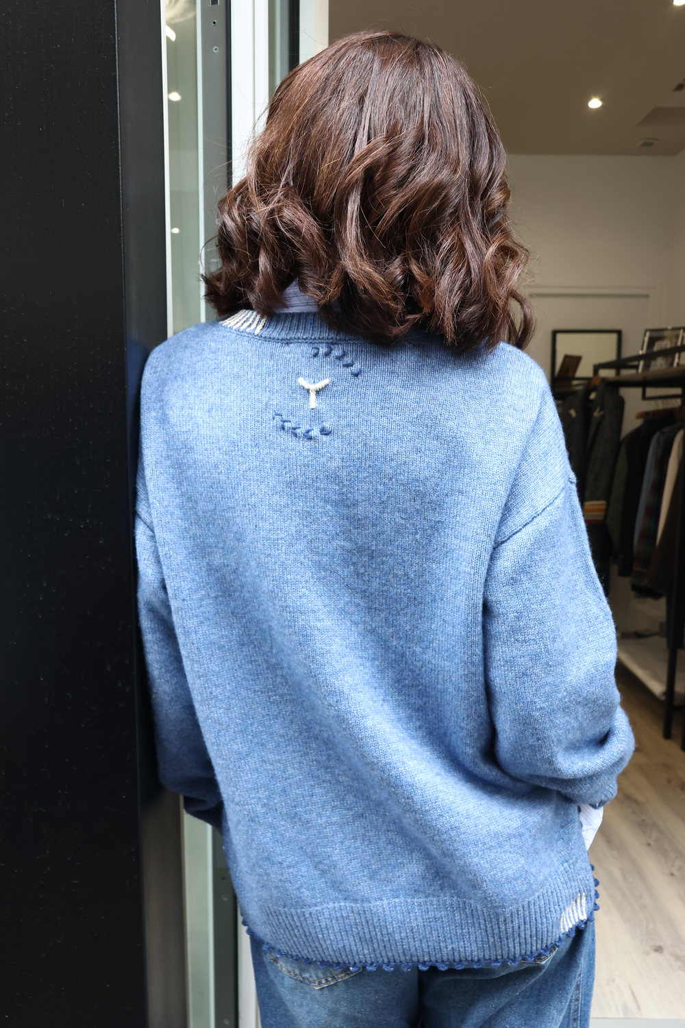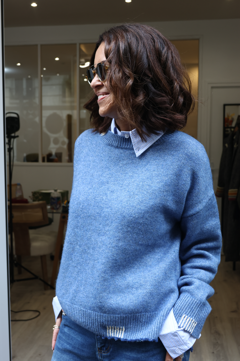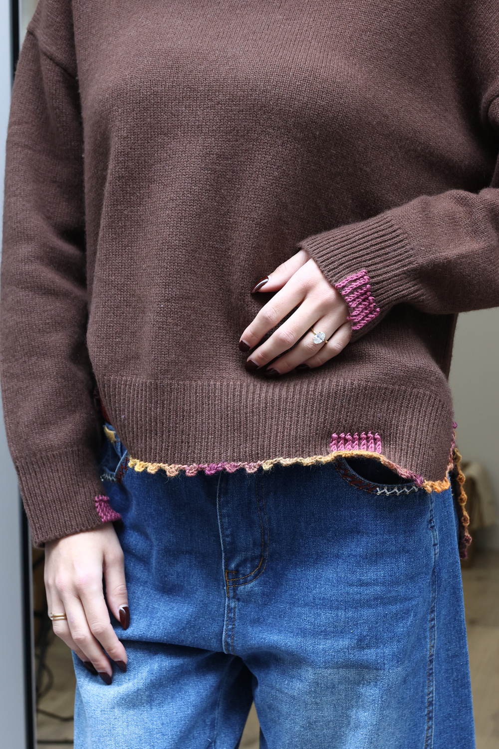 Pull en cachemire, disponible en différents coloris, avec détails au crochet.