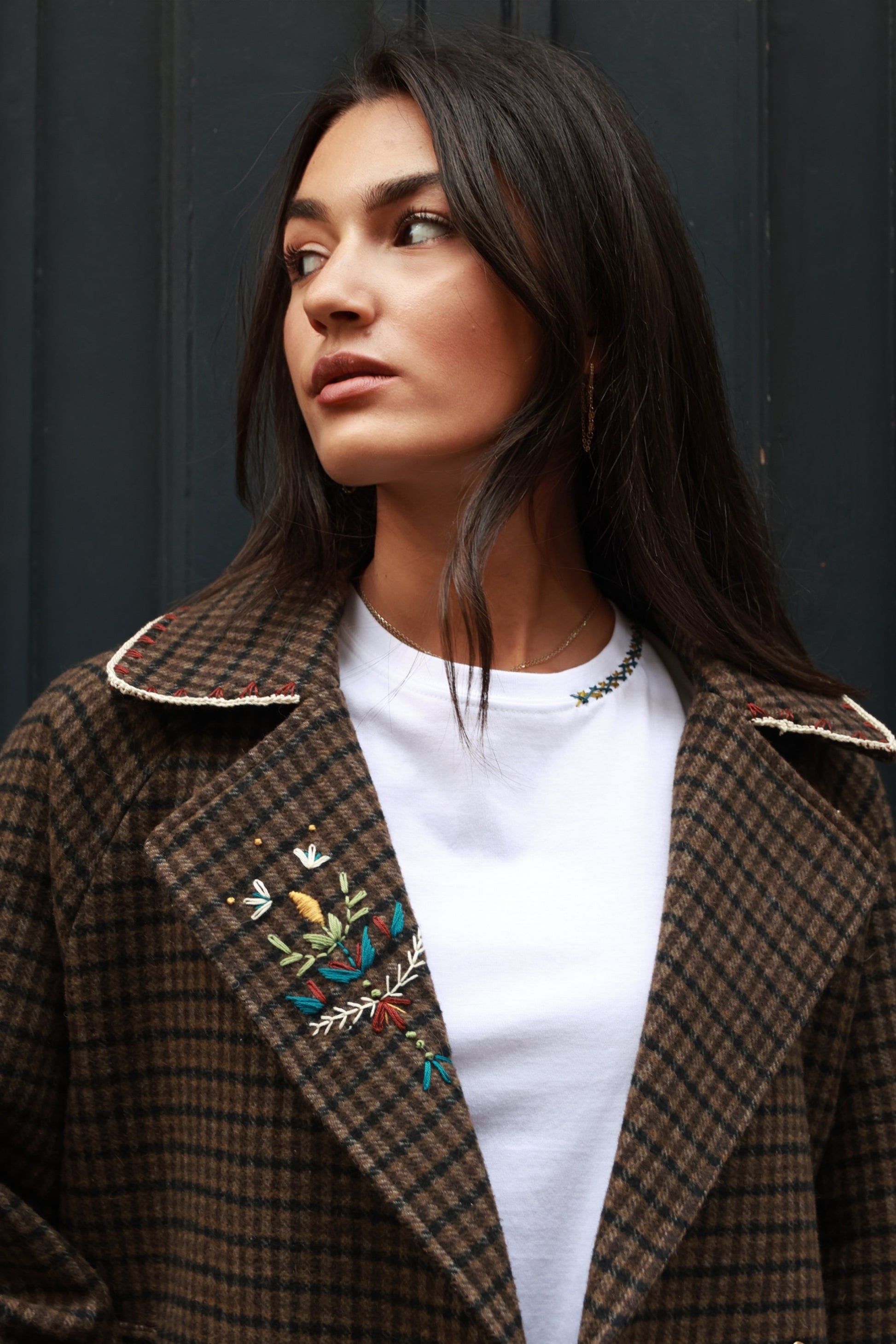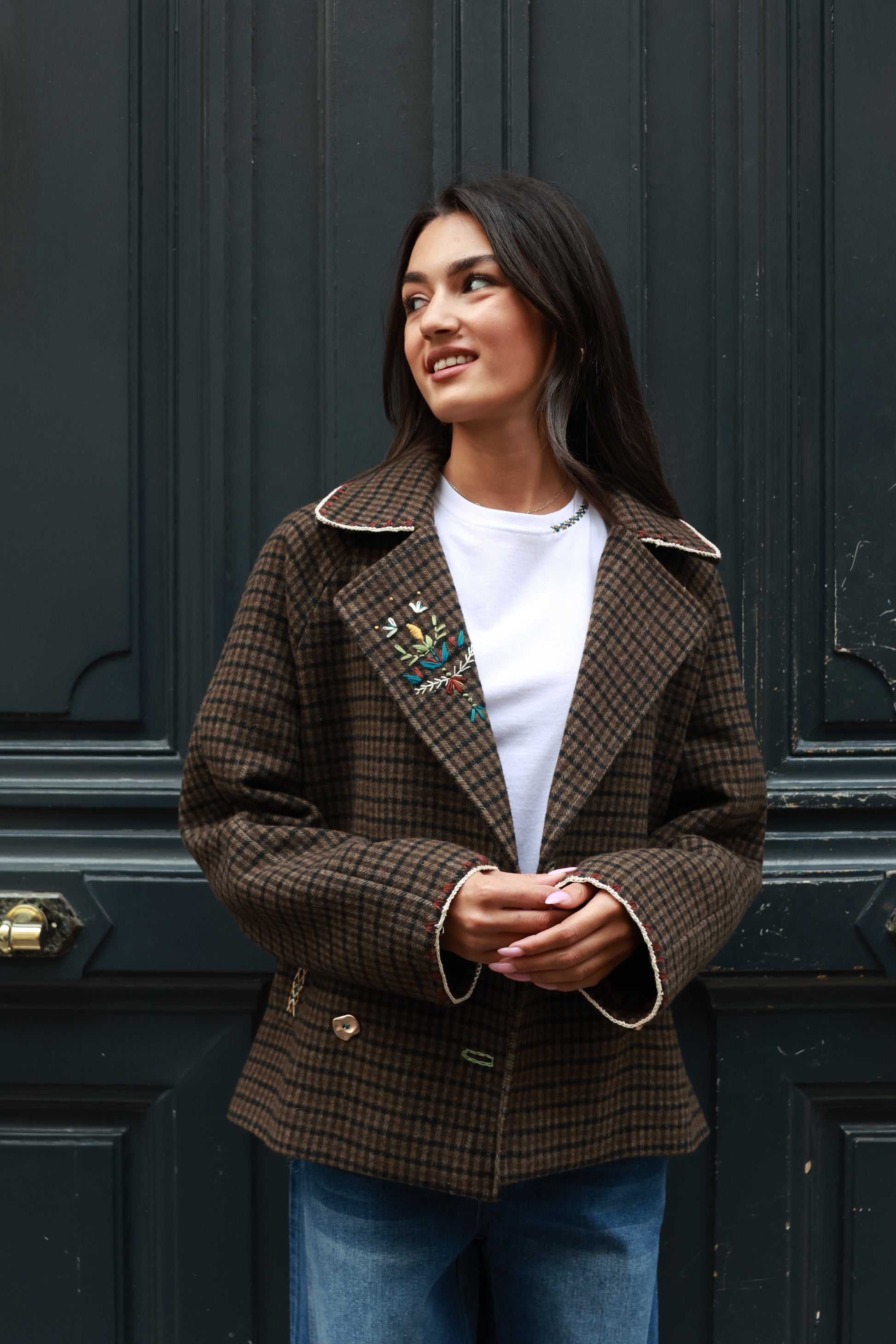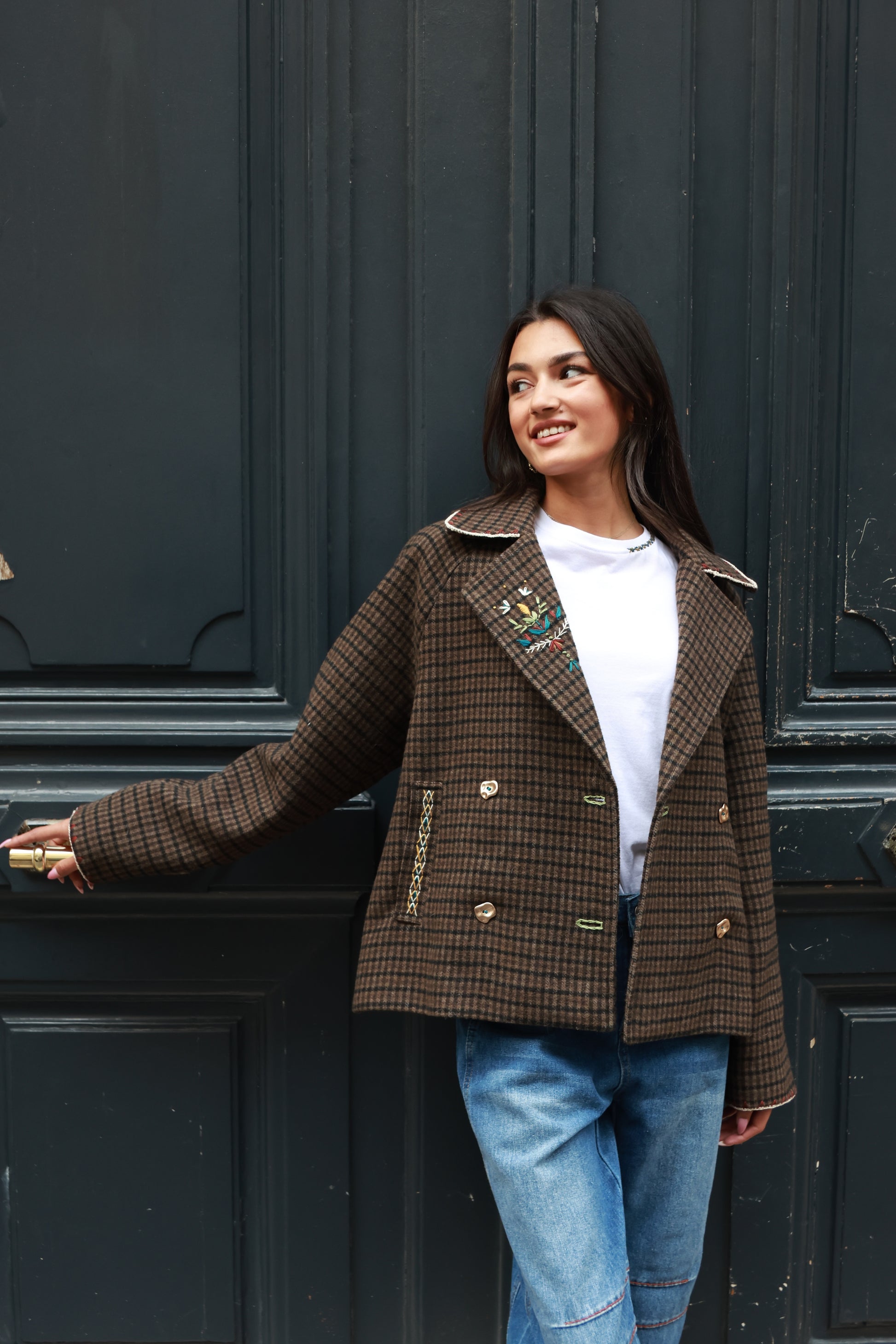 Veste, pièce unique, mêlant broderie et crochet.