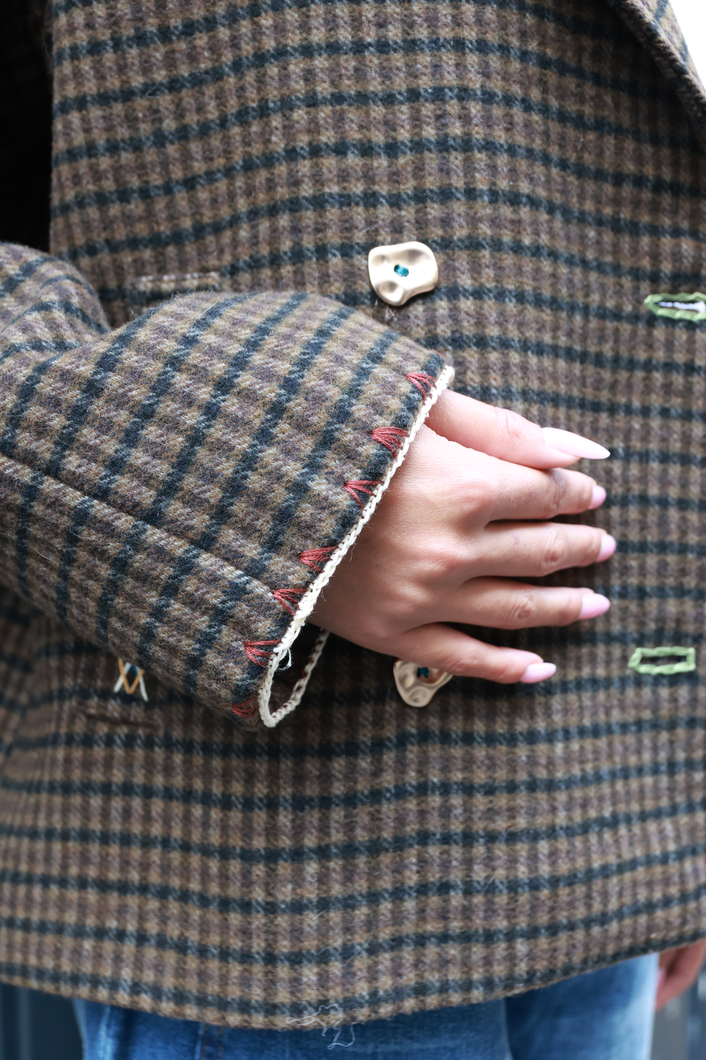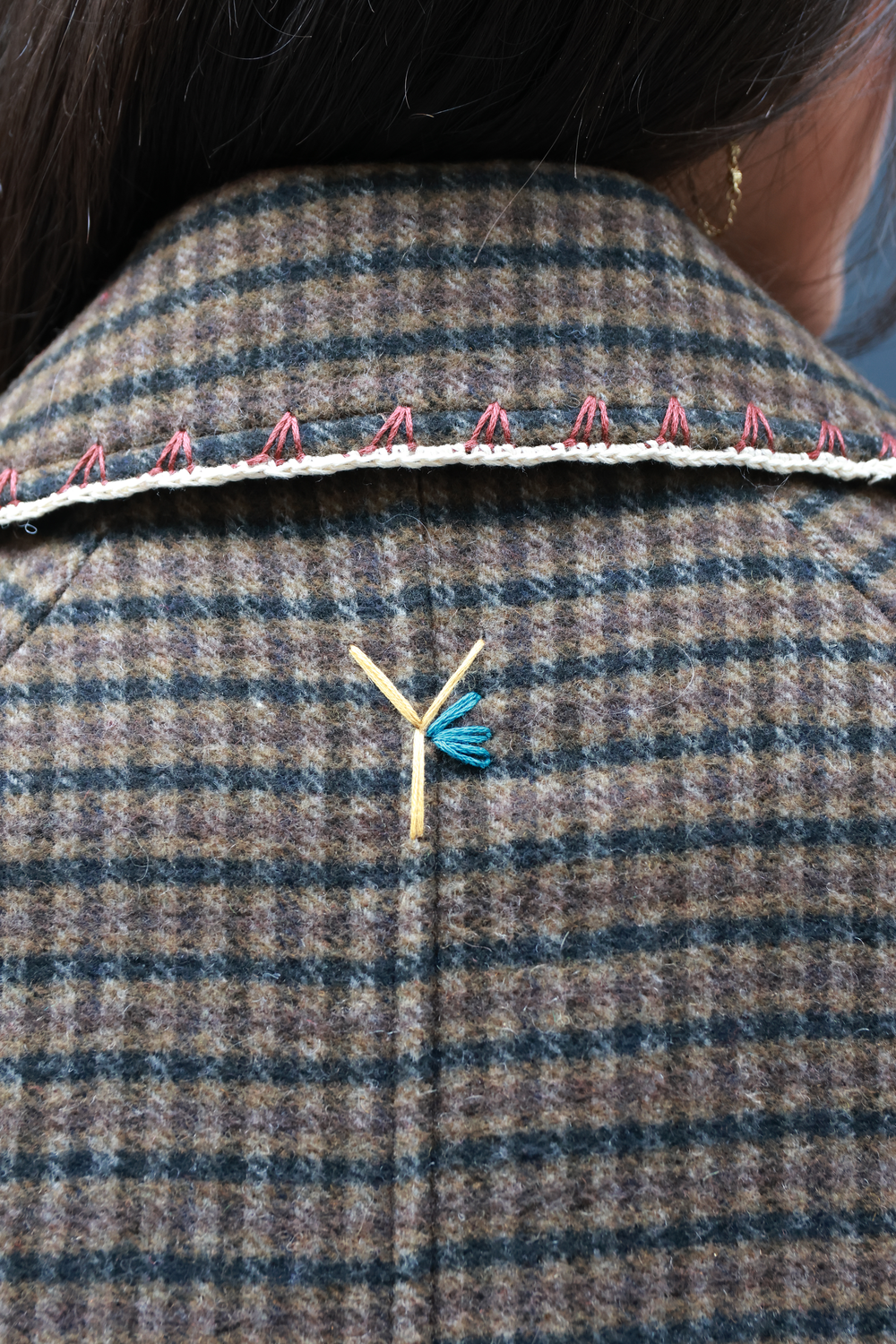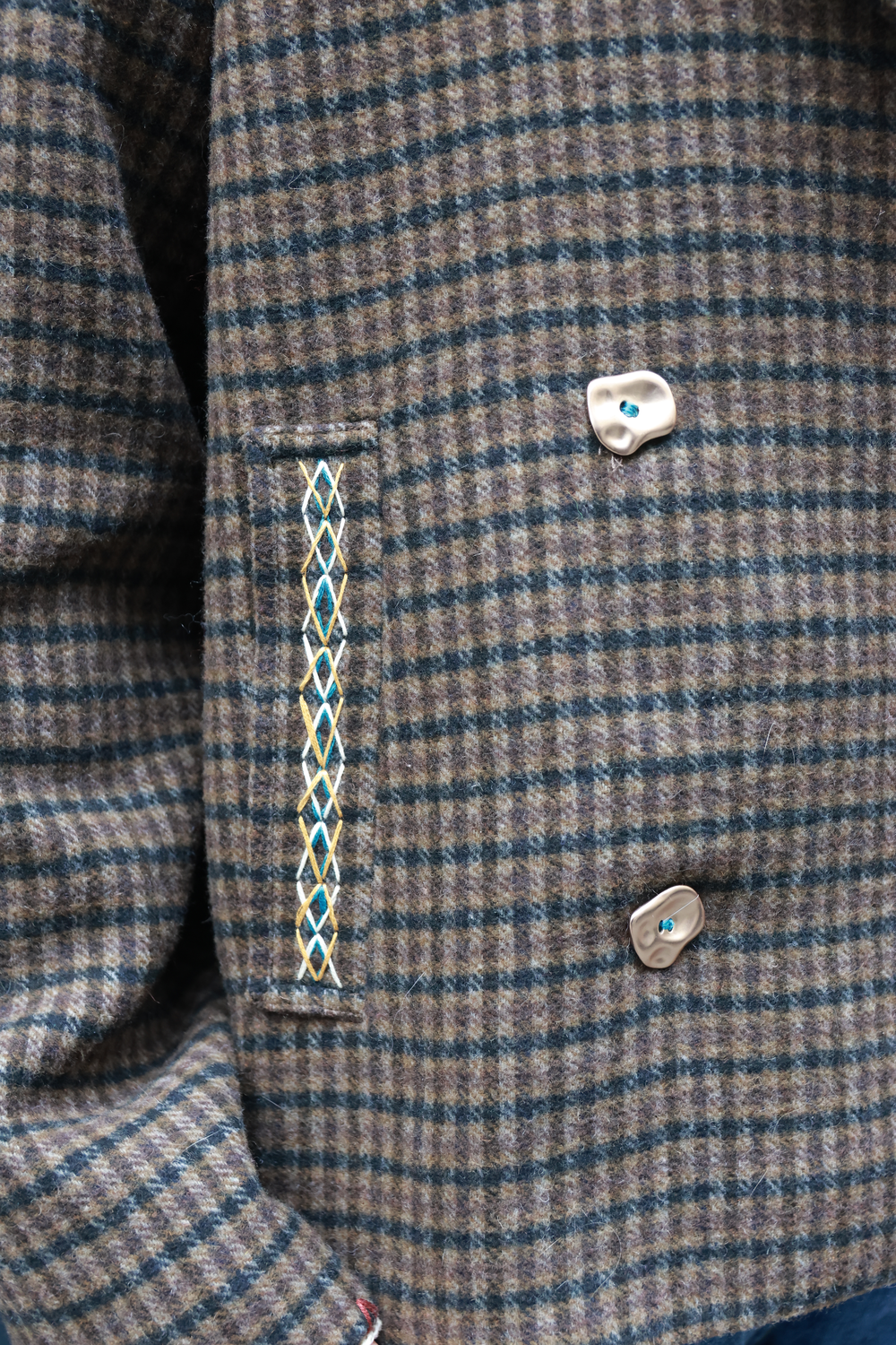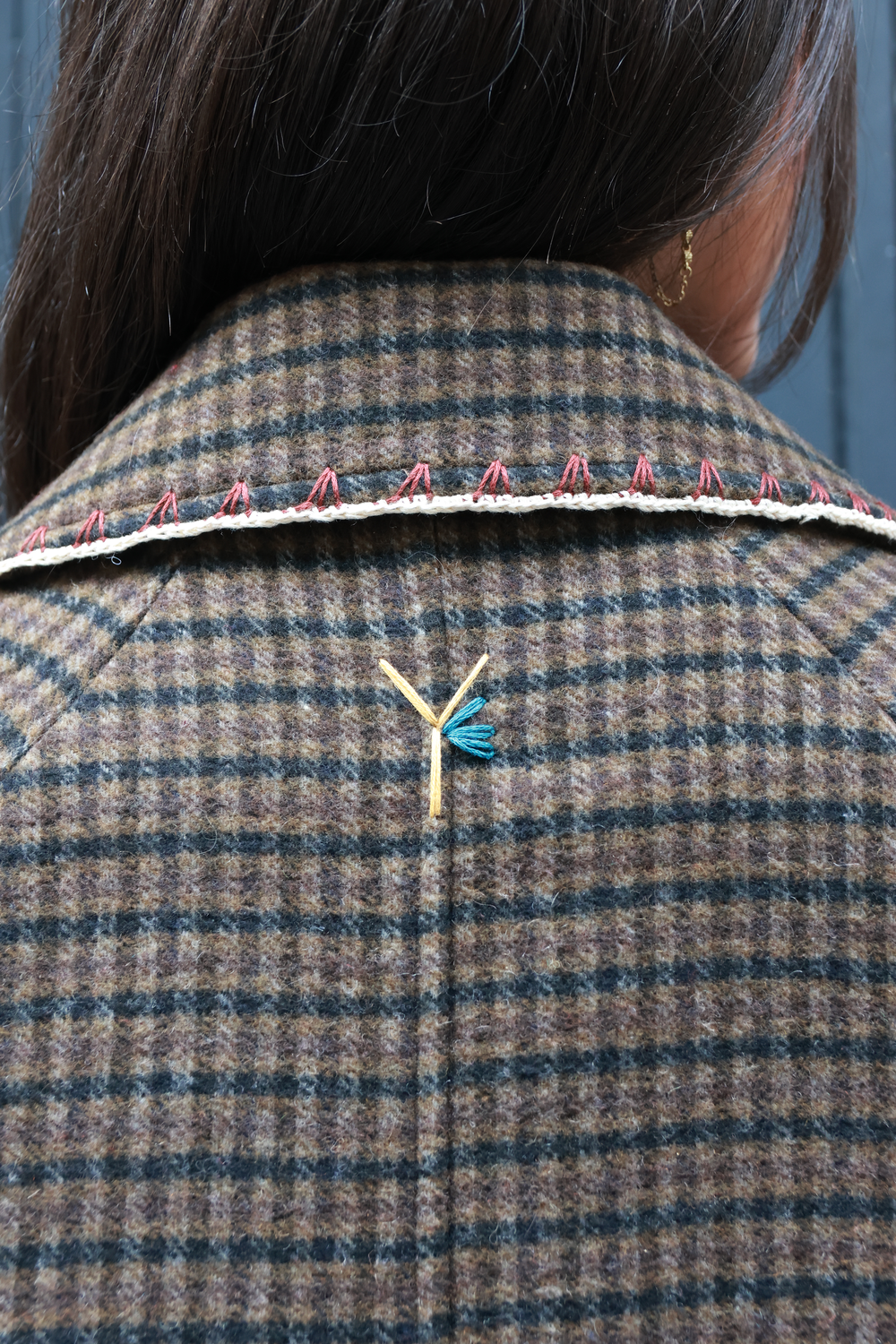 Veste, pièce unique, mêlant broderie et crochet.