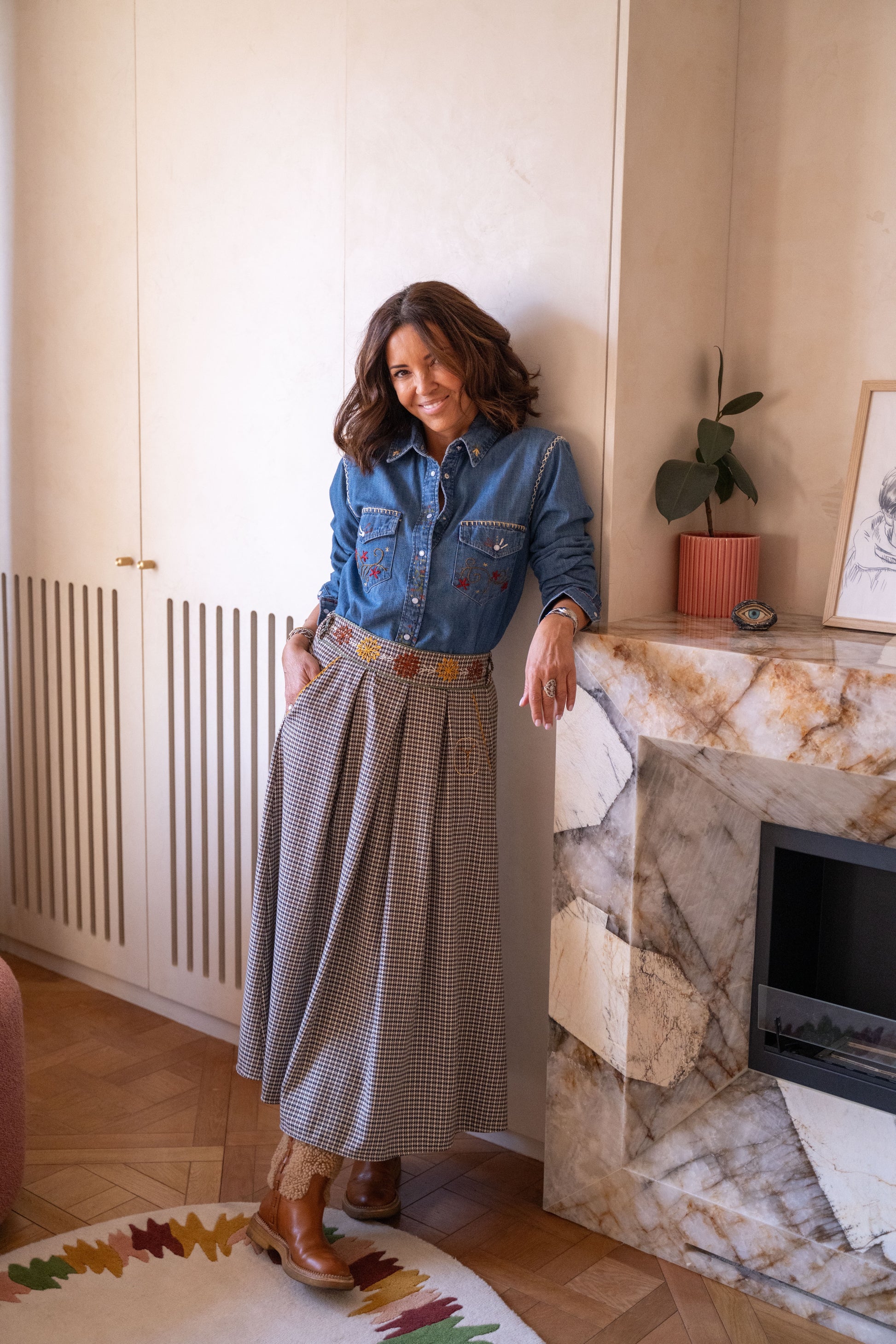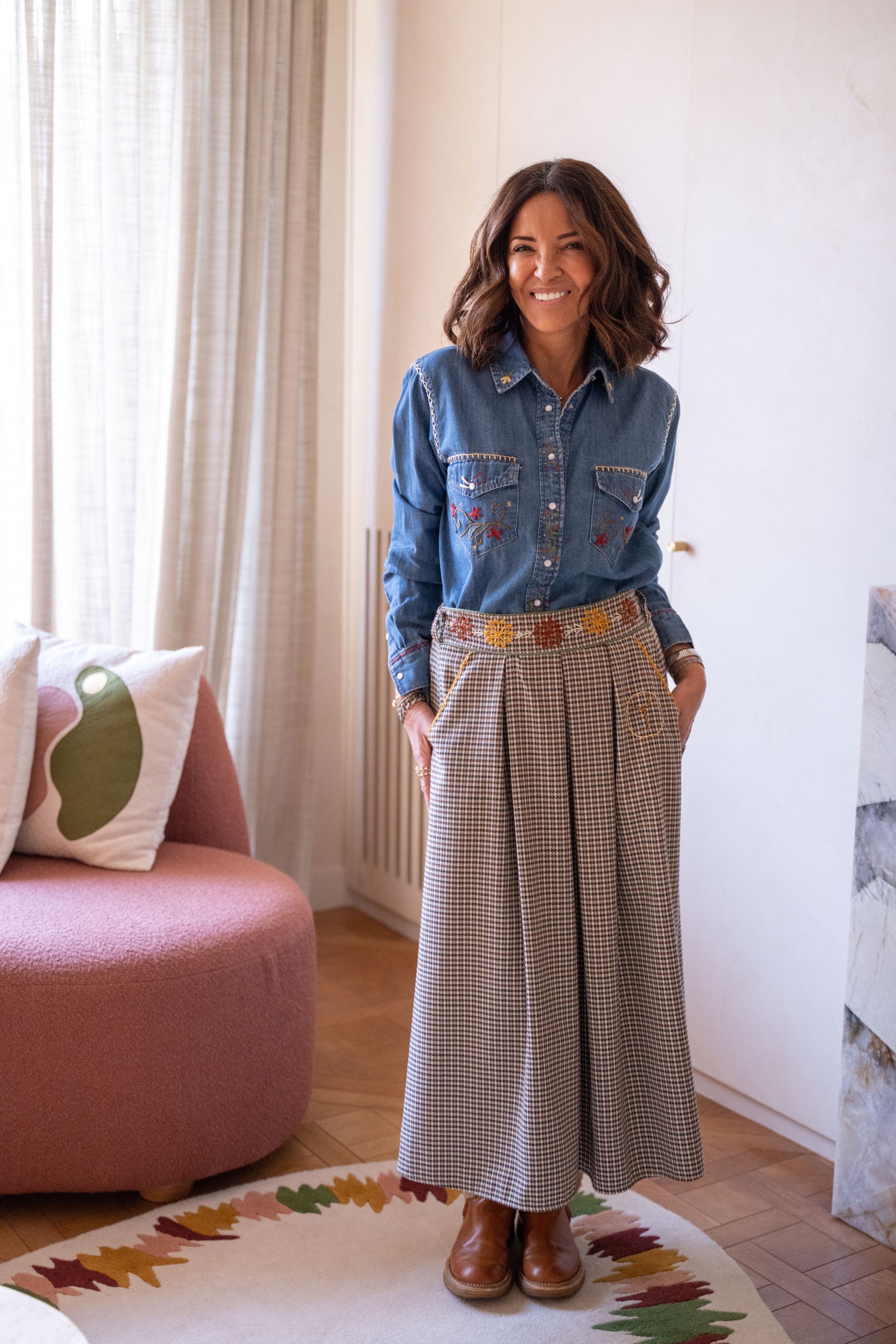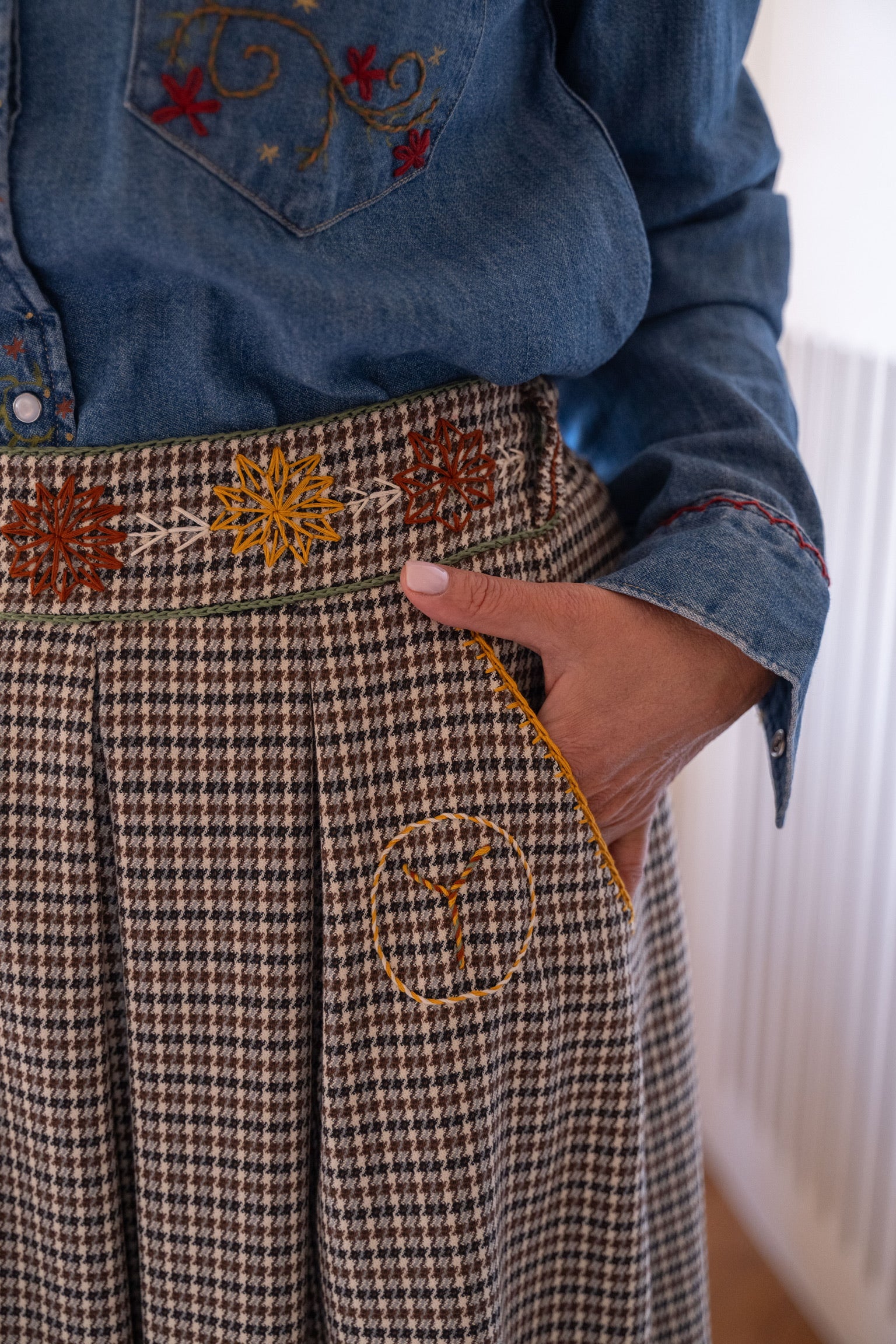 Jupe fluide beige à motif pied-de-poule, réhaussée de broderies contrastées sur la ceinture et le côté. Une pièce élégante et confortable, avec une taille élastiquée à l’arrière pour un maintien parfait. Détail brodé jaune/marron sur la poche pour une touche signature.