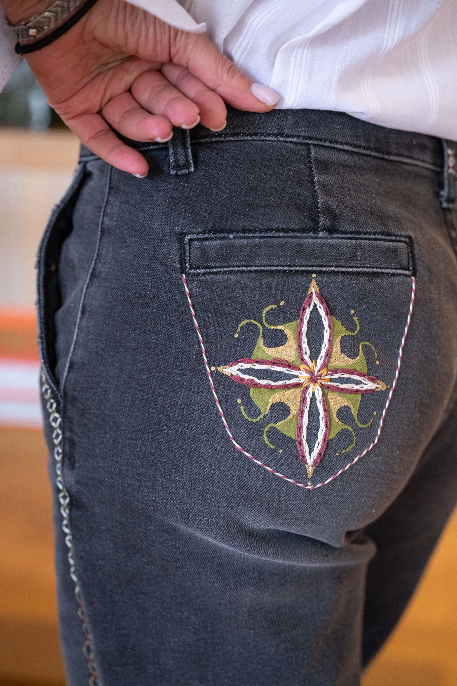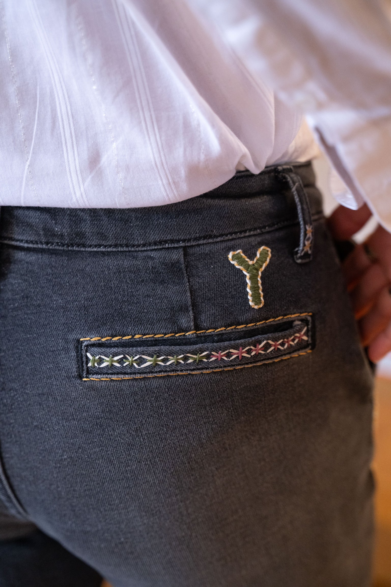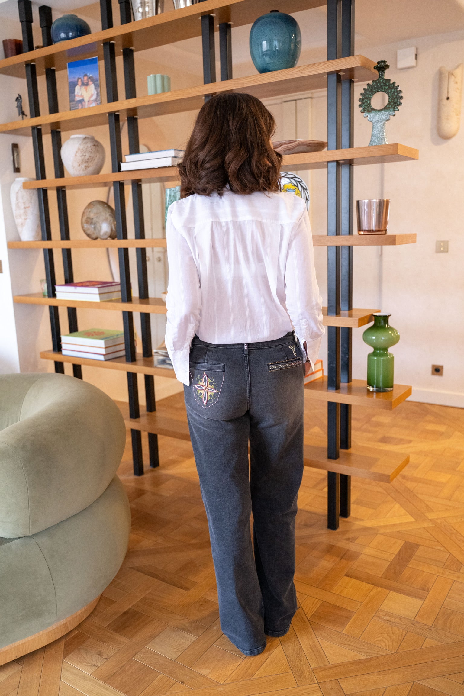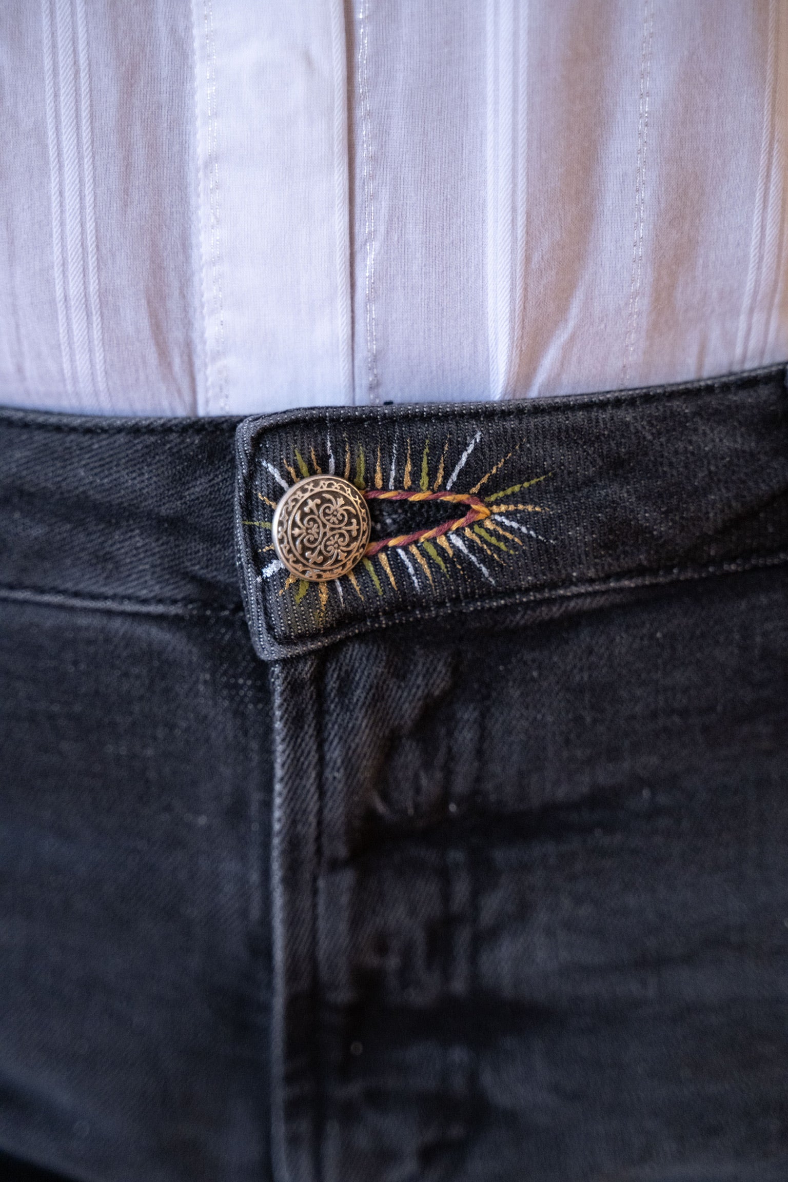 Jean noir coupe droite, revisité avec un mélange de broderie et de peinture textile. Des détails colorés habillent les poches, le bouton et l’une des poches arrière, tandis qu’un motif travaillé apporte une touche graphique au dos. Un denim structuré, moderne et facile à associer au quotidien.