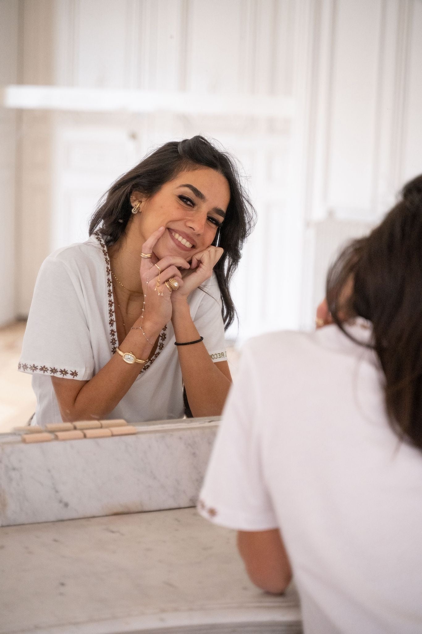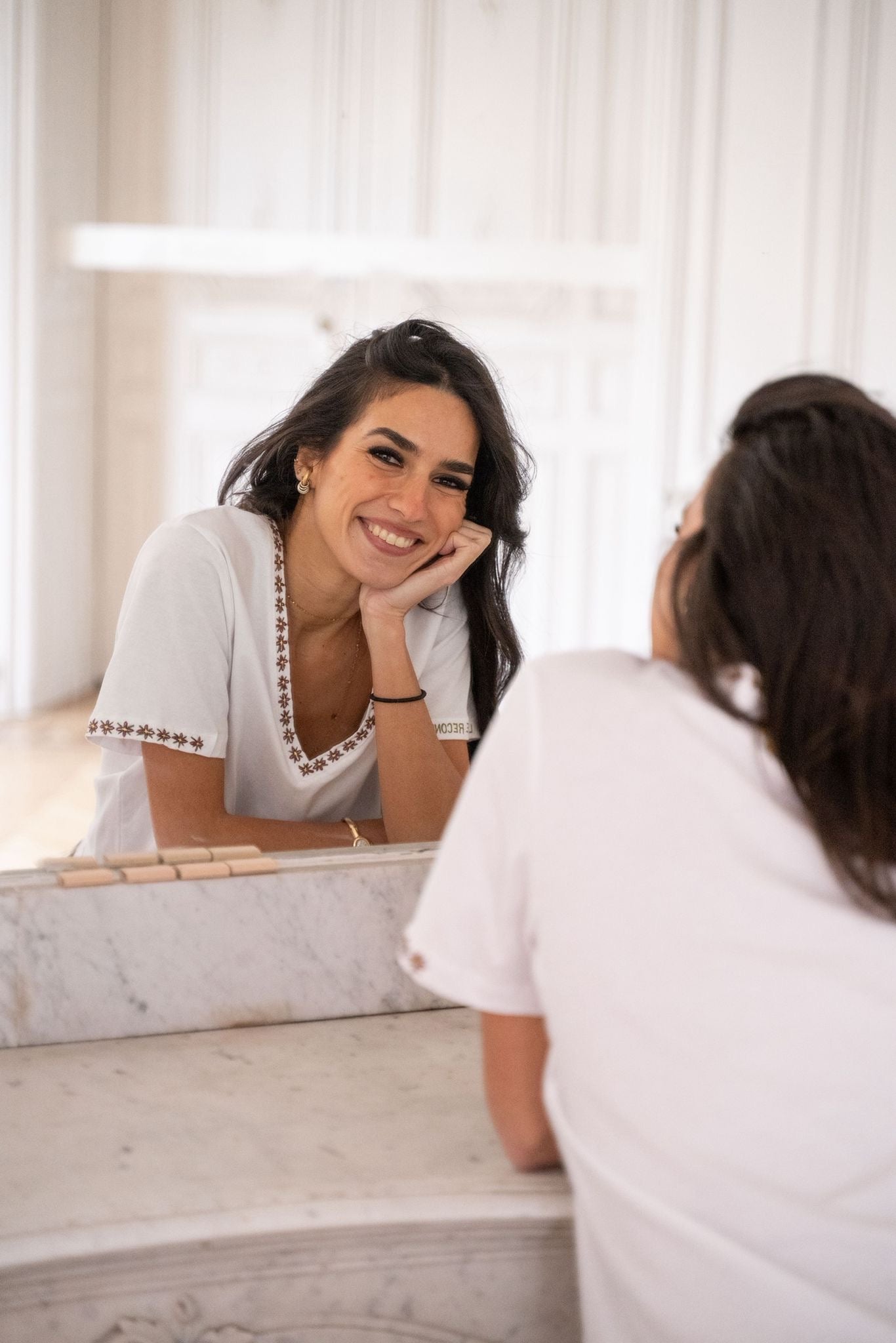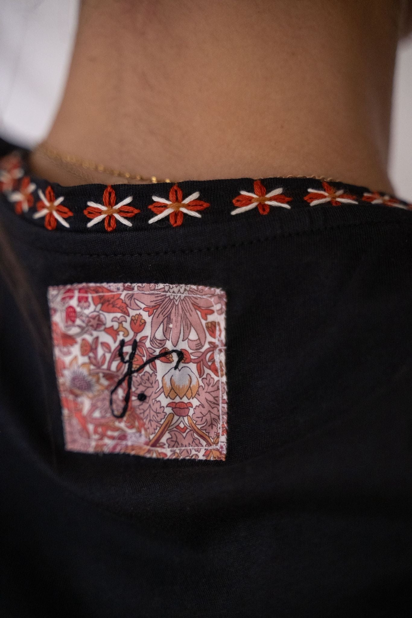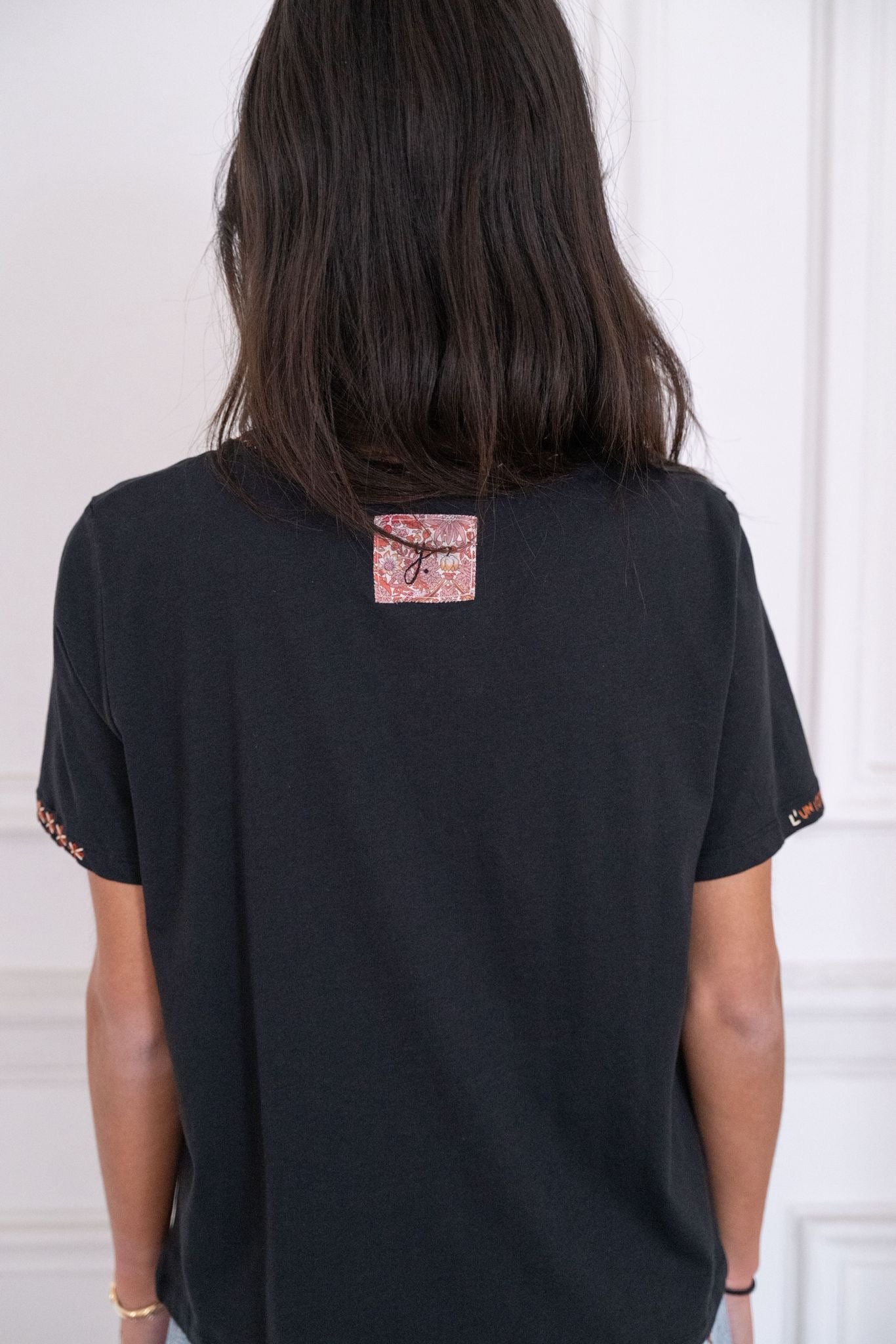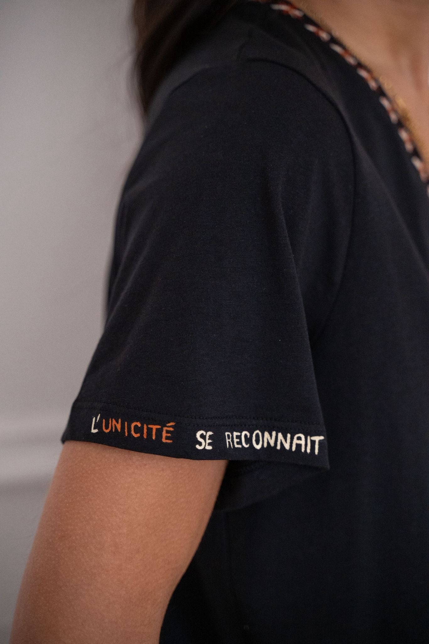 T-shirt à col V, à la coupe fluide et confortable, décliné en noir et blanc. Il est sublimé par un travail de broderie et de peinture textile réalisé à la main à Paris, délicatement posé le long de l’encolure et des manches. Une pièce essentielle revisitée avec subtilité, facile à porter au quotidien.